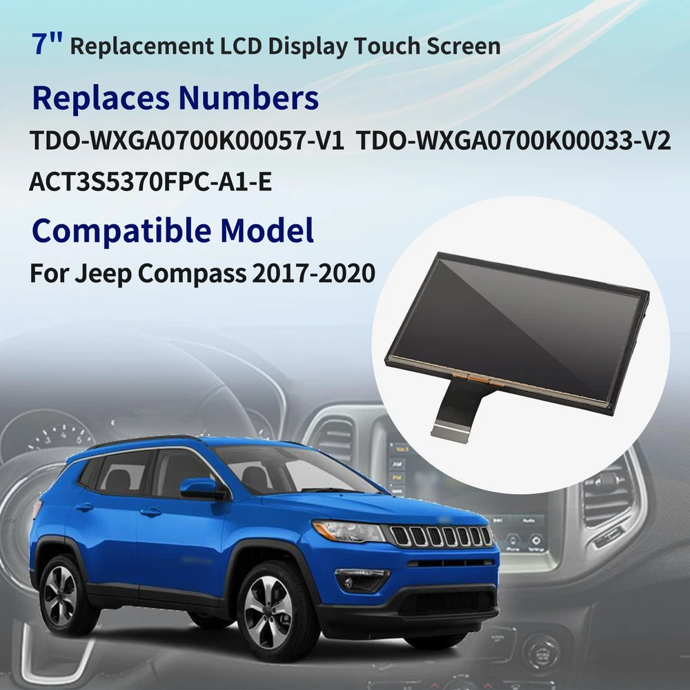 Replacement Part Number: TDO-WXGA0700K00033-V2, TDO-WXGA0700K00057-V1, ACT3S5370FPC-A1-E. Fitment: For Jeep Compass 2017 2018 2019 2020 Features: 100% Brand New LCD screen with touch screen Direct replacement for proper fit and function every time Quality parts same as OE performance Easy to install Package: 1 * Navigation LCD Display With Touch Screen