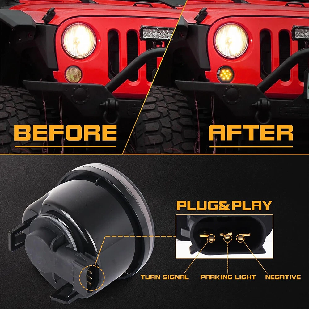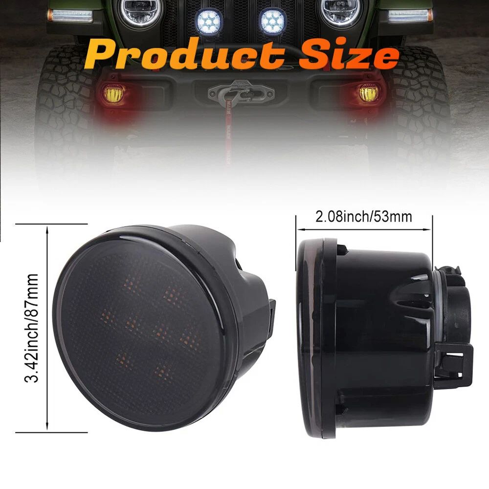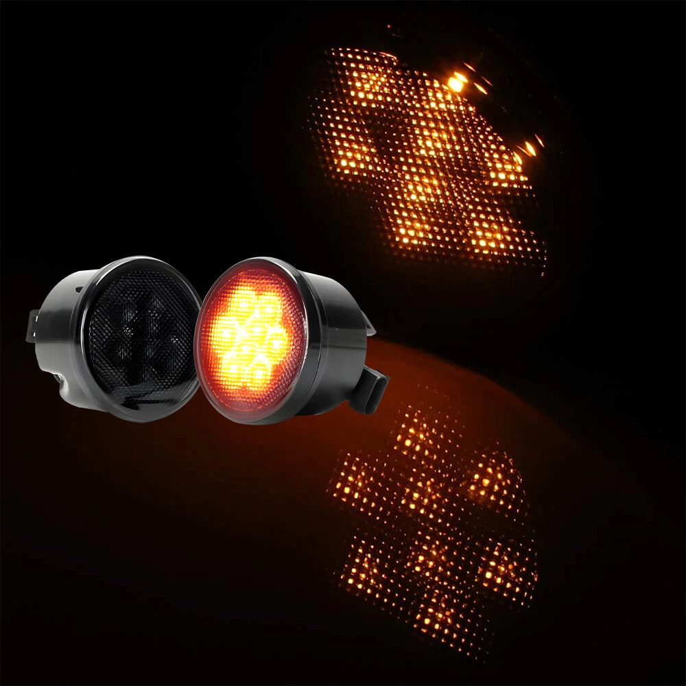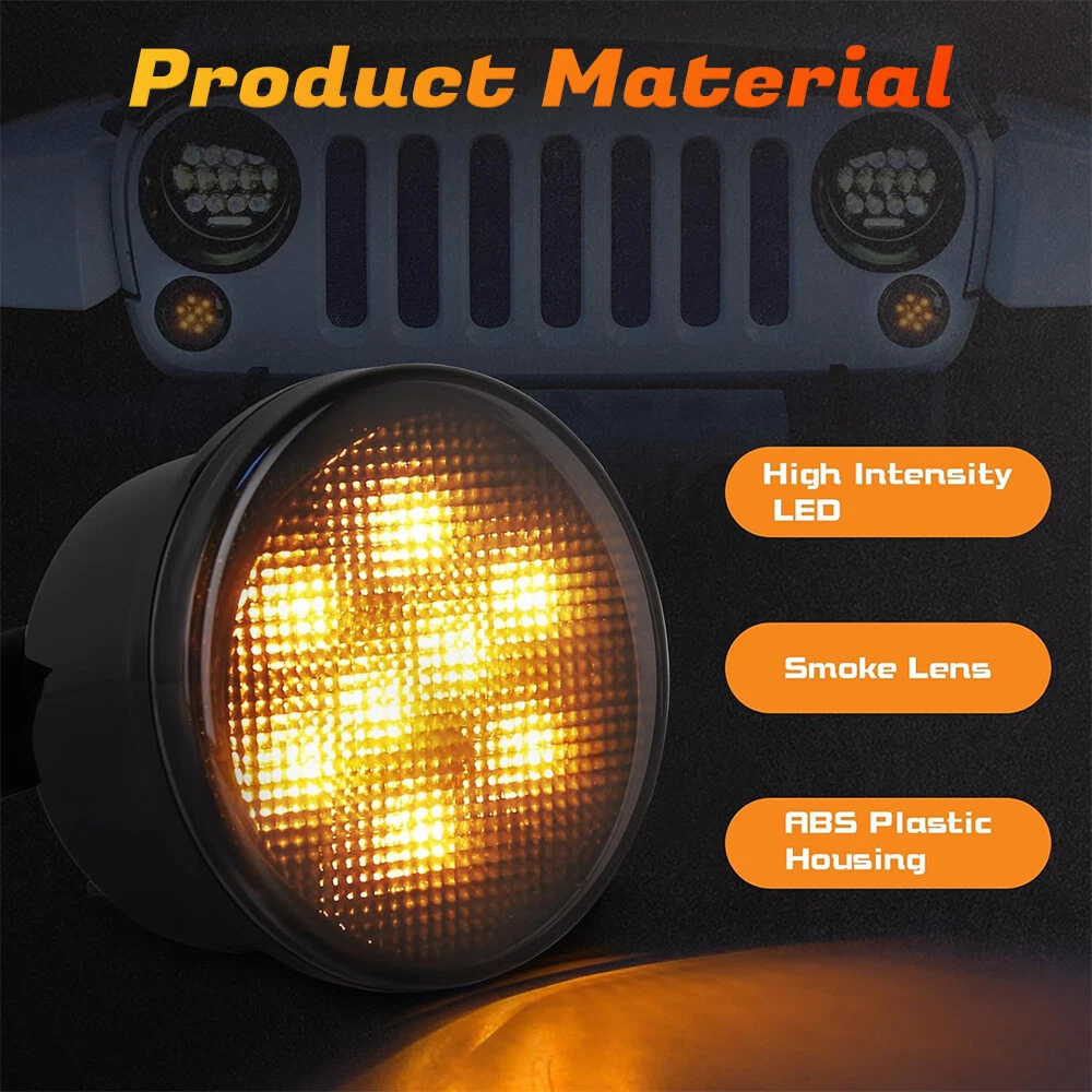 Spe cificatio n: Voltage: DC12V Power: 0.1W*8 Lamp beads: LED Color temperature: 2000K (yellow) Material: ABS injection molding Service life: 50,000 hours Applicable models: Wrangler Installation location: center grille turn signal Product size: 88*72*88mm Fits: for Jeep Wrangler JK JKU 2007-2018 (2/4 Door, Unlimited, Rubicon, Sahara, Sport) Features: Simple design enhances your car's exterior look. High Quality, Waterproof IP67. Super bright,faster on/off response time for Driving Safety. Direct Plug & Play, Usually in 15 minutes or less. Low Power Consumption, Life Span: 80000Hrs. Low Voltage Protectio n, High precision Constant Current Driver Chip. Turn Signal Lights Smoke Lens for Jeep Wrangler JK are Dramatically Improve Style and Perform ance. 3D Lens Design with faster on/off Response.
