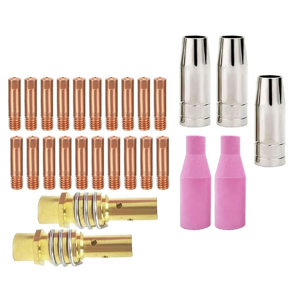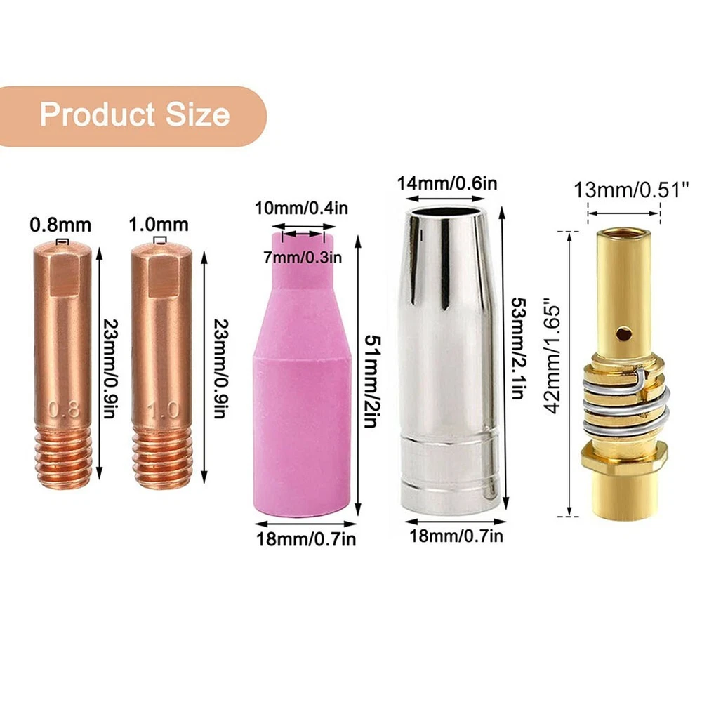 For MIG Welding Torch Nozzle Kit 27PCS for AK15 For MB15 Compatible Parts DESCRIPTION Features: *Compatibility: This product is designed to be compatible for MIG for MAG welding torches for AK15, for MB15, and for 14AK, as well as for HITBOX welding machines including for MIG200, for MIG250, for MT2000, and for HBM1200. *Quality Materials: The torch accessory is constructed from good-quality metal and copper, providing excellent heat resistance for long-lasting use. *Easy Installation: The components can be easily assembled on the burner without the need for special tools, making installation straightforward, convenient, and quick for users. *Good Components: The accessories offer outstanding thermal properties, with high temperature resistance. Their strong texture ensures a long service life, effectively meeting work demands and facilitating smoother operations. *Package Contents: The package includes 10 contact tips (0.8mm/ 0.030"), 10 contact tips (1.0mm/0.039"), 3 gas nozzles, 2 earthenware nozzles and 2 Contact Tip Holders providing a comprehensive set of tools for various welding applications. Specifications: Part Name: Welding Torch Nozzles Kit Material: Metal,Earthenware Size: Standard Color: Pink,Silver,Copper Package Content: 10 x contact tips (0.8mm/ 0.030") 10 x contact tips (1.0mm/0.039") 3 x gas nozzles 2 x earthenware nozzles 2 x Contact Tip Holders Note: 1. The real color of the item may be slightly different from the pictures shown on website caused by many factors such as brightness of your monitor and light brightness. 2. Please allow slight manual measurement deviation for the data. POLICES Shipping Payment WARRANTY We only ship to confirmed ebay Order addresses. Please comfirm that your Order address is in line with your shipping address. Please kindly note that the c ombined shipping is not provided because the shipping fee is calculated by weight. Also, the each additional item means exactly the the same color and size. It takes about 7 -15 working days to US; about 10-30 working days to other countries. Transit time may be a little delayed because of the bad weather and customs inspection . If you do not receive your item within 30 working days since payment finished, please contact us immediately for further assistance. Payment must be completed within 5 days. If you have any problems about payment, please contact us via ebay message. We strive for 100% customer satisfaction! Positive Feedback is very important to us. If you have any questions, p lease feel free to contact us via "Ask seller a question" . We will reply your email within 24 working hours. On Dec 6, 2024 at 15:03:33 PST, seller added the following information: