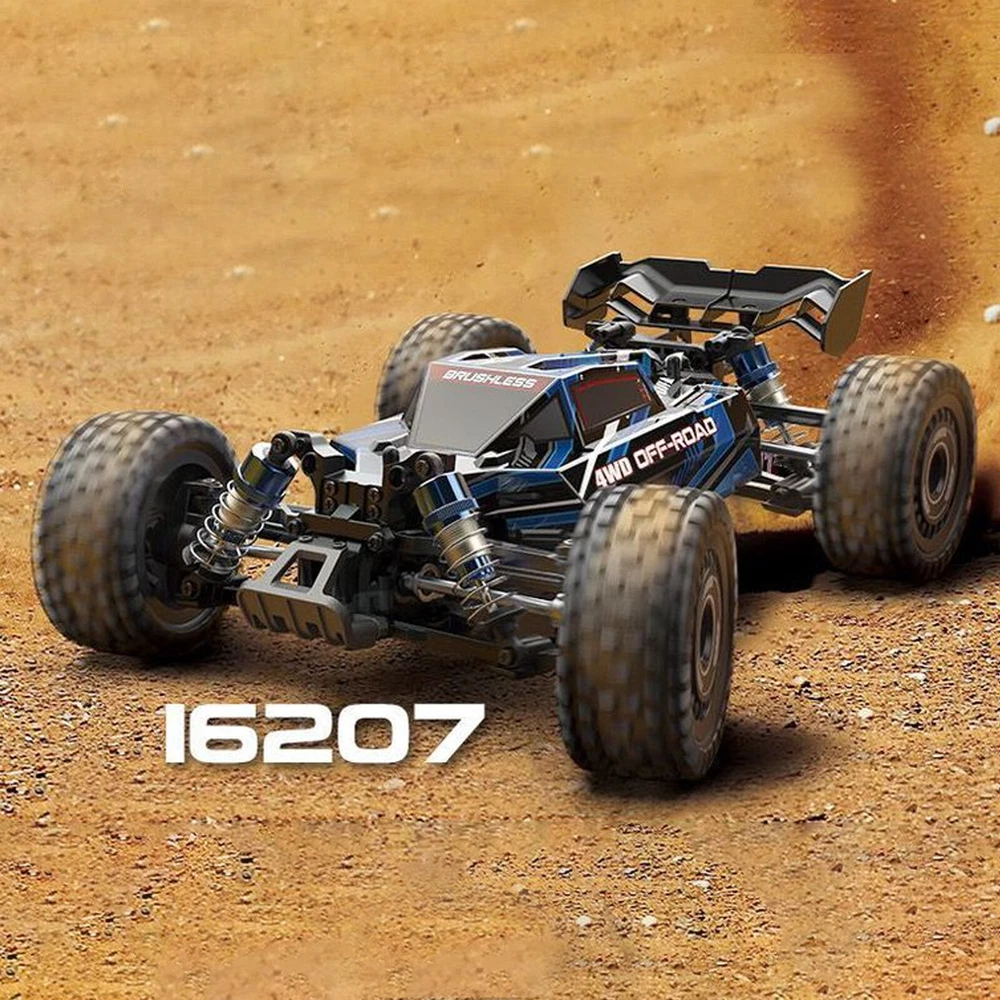 Features: 1. All-metal hydraulic shock absorber; 2. Standard 3S battery 65km/h 3. 45A independent brushless ESC + 2845 four-pole brushless motor; 4. Metal anti-collision head; 5. All-metal transmission system (metal gear differential); 6. Standard independent receiver, easy to modify. " Basic parameters : Product model : 16207 body color : blue Scale : 1/16 Maximum speed : 62km/h Remote control distance : 45m Maximum use time : 12.5min Charging time : 3h (using 5V 2A charger) Charging method : USB charging cable Wheelbase (mm) : 175mm Wheel base (mm) : 182mm Tire diameter (mm) : 77mm Vehicle weight : 1030g configure: Motor Specifications : Brushless Motor Motor cooling aluminum heat sink + fan ESC 45A brushless ESC (metal heat sink) Servo specification : 17g digital servo Remote control : 2.4G Remote control battery : AA*2 Battery Specifications : 11.1V 1050mAh 25C packing list: Car body (remote control)*1 battery*1; rear wing*1; Manual*1; USB charging cable*1; Hexagon wrench*1; Head-up wheel accessories*1; Screwdriver*1