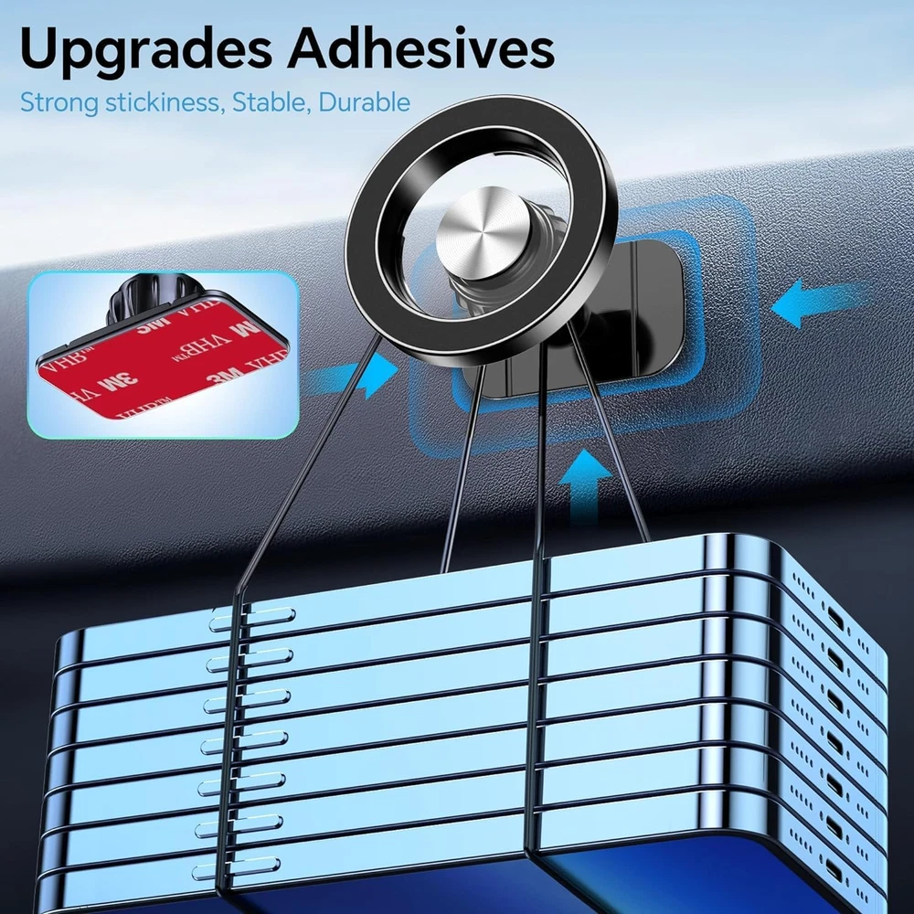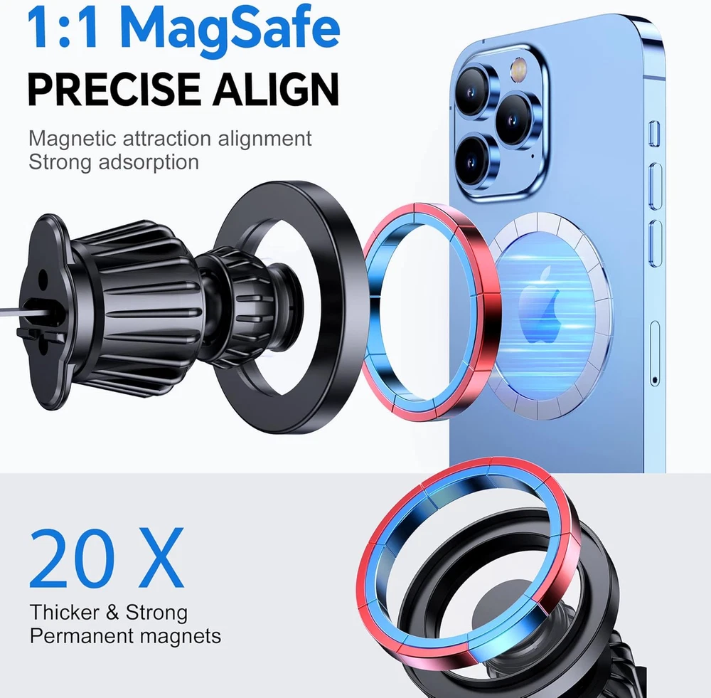 ✅【Designed for Magsafe】 - The most fashionable iphone car mount in 2024 Magsafe is designed for iphone 16/15/14/13/12 Pro Max Mini and official Magsafe cases and other magnetic phone cases and can be fixed directly to these phones without the need to affix metal plates. All Android Phones Will Work: Metal rings are provided; they fit cases and other phones without magsafe ✅【STRONG MAGNETIC MagSafe Car Mount】 - This powerful magnetic phone holder can create a powerful attraction that firmly supports your device while allowing you to drive without distraction. it easily and securely holds your phone through bumps, sharp turns or even sudden stops, no worrying of dropping your phone. ✅【SUPER STICK FORCE】 - VHB adhesive provides strong stick force between the dashboard and the car phone holder, which can firmly stick to any plane in the car, fix your device, adapt to a variety of road conditions such as sudden braking, speed bump, and rugged mountain road. ✅【SAFE DRIVING VIEW】 - Mini-size, not taking up space, it is placed in the dashboard without blocking the view at all, and does not need to look down at the device to ensure your safe driving. ✅【360° FREE ROTATION】 - With an adjustable swivel ball joint, you can rotate your smartphone or device at your own will, providing the best viewing angle. Quickly pick and place with one hand, free your hands and make calls and GPS navigation more convenient Product Description Why choose this 2-in-1 magsafe car mount ? Flexible vent mounts or super-sticky adhesive mounts mean you can find the most stable, suitable and convenient mount for any car model.The most cost-effective and convenient option.Each installation model is the best design on the market! The super strong magnet can suck the cell phone in 1 second. Thus ensuring your driving safety! Two different bases can meet the needs of multiple scenarios 1.Adhesive Holder mounting mode: Solve the non-stick problem real dashboard car phone mounting pattern. Installation of beautiful, variable viewing angle, stylish and does not take up space in the car, easy to find everyone's favorite installation perspective 2.Car Vent Holder Mode: Easy to install and remove!Steel hook material, permanent use, not like plastic hooks that have breaking problems and need to be replaced often.1 steel hook is more durable than 15 plastic hooks! What You will Get How to use this product!?1. This MagSafe Car Mount can be used directly on the iPhone 14/13/12 series without case or Magsafe case !No need for additional metal rings! 2. Other cell phones or cases need to be glued to a product that comes with a metal ring in order to be used!