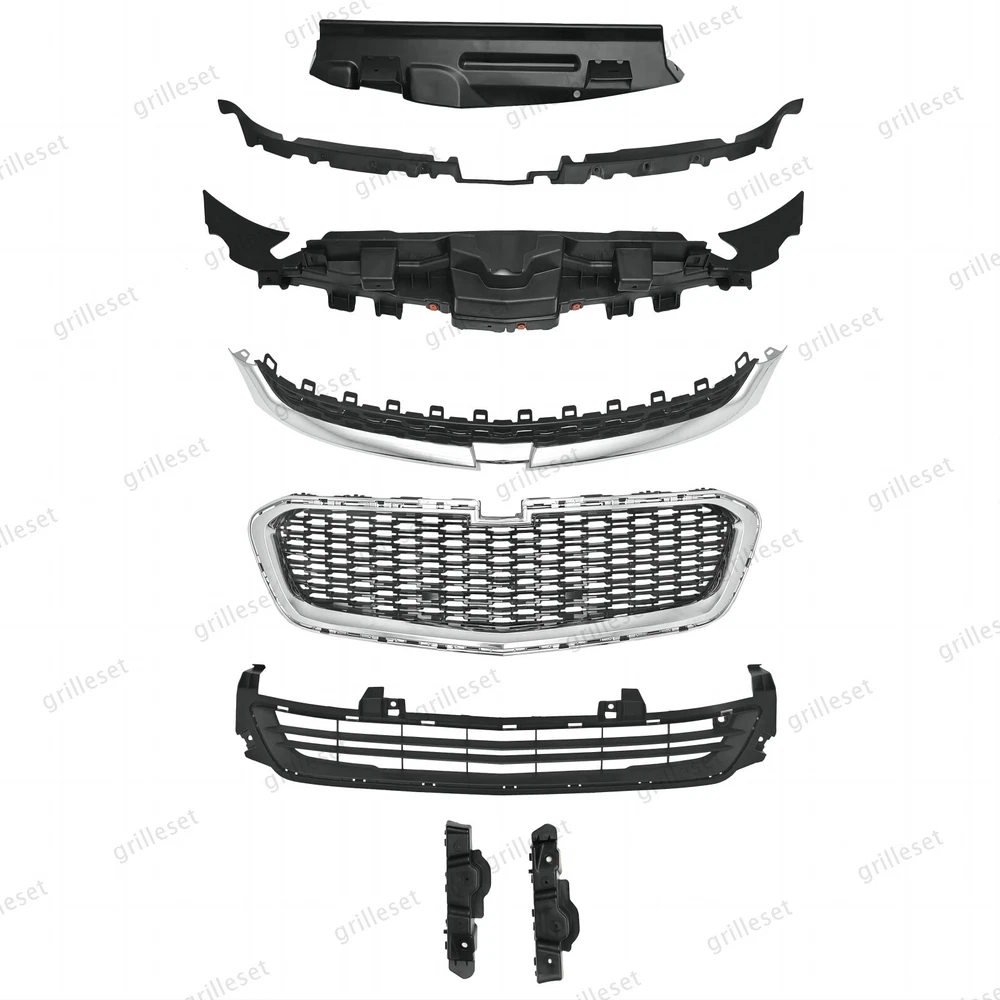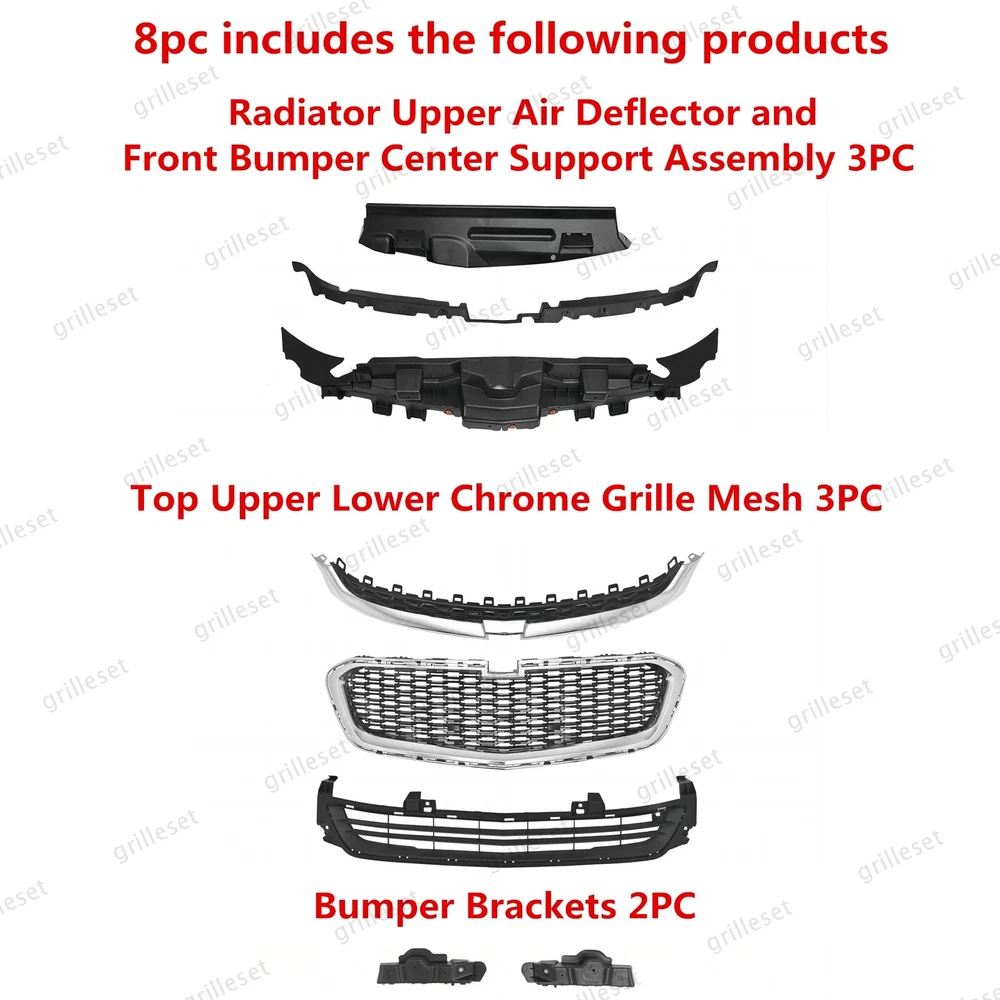 Fit for : 1 Set (8 PCS) Includes:(See more pictures for details) 1 Pc radiator upper air deflector 2 Pc front bumper fascia center support 1 Pc front top black grille with chrome trim 1 Pc front upper black grille with chrome trim 1 Pc front lower black grille mesh 2 Pcs front bumper brackets Item OE number : 20789654;23232813;22995184;22995179;22995188;22986140;22986141 Installation : Perfect fit direct replacement, no modifications required. Installation manual not provided; we recommend professional installation. Item's-Features : Superior quality kit 100% brand new Made from high-quality materials Excellent replacement part, no modifications needed Other parts fit for