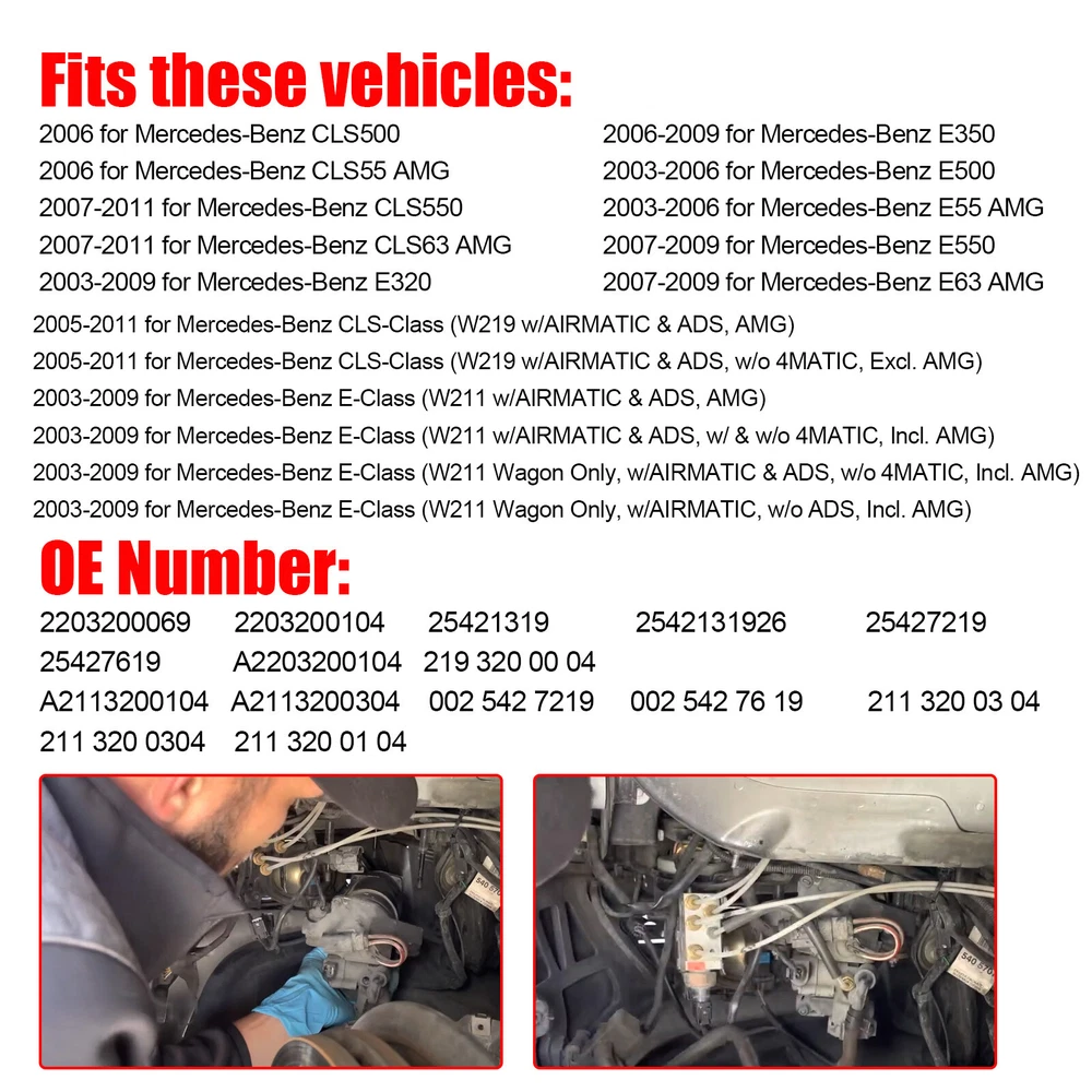 Product Type : Shocks, Struts & Assemblies Color : Silver & Black Fitment : 2006 for Mercedes-Benz CLS500 2006 for Mercedes-Benz CLS55 AMG 2007-2011 for Mercedes-Benz CLS550 2007-2011 for Mercedes-Benz CLS63 AMG 2003-2009 for Mercedes-Benz E320 2006-2009 for Mercedes-Benz E350 2003-2006 for Mercedes-Benz E500 2003-2006 for Mercedes-Benz E55 AMG 2007-2009 for Mercedes-Benz E550 2007-2009 for Mercedes-Benz E63 AMG 2005-2011 for Mercedes-Benz CLS-Class (W219 w/AIRMATIC & ADS, AMG) 2005-2011 for Mercedes-Benz CLS-Class (W219 w/AIRMATIC & ADS, w/o 4MATIC, Excl. AMG) 2003-2009 for Mercedes-Benz E-Class (W211 w/AIRMATIC & ADS, AMG) 2003-2009 for Mercedes-Benz E-Class (W211 w/AIRMATIC & ADS, w/ & w/o 4MATIC, Incl. AMG) 2003-2009 for Mercedes-Benz E-Class (W211 Wagon Only, w/AIRMATIC & ADS, w/o 4MATIC, Incl. AMG) 2003-2009 for Mercedes-Benz E-Class (W211 Wagon Only, w/AIRMATIC, w/o ADS, Incl. AMG) Part Number : 2203200069, 2203200104, 25421319, 2542131926, 25427219, 25427619, A2203200104,219 320 00 04 A2113200104, A2113200304, 002 542 7219, 002 542 76 19, 211 320 03 04, 211 320 0304,211 320 01 04 220 320 01 04, A 211 320 03 04, A 211 320 0304, A211 320 0304, A220 320 0104, A2113200158, 2113200158 Package Content : 1 x Air Ride Suspension Compressor Pump+Valve Block All of our products can be returned within 30 days, Please open a request for any of these reasons: The reason you pick has no impact on your refund amount, but it has a big impact on us as a seller, Choosing other reasons may delay the refund per an internal investigation and potential eBay appeal. You are entitled to send back the product within a 30-day period after receiving it. The returned item should be in its original condition, with all the accessories, literature, and factory carton that came with it. Product Type : Shocks, Struts & Assemblies Color : Silver & Black Fitment : 2006 for Mercedes-Benz CLS500 2006 for Mercedes-Benz CLS55 AMG 2007-2011 for Mercedes-Benz CLS550 2007-2011 for Mercedes-Benz CLS63 AMG 2003-2009 for Mercedes-Benz E320 2006-2009 for Mercedes-Benz E350 2003-2006 for Mercedes-Benz E500 2003-2006 for Mercedes-Benz E55 AMG 2007-2009 for Mercedes-Benz E550 2007-2009 for Mercedes-Benz E63 AMG 2005-2011 for Mercedes-Benz CLS-Class (W219 w/AIRMATIC & ADS, AMG) 2005-2011 for Mercedes-Benz CLS-Class (W219 w/AIRMATIC & ADS, w/o 4MATIC, Excl. AMG) 2003-2009 for Mercedes-Benz E-Class (W211 w/AIRMATIC & ADS, AMG) 2003-2009 for Mercedes-Benz E-Class (W211 w/AIRMATIC & ADS, w/ & w/o 4MATIC, Incl. AMG) 2003-2009 for Mercedes-Benz E-Class (W211 Wagon Only, w/AIRMATIC & ADS, w/o 4MATIC, Incl. AMG) 2003-2009 for Mercedes-Benz E-Class (W211 Wagon Only, w/AIRMATIC, w/o ADS, Incl. AMG) Part Number : 2203200069, 2203200104, 25421319, 2542131926, 25427219, 25427619, A2203200104,219 320 00 04 A2113200104, A2113200304, 002 542 7219, 002 542 76 19, 211 320 03 04, 211 320 0304,211 320 01 04 220 320 01 04, A 211 320 03 04, A 211 320 0304, A211 320 0304, A220 320 0104, A2113200158, 2113200158 Package Content : 1 x Air Ride Suspension Compressor Pump+Valve Block All of our products can be returned within 30 days, Please open a request for any of these reasons: The reason you pick has no impact on your refund amount, but it has a big impact on us as a seller, Choosing other reasons may delay the refund per an internal investigation and potential eBay appeal. You are entitled to send back the product within a 30-day period after receiving it. The returned item should be in its original condition, with all the accessories, literature, and factory carton that came with it. On Oct 17, 2024 at 05:17:33 PDT, seller added the following information:
