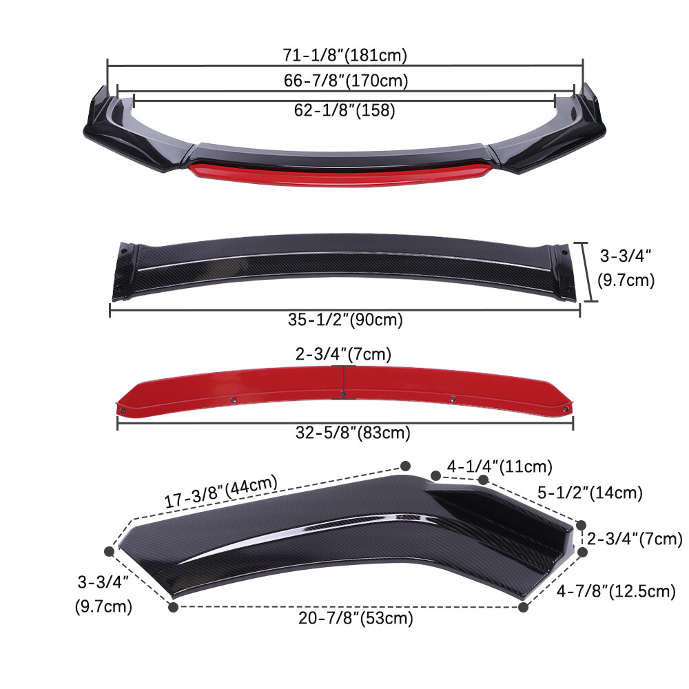 Product Description Features: Give your car a more aggressive racing look. Easy installation, direct replacement. Accentuates your vehicle's overall look. Gives Better Aerodynamics for your vehicle Specification: 100% Brand New Type: Car Front Lip Bumper Spoiler Color: Carbon Finber with Red Trim Materials: Made out of thick PP Material Package Included: 4pcs Front Lip Bumper Body Kits 1 x Set Screws Notes: The front bumper is between 63-70 inches in length and 17.8-22.5 inches in width. The bottom of the front bumper should be flat enough. The original car of the product does not have a front lip installed. Payment Policy Shipping Policy Returns Policy Payment Policy 1.We accept multiple payment methods which ebay allowed . 2.For faster service, please update your correct address before sending payment. 3.We do not accept any transaction methods other than ebay. Shipping Policy ☼1.All orders will be shipped within handling time ( Business Days ) after the payment is cleared. ☼2.We use Standard / Expedited Shipping Service: all shipments will be with valid tracking number. ☼3.If you didn't received your shipment within estimated shipping time , please contact us. We will check and offer a good solution to you . Our goal is customer satisfaction! Returns Policy ✍We offer 30 days exchange or return and money back policy If you feel unsatisfied with our product for any reason , please contact our professional customer team within 30 days ,you can choose exchange , return or refund , we will take care of your issue . ✍If the product is defective or damage upon arrival, please contact us immediately don't open dispute , we will spare no effort to offer the best solution . ✍As most of our products are aftermarket car parts, which do not come with instructions.professional INSTALLATION is highly recommended. Before install your item, please refer to internet or your local Auto parts store for some tips. Buyer assumes all risks for any improper installation and usage. ✍NOTE : Any item that is approved for exchange or return, item will need to be in brand new condition, which means the item is never installed and needs to be kept in original packaging. Fees will be applied for missing parts or damages. We don't accept return if item got used , modification painting or damaged for improper installation. ✍Whatever happens, please contact us. Our goal is 100% customer satisfaction. We will reply you within 24 hours on working days. Copyright © 2023 Dianxiaomi