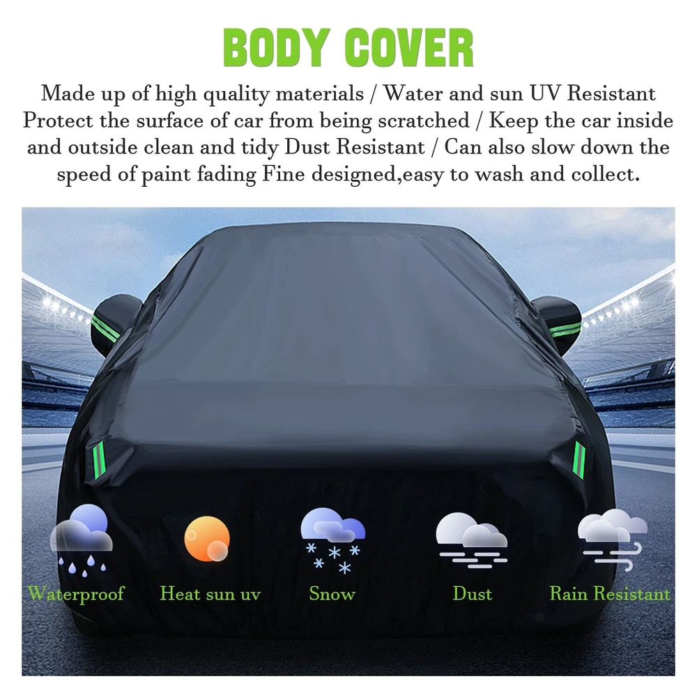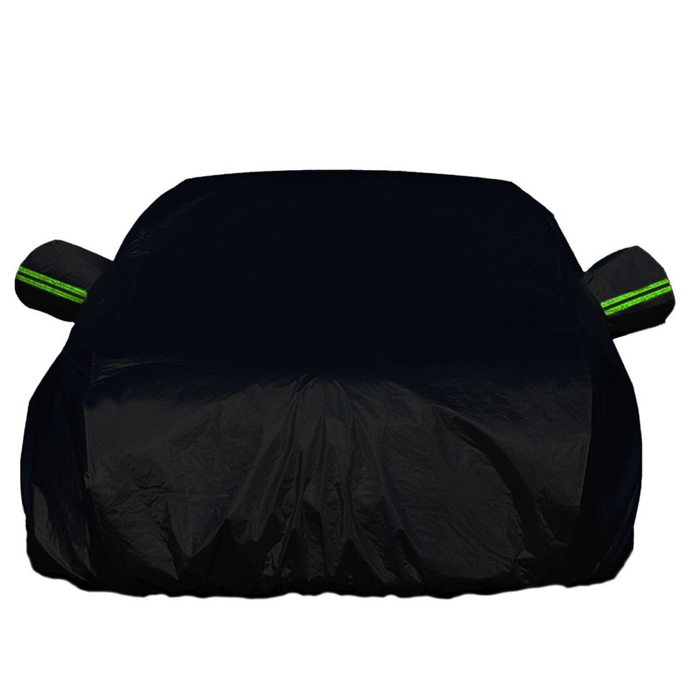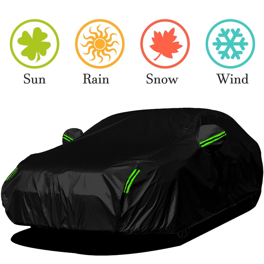 Feature: · Weatherproof car cover provides a universal fit; works with almost any sedan up to 201 inches long; protects against outdoor elements, like damaging UV rays, dust, dirt, wind, rain, snow, ice, and tree debris · Made of heavy-duty marine-grade 170T polyester · Sewn-in elastic band (front and rear of the cover) ensures a snug fit; fastening straps with adjustable buckles (front, middle and rear of the cover) ensure extra-secure placement, even on windy days · 2 Mirror Pockets for optimal coverage;4 reflective stripes for clear visibility after dark · Sewn-in storage bag for convenient access and compact cover storage when not in use; backed by an Amazon Basics 1-year limited warranty; note: please pay attention to size before purchasing · Will not fit Sedan greater than 201'' long Package included: · 1 * Car Cover · 1 * Storage Bag