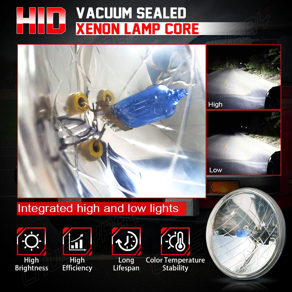 THESE ARE HALOGEN SEMI-SEALED BEAM STOCK STYLE GLASS FACED HEADLIGHTS WITH METAL BACKSIDES! REPLACEABLE SUPER WHITE 100/130 W HALOGEN H4 BULBS INCLUDED! Stock Style H4 Replacement Upgrade Headlights Pair - High Beam Headlight Pair 100/130W Dual Beam Super White Halogen Bulbs Glass Lens / Metal Backside DOT SAE Approved This listing is for 4 pcs new 5-3/4" stock style glass faced halogen H4 conversion headlight bulbs. These halogen semi-sealed beam headlights look almost the same as the original headlights your vehicle came with when it was new, except these light up 200% brighter then the stock style incandescent bulbs and take a replaceable 100/130W super white H4 bulbs. These have the original shaped prongs on the back so they will plug right into your original wiring harness plugs. These have the correct locating tabs on the backside to clock properly into the high beam headlight buckets. These are correct for any car or truck that has 4 round glass headlights. Each bulb is 5 3/4 inches in diameter. DOT SAE approved. Notes: 1. 100% Brand New in the box with manufacturer packaging, never been installed before. 2. Factory bolt-on OE fitment, no vehicle modifications are required; or replacement for the stock unit. 3. No installation guide or instruction included, professional installation recommended. 4. We Provide 60 day manufacturer warranty after you received this Item. Product Features: 1. Great upgrade for your vehicles exterior looks. 2. Direct replacement of the original lights, no modification needed,A great upgrade for your vehicle. 3. Precision optics offers a highly controlled concentration of light to enhance visibility. 4. Enhance visibility during night time, heavy rain, snow, or dense fog. 5. High quality OE grade materials to withstand the most rigorous weather conditions. 6. The Halogen bulbs are included. H4 bulb is compatible with the headlight. Package Includes: 4x Headlight (Pair Passenger and Driver Side) with Halogen Bulbs On Dec 16, 2024 at 17:48:36 PST, seller added the following information: