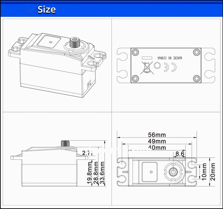 Product Description If you have any questions, please contact customer service first, do not open disputes easily, thank you! Specifications : Voltage Range:4.8V/6V Singnal Frequency:330Hz PWM Voltage:3.3V-5.0V Oprerating Temperature:-10℃-50℃ Cycle:20ms Remote control Angle:90° Quiescent Current:50mAh Rated Current:1.0A Blocking Current:Futaba 25T Gear Material:All Metal Geal Bearing:2BB Connector Wire Length:260mm Weight/Dimensions:50g/40*20*28.3mm Operating Speed:4.8V/0.11"60" Stall Torque:4.8V10KG.cm Package includes : 1*Metal steering gear Note : Please allow 1-3mm measuring deviation due to manual measurement. Due to the different monitor and light effect,the actual color of the item might be slightly different from the color showed on the pictures.Thank you! About Us We accept all payments authorized by eBay. powered by