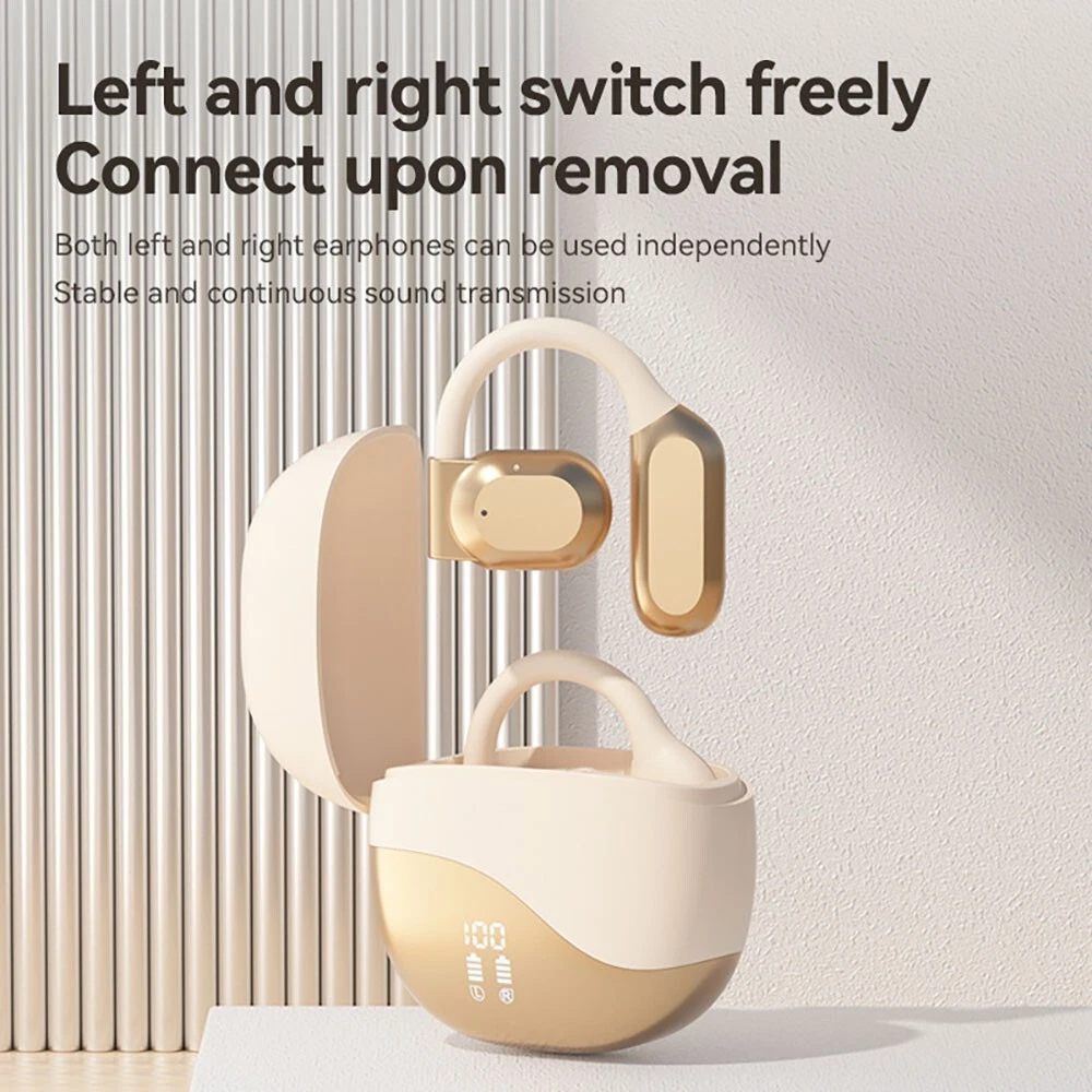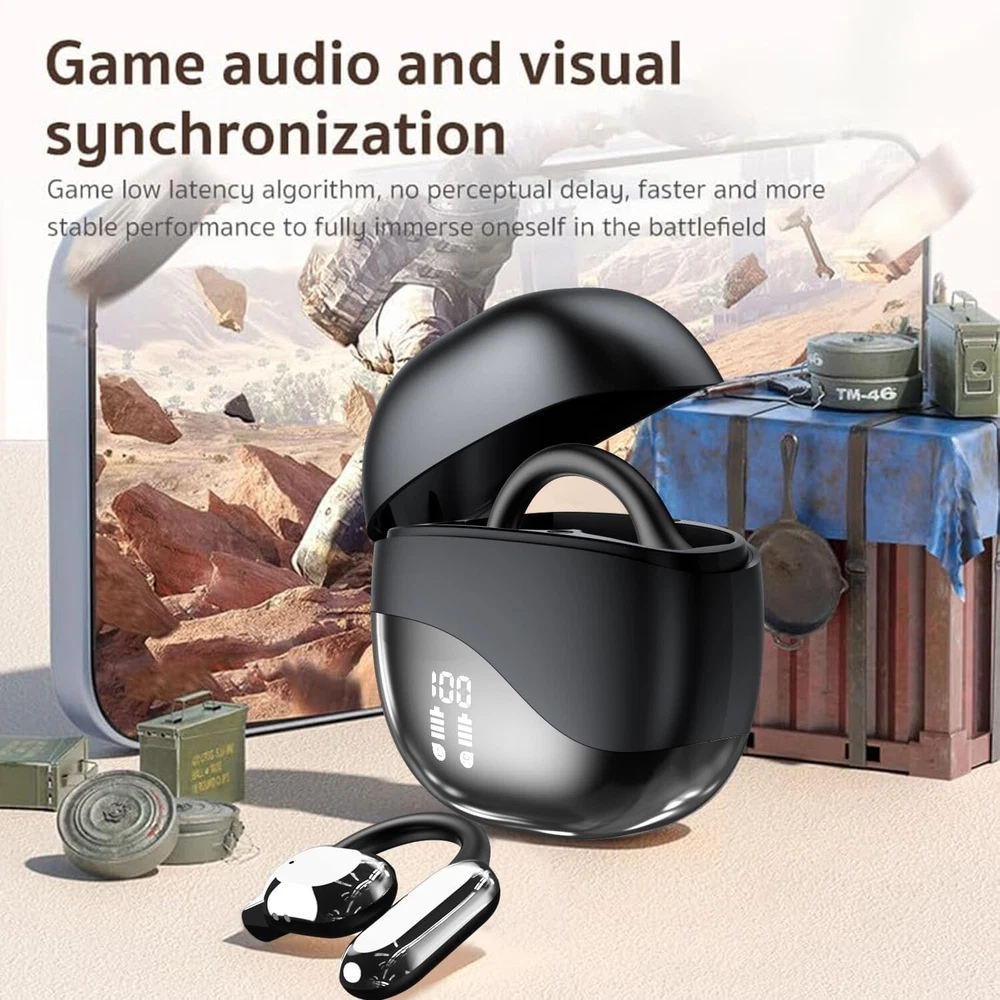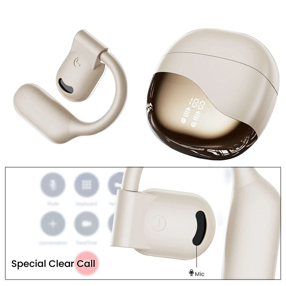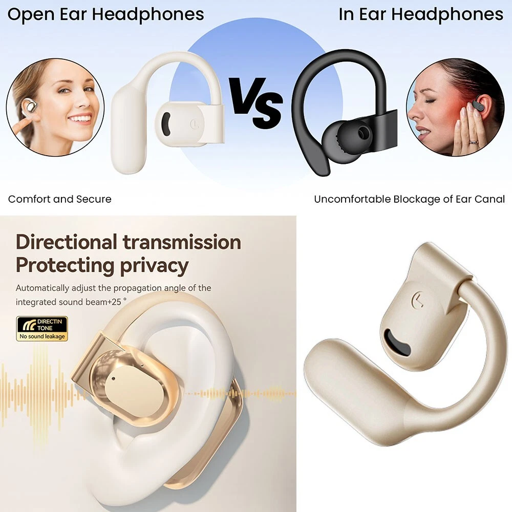 Package: 1* Pair Bluetooth Headphones 1* Headphones Charging Case 1* USB Type-C charging cable 1* User's manual Feature: 【Open Ear Headphones】Open headphones feature a completely open design with silicone ear hooks that fit securely in the ear for a breathable listening experience that combines comfort and security. This is very suitable for running, fitness, work and outdoor sports 【Clear Call & HI-FI Sound】The open ear headphones utilizes powerful dynamic drivers, three times larger than typical wireless headphones, creating stunning top-notch sound. The wireless Bluetooth headphones makes you feel like you're in a concert hall listening to music, from crisp, clear highs to exciting, powerful lows, the high-definition stereo sound provides you with an immersive listening experience. 【LED Digital Display】On single fully charge, Bluetooth headphones last up to 6 hours, and the charging case can charge the earbuds an additional time, so you can get 58 hours of total playtime from a fully charged case. 【Environmental Sense Knowing & Smart Touch Control】Open air headphones with open ear cup design can allow you to enjoy your favorite music, but also listen to the surrounding sounds, which is very safe for you and your family. Smart Bluetooth headphones are equipped with high sensitivity touch sensors for easy operation, you can adjust the volume, play and pause, SIRI and other operations by just touching the body of the headphones. 【Latest Bluetooth 5.4 & Low-Latency Experience 】 The wireless Bluetooth headphones utilizes advanced Bluetooth 5.4 technology, which is more energy-efficient, faster and more stable in transmitting data compared to Bluetooth 5.0. Specification: Bluetooth vesion: V5.46 Earbud battery: 90mAh Chagring case battery:300mAh Power input:5V Transmission distance: ≥10M Usage time: 7-8 hours Charging time: 90 minutes Off standby time: 3000 hours