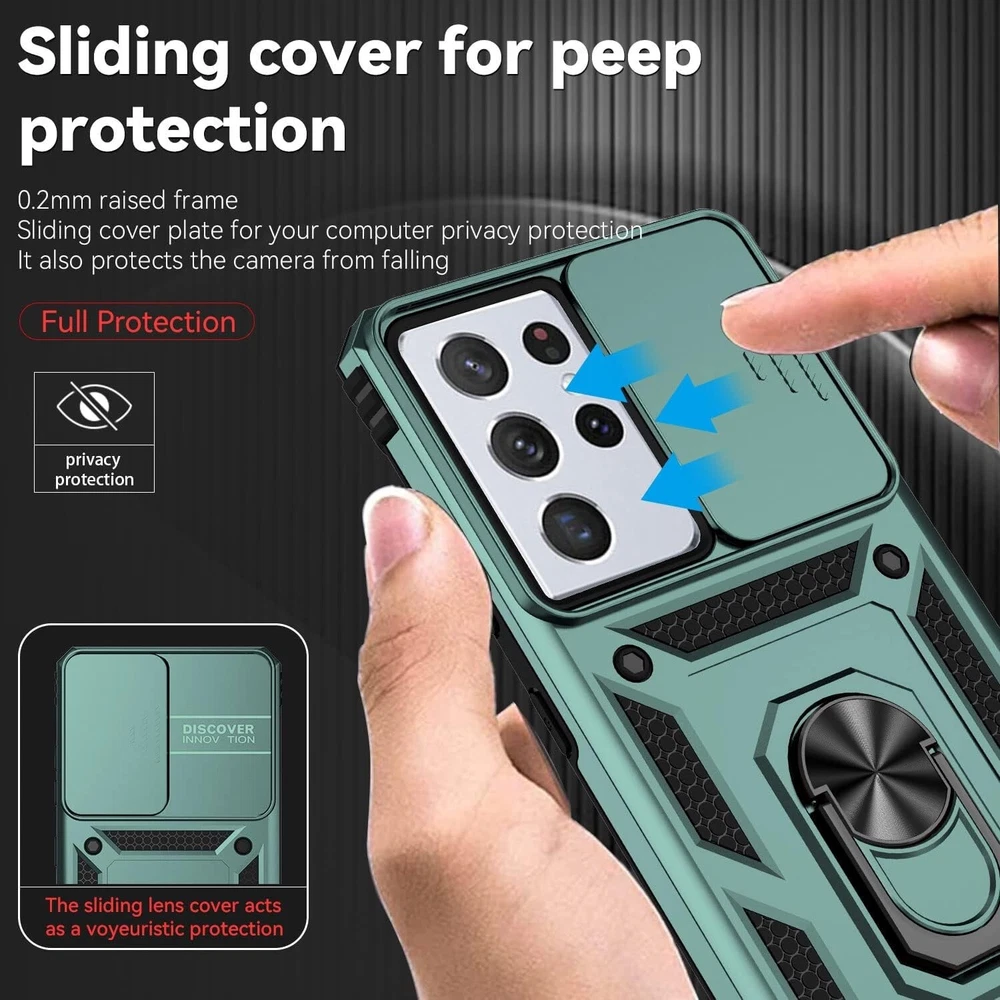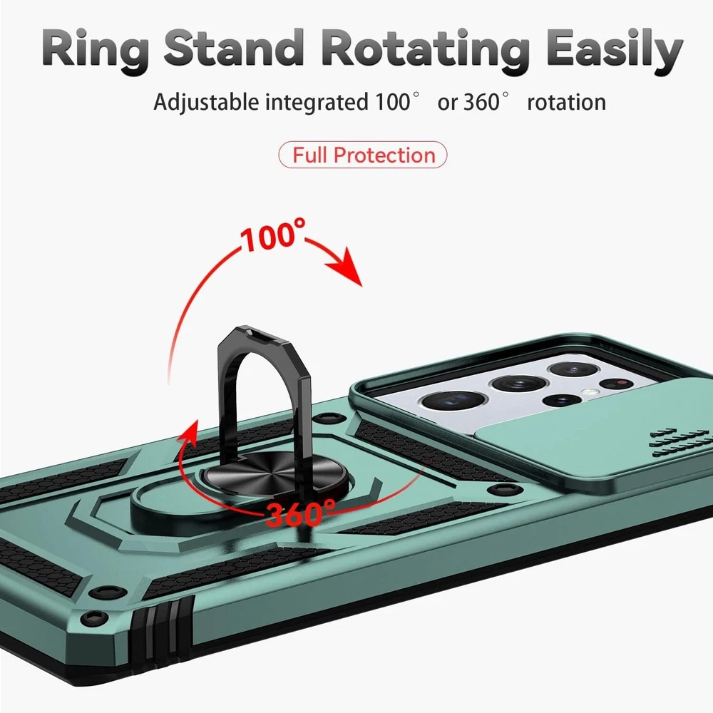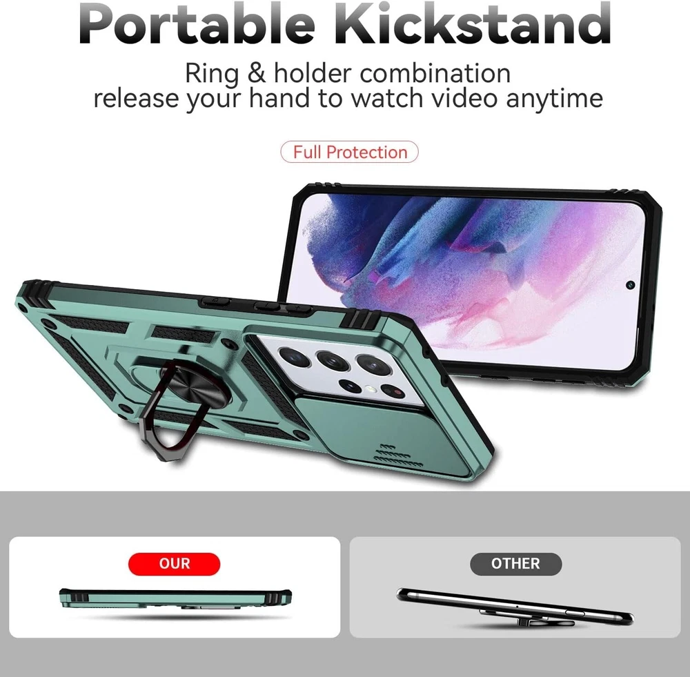 For Samsung Galaxy S21 Ultra Case with Shockproof Protection & Kickstand Green 【Durable Phone Case】 Armor Case with sliding camera cover specially designed for Samsung Galaxy S21 Ultra 6.8 inch (2021 released). Notice: Due to the metal ring on the back, the case will NOT work with wireless Charging function. 【Perfect product design】 Two - in - one case, consists of comfortable TPU and hard PC, the two are closely aligned, escort your phone. All buttons and interface user-friendly design to avoid frequent disassembly. And the case perfect cutouts for speakers, camera and charging hole allow you to easy access. 【Military Shockproof Protection】 Double layer shockproof case made by TPU+PC. This multi-layer cushion structure provide additional shock absorption protection. slide camera cover design protects and hides the camera perfectly. 4 highly strength shockproof corners and raised lens and screen lips keep your phone from scratching and breaking when dropped. It's a good choice for sports and outdoor activities. 【Magnetic Ring Kickstand】 Newly upgraded multi-function case built-in ring kickstand and metal patch.360°rotating ring provide two stand modes for vertical horizontal viewing, so it can be used as ring holder and release your hand when watching video. The Metal Patch back easily attach to magnetic car mount, very convenient during driving time for navigation. You will love how convenient it is with such powerful functions. Package Included: 1x Case With Kickstand & 1x Screen Protector(Phone Not Included) USA SELLER!! BRAND NEW!! BEST QUALITY!! FAST DELIVERY VIA USPS!! GREAT FOR ANY OCCASIONAL GIFT TO YOUR FRIENDS, FAMILY, NEAR AND DEARS ONES!! Contact us Please give us the opportunity to resolve any problem before leaving any negative feedback or open any dispute. Please feel free to contact us on eBay's Internal Message System for any questions or concerns you may have. If you want to change shipping address or want a faster shipping etc., it's Better leave a note of under your order, so the system can hold on your order before we see your message, thanks. We will answer all your questions or concerns ASAP. Feedback We will make every effort to make your shopping the most pleasant and wonderful! Please contact us before leaving a negative feedback, giving us a chance to resolve your problem. Customer Service If you have any problems, we are very glad to help you. Please message us directly through eBay for faster response. Your inquiry is important to us and we'll respond within 24 Hr. SHIPS FROM U.S!!!!!!!!RECEIVE IT FAST AND FREE!!!!!!! Your order will be shipped within 1 business days upon full payment received. [ Due to the different monitor and light effect, the actual color of the item might be slightly different from the color showed on the pictures. Thank you! ]