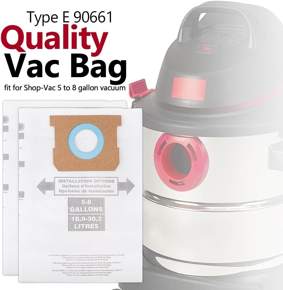 90661 Type E Replacement Shop Vacuum Bags 12 Pack COMPATIBILITY: The 90661 dust collector bags compatible with Shop-vac 5-8 gallon vacuum 84L250B, 84L300, 84M250B, 85L350, 85M300, 86L350, 86M300, 87L350, 87L450, 87M300, 87M350, 90M300, 92L350, 92M300, H87S550A, H87S650C, QL20ATS, QL20ATSP, QPL40, QPL650, 12RT300, 4045, 6045AH, also compatible with porter cable PX18406-5B, for dry debris pick-up only EFFICIENT DUST CAPTURING: The replacement vacuum bags hold most of particles and dust from workshop or house. Effectively collector drywall dust, cement dust, sawdust, house debris, lint, wood dust, construction debris and dust PACKAGE: Include 12 Pack 90661 shop vac bags TIPS: 24 hour online. If you have any question, please feel free to reach us On Nov 4, 2025 at 19:27:13 PST, seller added the following information: