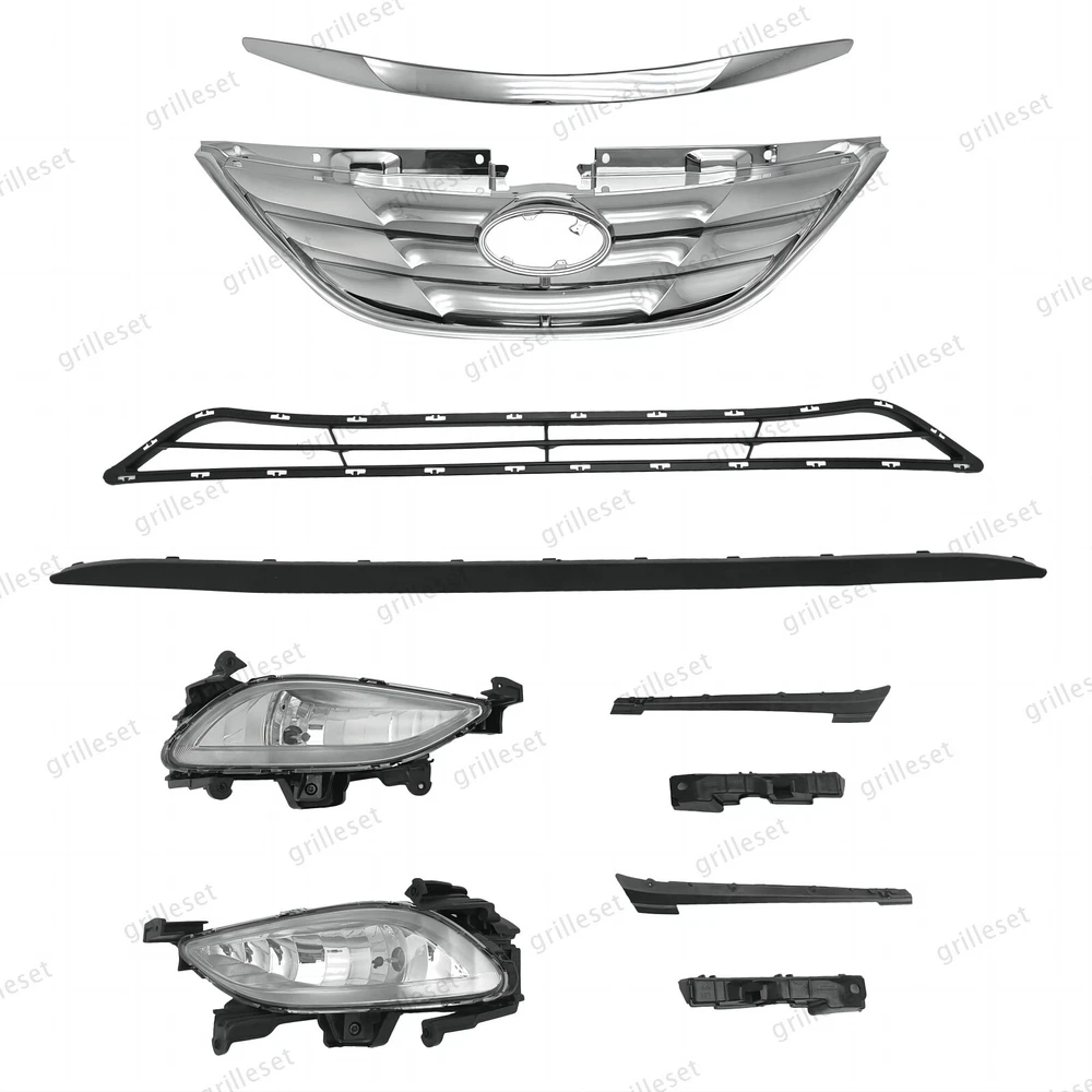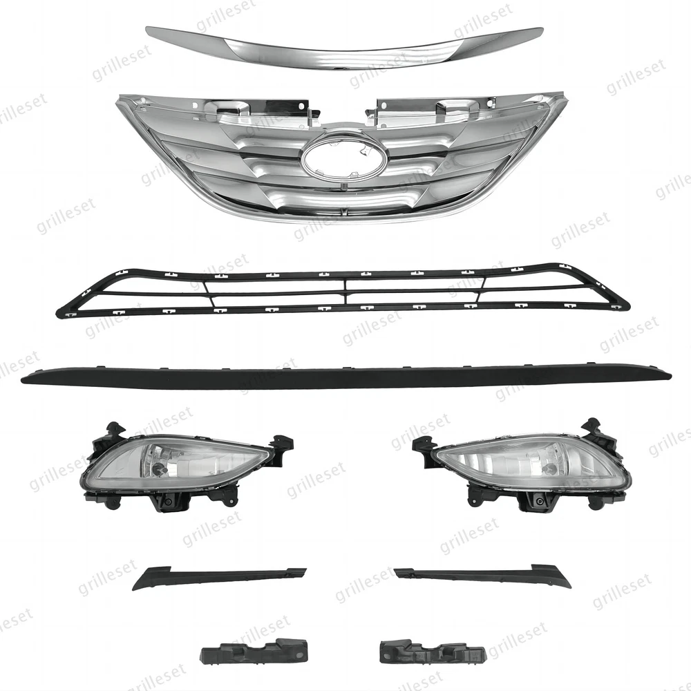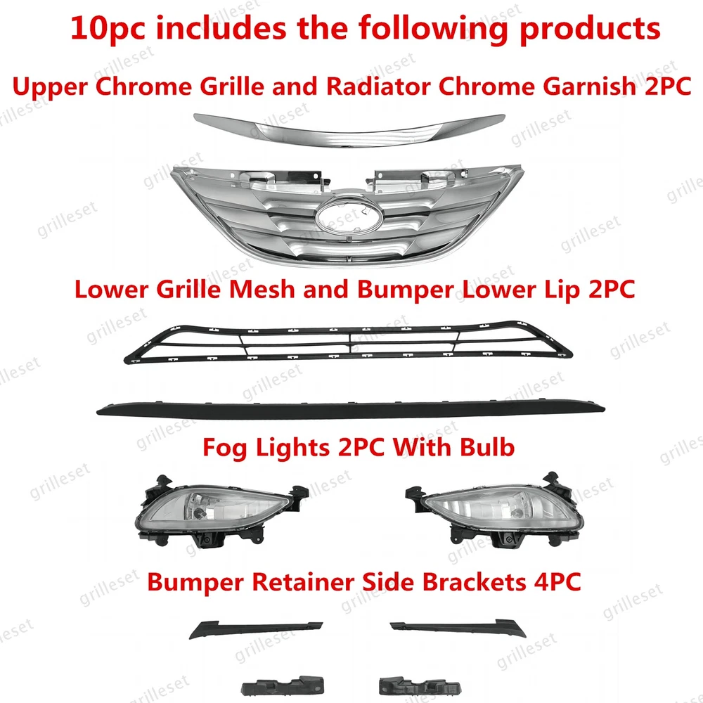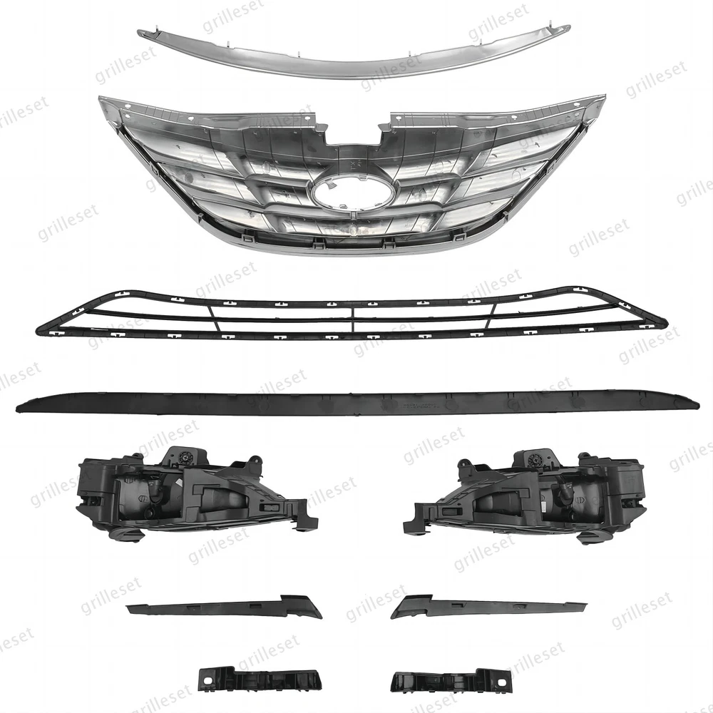Fit for : 1 Set (10 PCS) Includes:(See more pictures for details) 1 Pc front upper black grille with chrome trim 1 Pc front upper radiator grille garnish assembly 1 Pc front lower black grille mesh 1 Pc front bumper lower lip assembly 2 Pcs fog lights with bulb 2 Pcs front bumper side brackets 2 Pcs front bumper brackets Item OE number : 86355-3S100;86350-3S100;86561-3S000;86591-3S000;92201-3Q000;92201-3Q000;86555-3S000;86556-3S000;86513-3S000;86514-3S000 Installation : Perfect fit direct replacement, no modifications required. Installation manual not provided; we recommend professional installation. Item's-Features : Superior quality kit 100% brand new Made from high-quality materials Excellent replacement part, no modifications needed Other parts fit for