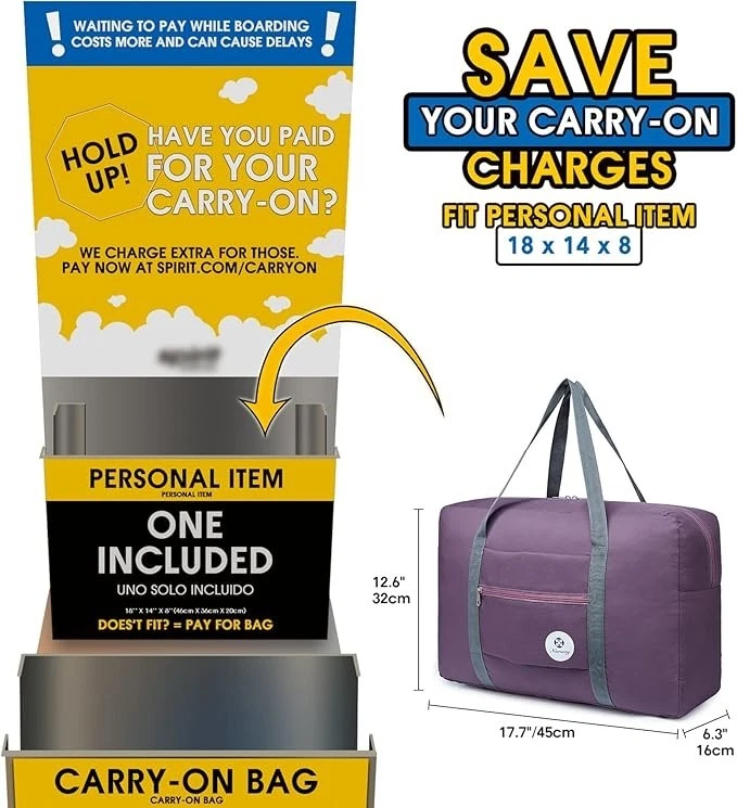 For Spirit Airlines Personal Item Bag 18x14x8 Foldable Travel Duffel Bag Tote Carry on Luggage Duffle Overnight for Women and Men About this item WATERPROOF - Solid straps bear the weight more than 45 pounds, no need to worry any ripping or break during trips. Made of waterproof fabric to protect your gears well from rain or wet. No extra shoulder strap is included for model 1112. If you prefer to have a strap, pls refer to model 3112 or 1109 Important:【Model:T1112】The bag size is 17.7 x 12.6 x 6.3 inch fits personal item size 18 x 14 x 8 inch of Spirit Airlines & Frontier Airlines, which can be placed under seat and no need to pay carry-on. We compare the bag to 15.6 inch laptop for you to better understand real bag size, pls double check the size before purchase to ensure it meets your expectation PACKABLE & LIGHTWEIGHT - Folding up when not use. Capacity 25L yet only 7.2 ounce offer the same packing space as a small suitcase - minus the weight and bulkiness EASY CARRYING - Its external storage pocket offers quick access to small items. The pouch as a strap enables the duffel to fit over the handle of common suitcase 18 20 24 26 28 32 inch for easy carrying VERSATILE - Easily held all your gym or travel items, ideal for garment bag, sports, gym use, yoga, travel, weekend shopping, overnight, camping and picnic