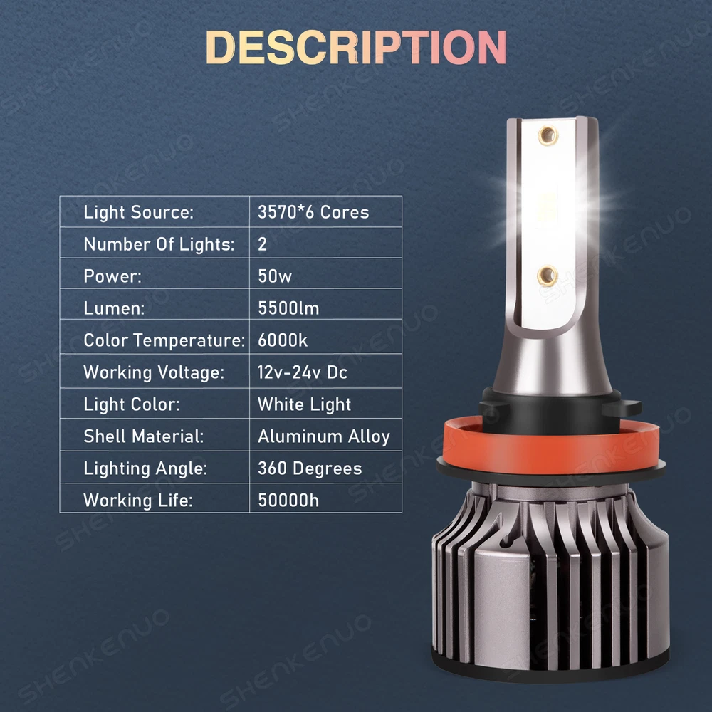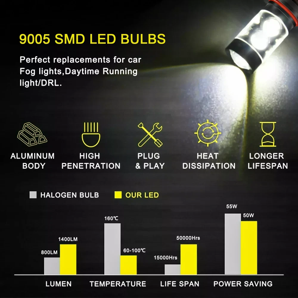 This package includes 9005 High Beam Headlight + H11 Low Beam Headlight + 9006/9145 Fog Light Bulbs. LED Headlights Bulbs: 9005/H11 LED replacement bulbs are engineered for superior performance, exceptional looks, and increased safety. Especially designed for upgrading the Headlight bulb Bulb Size: 9005(=HB3), H11(=H8) Beam Type: High Beam / Low Beam Color Temperature: 6000K - White Wattage: 50W Lumens: 5500LM Working Voltage: DC 9V to 36V Waterproof Level: IP68 Material: Aluminum alloy Lifespan: > 50,000 Hours Product Advantages: High brightness: The latest cob with 6000K cool white LED chip; 300% brighter than the existing halogen headlights. Advanced technology ensures perfect beam patterns without any black spots. Glow on all sides: 360 degree no dead angle lighting, use more clear and bright at night Strong heat dissipation: equipped with highly silent heat dissipation fan, speed up to 12000/min, heat dissipation efficiency, can avoid temperature accumulation on the beads, prolong the service life of the beads. IP68 waterproof: using integrated radiator and aluminium body self-cooling, waterproof and heat-proof. Even in extreme cases, the enclosure of the rainproof driver can work properly. Automatic short circuit protection. Simple Installation: Installation only takes 10 minutes. No relay. There is no capacitor. No additional wiring. Plug and play. LED Fog Lights Bulbs : Bulb Size: 9006/9145 Voltage: DC 9V to 36V Color Temperature: 6000K Wattage: 50W Lumens: 5500LM Color: White Lifespan: >50, 000 hrs This new product has high luminous efficiency, low power consumption and long service life. Easy installation, Direct plug in and play. Best used for Fog/ Driving lights/ Daytime Running Light DRL Faster on/ off response time Energy saving, environmental protection, Stable performance, through strict test, Use safer driving Why Use LED Headlight Bulb? If you find this listing, you are must looking for brighter white headlight bulbs with an excellent beam pattern for upgrade. Congratulations, you find what you want now! LED headlight bulbs is a successful replacement for Halogen bulbs, it is brighter and more reliable, perfect for high-beam (and also low beam, fog, & driving lights) use. With it, you will get much better night driving, and also, much better seen during the day. Package Included: 2 x LED High Beam Bulbs 2 x LED Low Beam Bulbs 2 x LED Fog Light Bulbs New and old packaging will be shipped randomly!! Install Caution 1. As a safety precaution, make sure that the car has had time to cool down properly before starting the installation process. 2. Put the vehicle into park or make sure it is securely in gear. 3. Make sure to have the ignition turned off and the keys removed. 4. Be careful to avoid burns, especially when turning on or off the vehicles lighting. 5. Be careful to avoid crushing or cutting the bulbs. Also make sure to not touch the bulbs with your fingers, as this will cause blotting. 6. Fully examine the connection of the contact points, ports and the wires as faulty connections can cause lighting problems. 7. Make certain that the end of the bulb does not come in contact with the interior light shield of the headlight when adjusting the bulb. 8. Please install car headlight dust cover to ensure the normal operation of the lamp (to prevent dust and small ribbons to reduce the chances of bulb cooling fan broken to ensure the normal operation of the cooling system) Note After installation, dust prevention measures must be done, LED lamp life depends on the cooling performance is good or bad. The lamp heat mainly active cooling (fan-cooling based, supplemented by the whole aviation aluminum heat dispassion ) as the main cooling method, the life of the fan in lamp bulb directly affects the life of LED lights On Nov 21, 2024 at 02:54:16 PST, seller added the following information:
