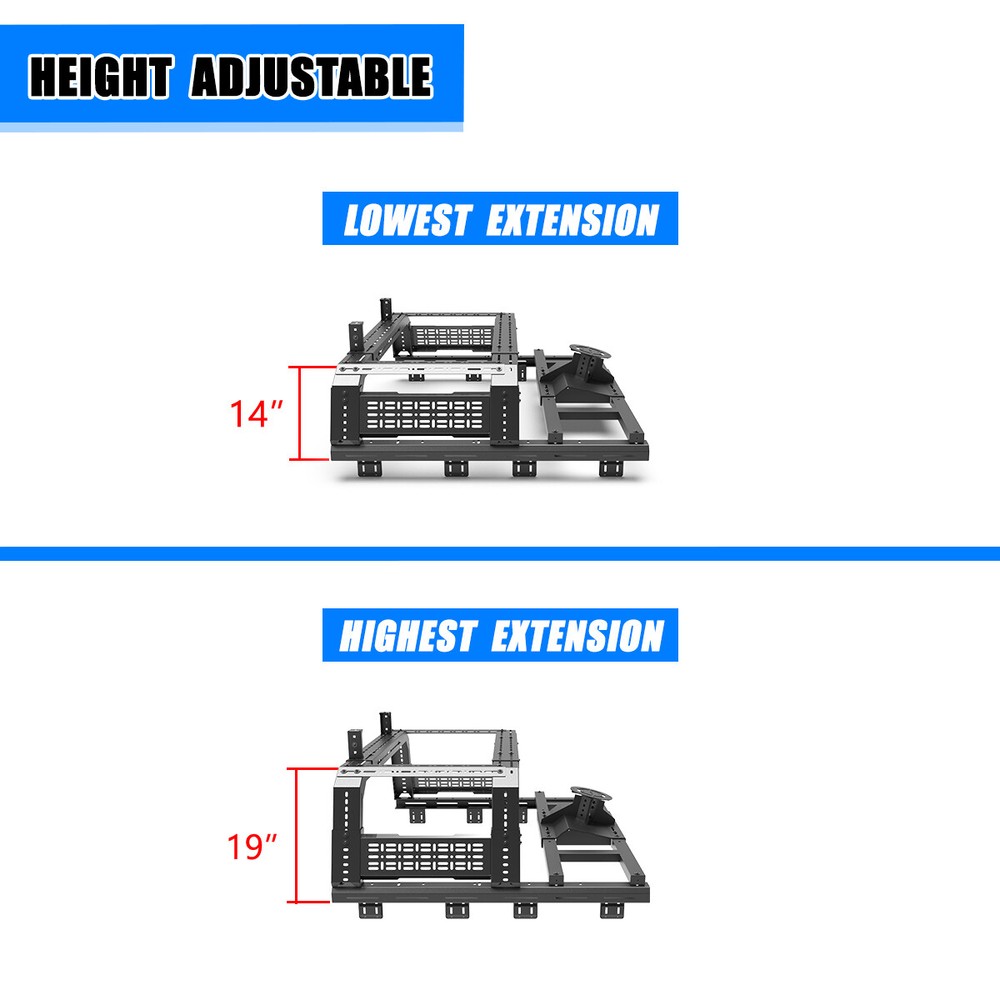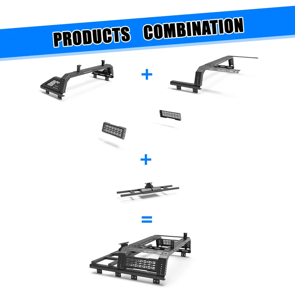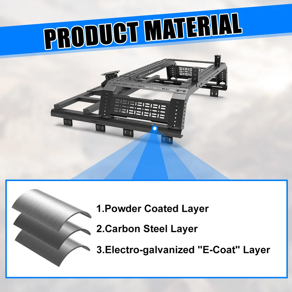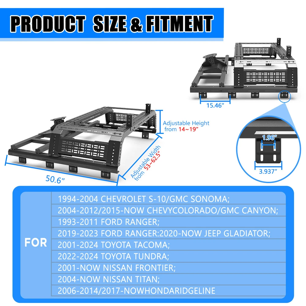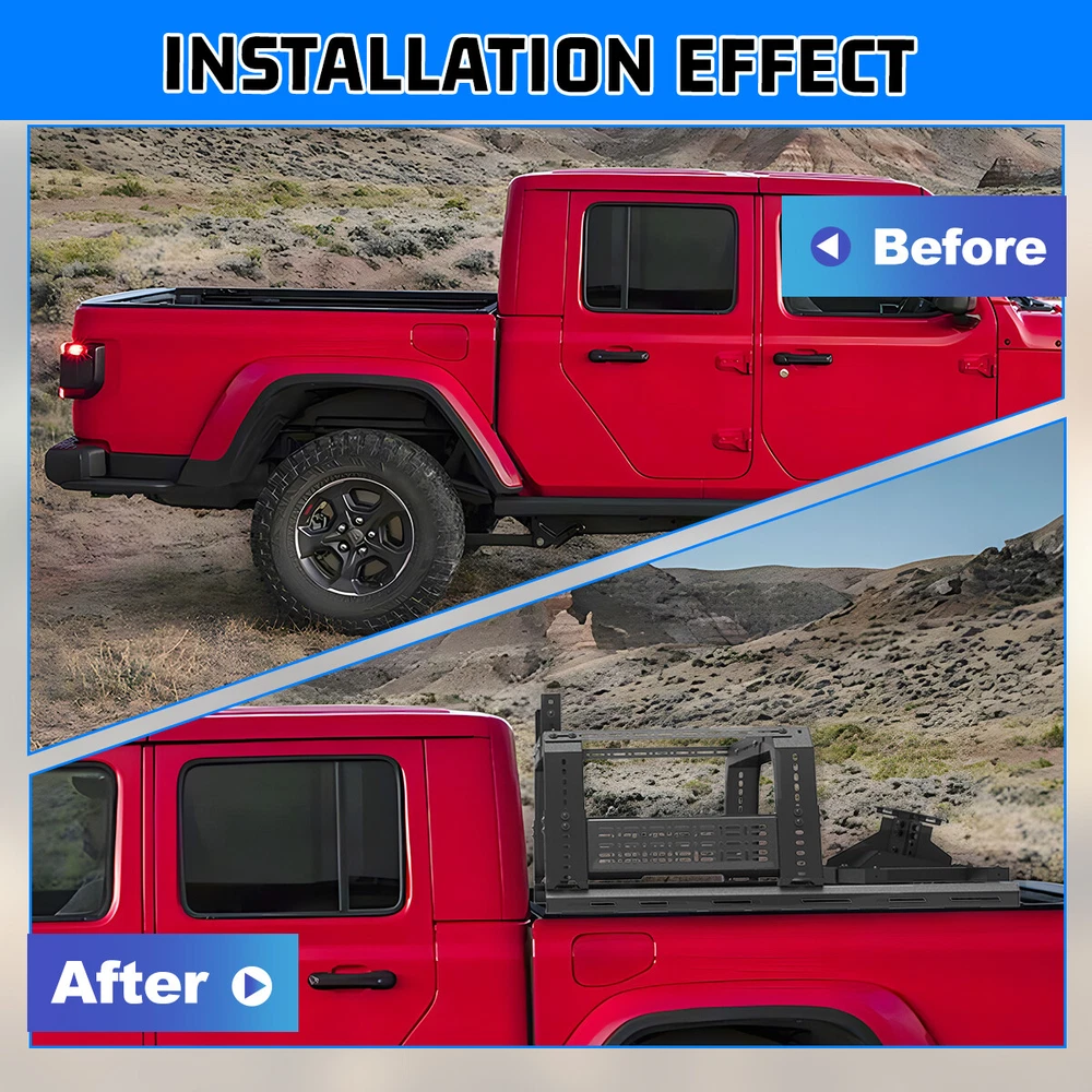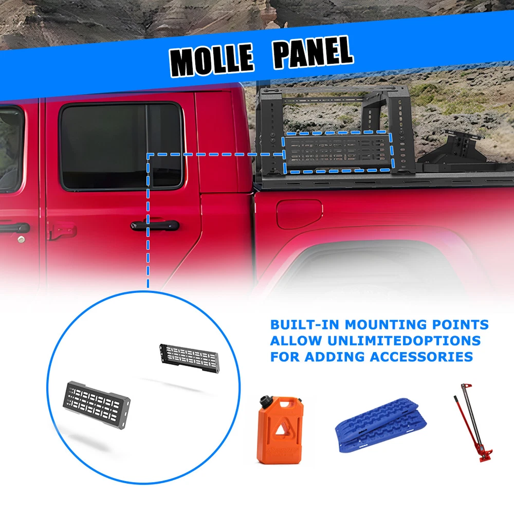 Head Lights Tail Lights Fog Lights Turn Signal Bumper Fender Flare Inner Fender Hubcaps Refrigerator Other Items for sale Head Lights Tail Lights Fog Lights Turn Signal Bumper Fender Flare Inner Fender Liners Portable Refrigerator For Universal Full-size Pickup Trucks Bed Rack Roll bar+Molle Panel+Spare Tire Specification Material: Steel Mounting Hardware: Included Surface Finish: Black Powder Coated Finished Surface: Anti-corrosion Textured Powder Coating Adjustable Length:53-62.5 inches Adjustable Height:14~19 inches Features Full New: 100% brand new and premium quality. Fitment: Compatible with All Full Size Trucks Material: The heavy duty steel construction and black powder coat finish make your truck feel good. Perfect for use in extreme temperatures and weather. Unique Design: Cold-rolled steel plate with black powder coating, equipped with welding technology, safe and non-toxic, has excellent anti-corrosion performance and electrical insulation performance, greatly improves the service life of the product, and effectively prevents the generation of rust. Warranty: 1 year manufacturer's warranty, 60-day return policy, premium quality and after-sales service, you can buy with confidence! Professional After-sales: If you have any questions, you can contact us, we have a professional after-sales team to solve your doubts! Fitment For 1994-2004 Chevrolet S-10/GMC Sonoma For 2004-2012/2015-now Chevy Colorado/GMC Canyon For 1993-2011 Ford Ranger For 2019-2023 Ford Ranger For 2020-now Jeep Gladiator For 2001-2024 Toyota Tacoma For 2022-2024 Toyota Tundra For 2001-now Nissan Frontier For 2004-now Nissan Titan For 2006-2014/ 2017-now Honda Ridgeline Package Include 1 x Truck Bed Roll Bar(Front+Middle+Molle panel+Spare tire rack) 1 x Set of Mounting Accessories (Lights are not included)