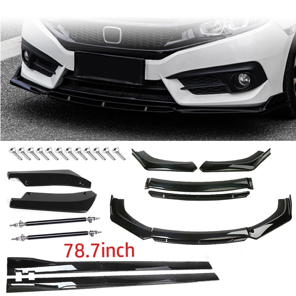 Package 1: Front Lip Chin Bumper(4PCS) Specification: Condition: 100% Brand New Type: Front Lip Chin Bumper Body Kits Material: Made of high quality PP plastic, Durable Color: Glossy Black Placement on Vehicle: Front ; Lower Features: Give your vehicles sporty appearance Protect Your Bumper From Scratching Strict quality control standards to Build and test. Come With Screws, Pre-drilled holes for quick installation Professional Installation Is Highly Recommended. Package 2: 78.7" Side Skirt Splitter Extension(2PCS) Specification: Condition: 100% Brand New and High Quality Type: Car Body Side Skirts Material: Made of high quality PP plastic, Durable Color: Glossy Black Surface Finish: Glossy Black Side Skirt Size: 2M/78.7" 78.7inch (Make Sure 2m Length is the size you want!!!!!!!!!!!!!!!!!!!!!) Features: 1.Universal modified side skirt for car sedan. 2.While the side skirts don't affect the front ground clearance too much, it enhances the side extension of the in a very pure and exciting way. 3.A Perfect Aftermarket Replacement. 4.Professional Installation Is Highly Recommended. 5.No block to the front ground clearance, effectively enhance the side extension 6.It can give your car a very sporty looking in minutes 7.It is durable and long lasting during any weather situation 8.It can also protect your vehicle from scratches or small bump damages Package 3: 19" Rear Lip(2PCS) Specification: Condition: 100% Brand New and High Quality Type: Car Body Rear Lip Material: Made of high quality PP plastic, Durable Color: Glossy Black Surface Finish: Carbon Fiber Look Rear Lip Size:48cm/19" Placement on Vehicle: Left, Right Package 3: Strut Rods (2PCS) Specification: Quantity: One pair (2 pieces) Material: Made with premium quality aluminum alloy finish Color: Glossy Black -These front support rods are used to reinforce your front splitter or rear diffuser. It is universal fit for cars trucks, if you need to extend the strut bar, you can extend its length from 8" to 13" . -These include fully articulated top and bottom joins which allow them to be installed at any angle. -It will support your vehicle bumper lip splitter stronger with and awesome eye-catching look. -Universal for all cars, trucks, and etc. -Require drilling holes into the bumper lip diffuser to attach safely to the vehicle, professional installation highly recommended. Package Includes: 4 pcs /set Front Bumper Lip Chin Body Kits 2 x 78.7" Side Skirts Extension 2 x Rear Lip 2x Strut Rods 1 x Screws kit Note: Installation instruction is not included, professional installation is recommended. Please allow 1-3CM differs due to manual measurement. Due to the different display and different light, the picture may not reflect the actual color of the item. Thanks for your understanding.