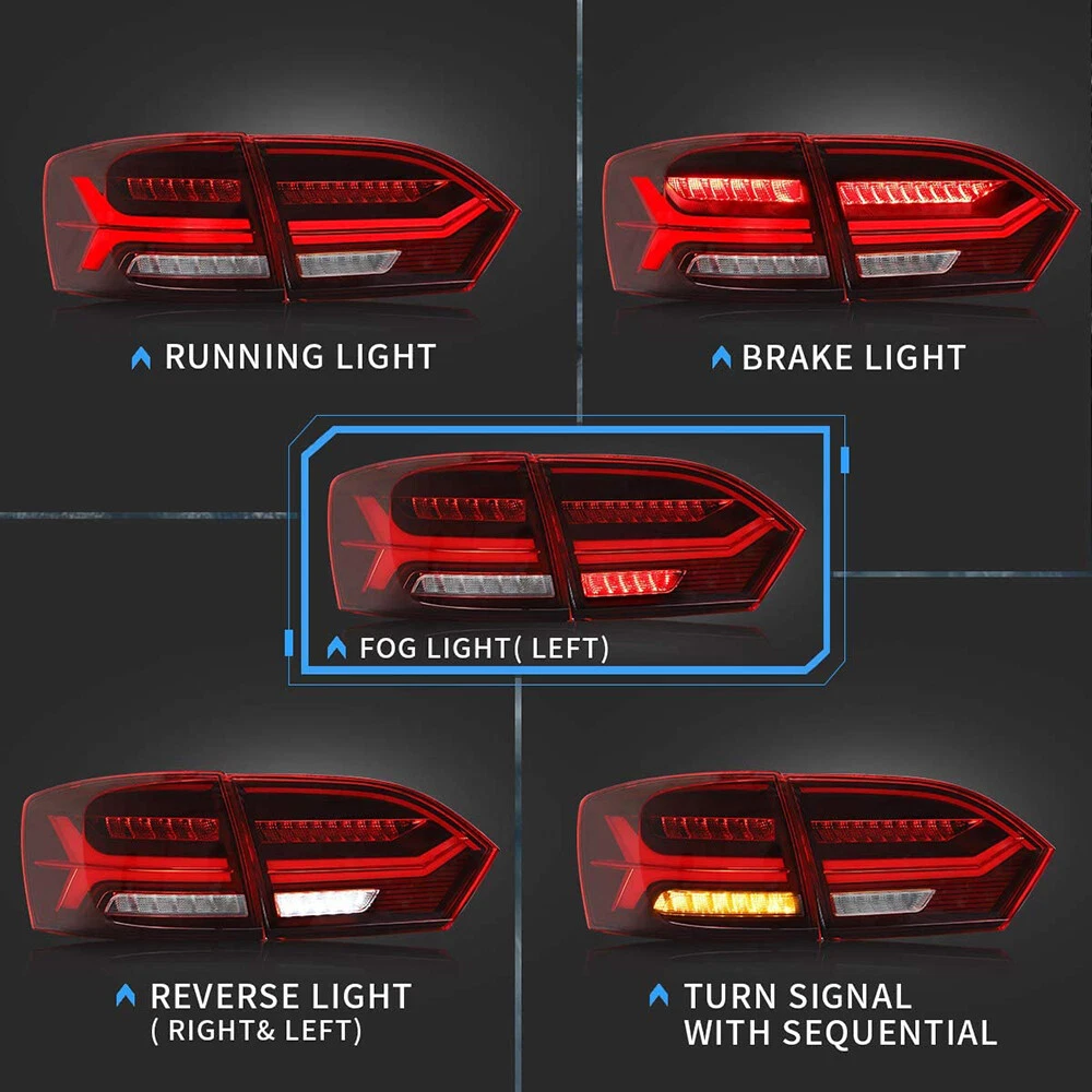 For Volkswagen Jetta MK6 2011-14 FULL LED Red Tail Lights Assembly w/Sequential NOTE: 【PRE-OWNED】Basically new, slight scratches or slight installation marks on the appearance.The outer packaging is old. If you want to buy brand new taillights, please click: Fitment: 2011 2012 2013 2014 VW Jetta/ Sagitar( Not Fit 2013 Jetta GLI and Factory Led Version) Item Features: Running Light: LED (Red) Brake Light: LED (Red) Reverse Light: LED (Diamond White) Turn Signals: LED (Amber. With Sequential Indicators) Housing Color: Black Lens Color:Red Housing Material: ABS, PMMA, GLASS Lens Material: PC Operating Voltage: 12V 35W Light Bar: LED 6000K Bulb: None (re-use original) Package includes: 1 pair of taillights with left side & right side. This item has the same connections and wires with the original taillights. It is easy to installing (Professional installation recommended). Warranty: One Year You May Also Like: 👇 SPECIFIC SHIPPING ABOUT PAYMENT RETURN SPECIFIC SHIPPING ABOUT PAYMENT RETURN VLAND Headlights VLAND Tail Lights VLAND Combination Set VLAND Bulbs For Chevrolet For Dodge For Ford For Honda For Mitsubishi For Hyundai For Lexus For Toyota For BMW For GMC For Volkswagen For Tesla For Subaru Other On Jan 2, 2025 at 20:27:22 PST, seller added the following information: