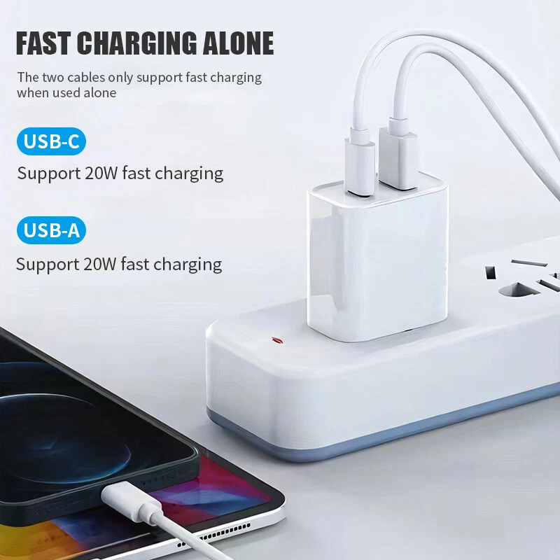 Features for Wall Charger: Made of high quality ABS material,ensuring durability and a smooth finish. Standard AC charger (US plug) Wide Compatibility: Ideal for almost all Phones, Electric Appliance, MP3 players, smartphones, e-book readers, Bluetooth speaker, more Auto adjustable 100-240V input fits world travelers in most countries High-Speed Charging: The USB-C port supports a maximum power output of 20W. Dual Port Fast Charging:Charging faster and safer than 1A adapter (Charge your iPhone 15 up to 50% capacity in just 30 minutes with the original cable. ) Auto stop charging after full charged, save energy and keep it safe Portable design, convenient to carry Light Weight: 40g (1.1oz) Features of Charger Cable: Ultra fast data transfer Supports quick charging Type-C reversible connector simplifies the connection. Plug and unplug easily without checking the orientation. Interface type: USB Type-C Charging Rate: 2.4A Data Transmission Rate: Up to 480Mbps Material:PVC Durability: Flexibility Testing: Over 10,000 bends Connection Durability: 5,000 insertions Cable Length: 1/2/3m (3/6/10 ft) Convenience: weighs only 30g Compatible with: For iPhone 15/15 Plus/15 Pro/15 Pro Max(Type-c to Type-c Cable) For iPhone 14/14 Plus/14 Pro/14 Pro Max For iPhone 13 Pro Max/13 Pro/13/13 Mini For iPhone 12 Pro Max/12 Pro/12/12 Mini For iPhone 11/11 Pro/11 Pro Max For iPhone X/XS/XR/XS MAX For iPhone SE 2020 For iPad Pro 12.9" 2018/2020 For iPad Pro 11" 2018/2020 For iPad Air3 10.5" For iPad Mini5 7.9" For iPad For Samsung Galaxy S20/S20+/S20 Ultra For Samsung Galaxy S21/S21+/S21 Ultra For Samsung Galaxy S22/S22+/S22 Ultra For Samsung Galaxy S23/S23+/S23 Ultra For Samsung Galaxy Note 20/20 Ultra For Samsung Galaxy Note 10/10+ /9/9+/8/8+... For Motorala Series Phone For LG Series Phone For Other Phone Packages include: Depend on the quantity option you choose