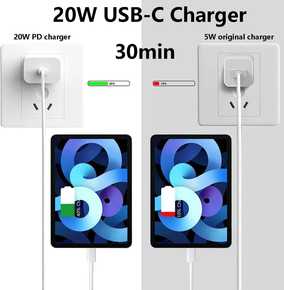 eBay Set: Input: AC 100~240, 50/60Hz Output: 5V/3A, 9V/2A-2.22A, 12V/1.5A-1.67A, 3.3-5.9V/3A, 3.3-11V/1.63A-1.8A Maximum Power: 20 watt Product color: white 20W USB C Power Adapter: Specification: Type: 20W PD Fast Charger, Wall Charger ,USB C Power Adapter,C ar Charger,Charger Adapter,Wall Charger Features: Fast Charge, Lightweight, / Color: White USB C TO USB C CABLE: Type: USB-C Cable /Charging & Data Sync Cable / Type-C/USB Cable/USB-C to USB Cable/Type c to Type c Cable/60w fast charger/PD Cable Cable Length:1m/3ft 2m/6ft Features:Fast Charge/Heavy Duty/Light weight/Portable/Travel/60w fast charger Color:White Reversible Connectors Special reversible USB C to USB C design, no need to distinguish reverse, simple and comfortable. Note: USB-A charger is not supported Only applicable to PD fast charge Fast Charge & Sync:USB C to USB C Fast Charging cable offers charging speed up to 60W NOTE: The actual charging speed depends on your device and wall charger. Simple & durable 13,000 swing life, the upgraded thick line can perfectly beat other products Thicker copper wire can increase the service life by 40% Comp atibility: For Apple iPad Pro 2021/ For Apple iPad Pro 2020/ For Apple iPad Pro 2018 For Apple iPad Pro 12.9 in 5 Generation/ For Apple iPad Pro 12.9 in 4 Generation / For Apple iPad Pro 12.9 in 3 Generation For Apple iPad Pro 11 in 3 Generation/ For Apple iPad Pro 11 in 2 Generation / For Apple iPad Pro 11 in 1 Generation For Apple 2020 New iPad Air 4th For Apple 2021 iPad Mini 6 For Apple iPhone 15 For Apple iPhone 15 Plus For Apple iPhone 15 Pro For Apple iPhone 15 Pro Max Wide Compatibility: For Samsung Galaxy S23/S22/S20/S21/S21+/S21 Ultra/Z Fold 3/Z Flip 3 For Google Pixel 4/ 4XL/ 3/ 3XL/ 2/ 2XL For LG, Motorola and any USB C & type C port phone