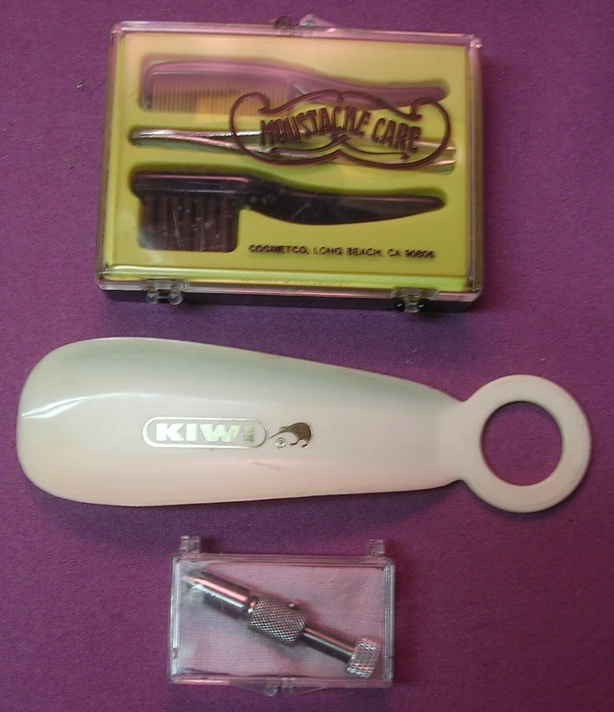4 Items for the Man who has Everything. First is a Brand New, Never Used Mustasche Care Kit by Cosmetco, Long Beach CA. It consists of a Moustache Comb, Mustache Brush and Tweezers. The second is a Stainless Steel Nose Hair Clipper (Yes, it works) which has been sterilized. The Third Items is a Nail Clipper with a Black Leatherette carrying sleeve. The last item is a plastic shoehorn. Nothing says I Love You more than these great gifts for Christmas, a Birthday or Anniversary. Multiple purchases can be combined for reduced shipping costs. Email me for details.