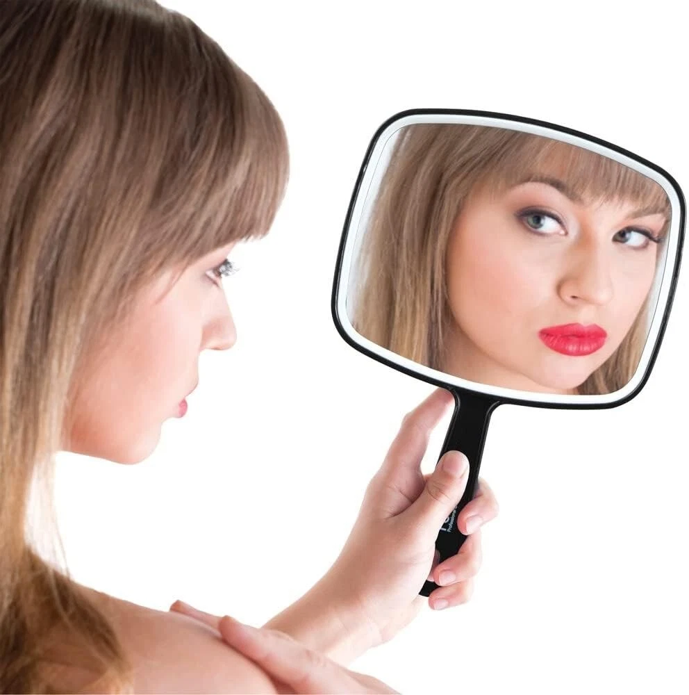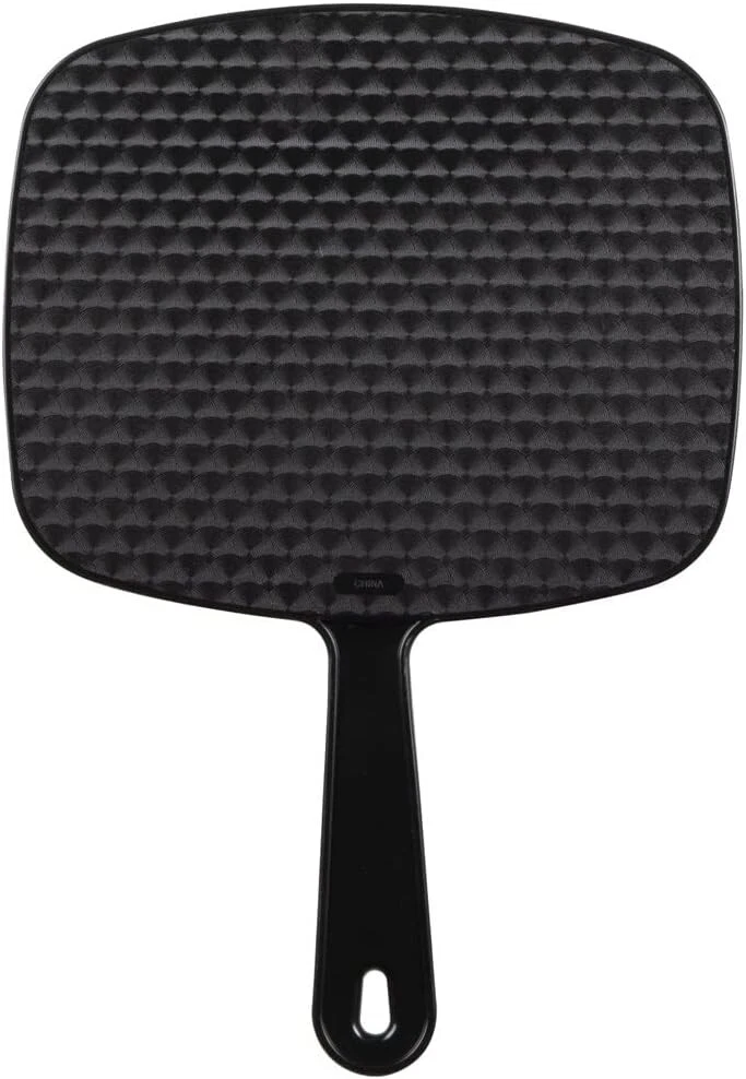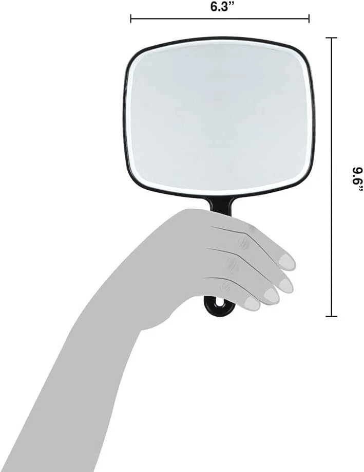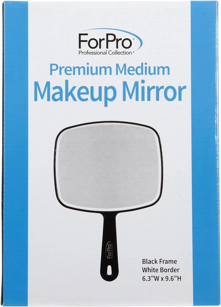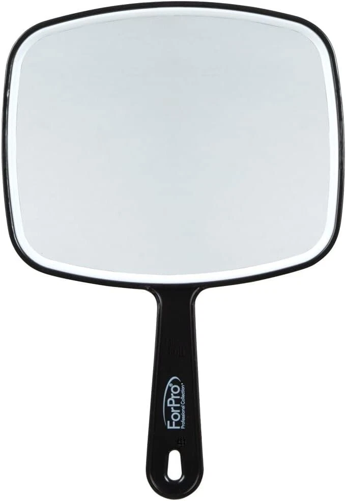 ForPro Professional Collection Premium Hand Mirror with Handle About this item Handheld Mirror: Features a long, comfortable grip handle and large square face. Premium Makeup Mirror: Provides a clear reflection without distortion. Square Hand Mirror: Mirror is encased in a solid black frame made from thick plastic. Hand Mirror: Features a hang hole for easy storage. Use as Travel Mirror: Lightweight, weighs only 6 ounces. Dimensions: 6.3” W x 9.6” L