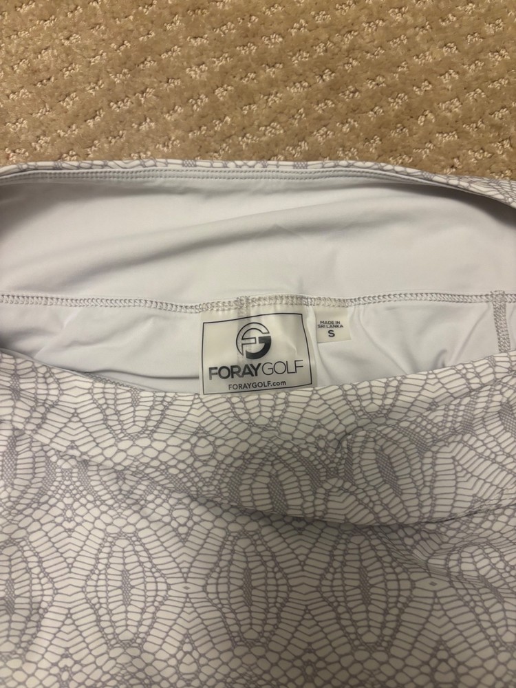 The Foray Golf Women's White golf skirt in size small is a versatile and stylish piece perfect for both activewear and casual occasions. Made of a comfortable nylon and spandex blend, this white skirt features built in shorts with a short mini length and athletic fit, it is ideal for golfing activities, providing stretch and pockets for functionality. The brand Foray Golf ensures quality and performance in this sporty skirt, making it a must-have for any woman golfer. Smoke free/pet free home. Original price $150.