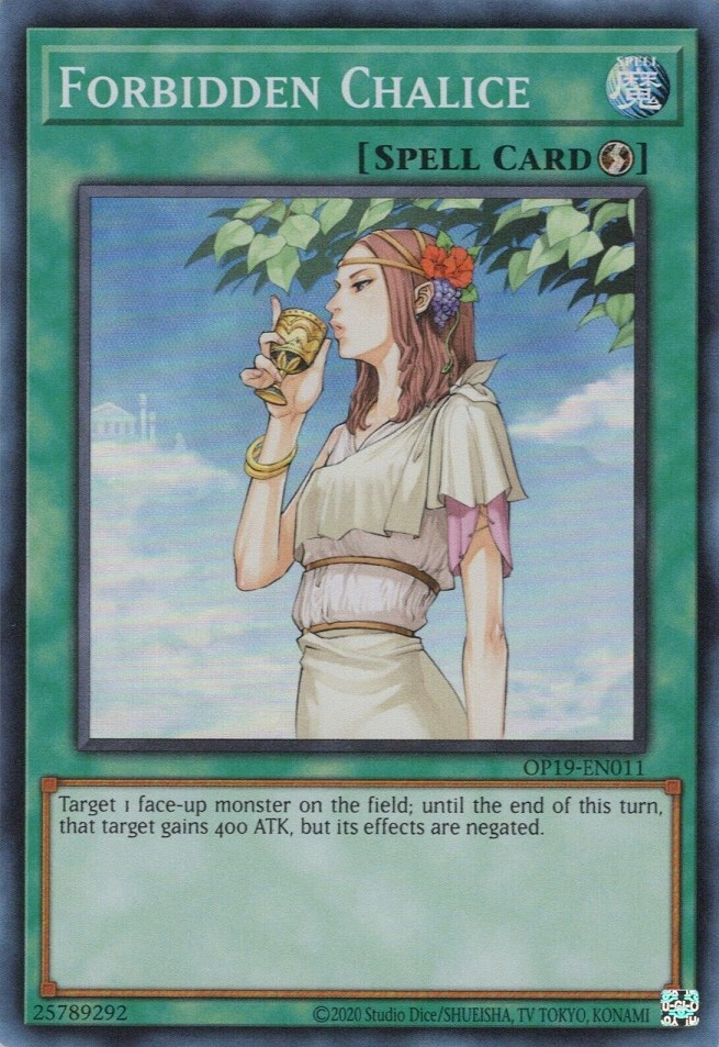 Features:UnlimitedAttribute/MTG:Color:SpellLanguage:EnglishCard Number:OP19-EN011Additional Description:Forbidden ChaliceRarity:Super RareManufacturer:KonamiSet:OTS Tournament Pack 19Card Type:Spell-Quick PlayCard Name:Forbidden ChaliceCard Text:Target 1 face-up monster on the field; until the end of this turn, that target gains 400 ATK, but its effects are negated.Official Tournament Stores must review their Konami OTS agreement before selling this product.Game:Yu-Gi-Oh! TCGbrand:Konami