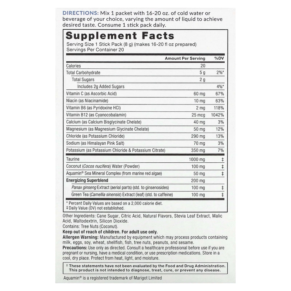 Product details Stay refreshed and energized with Liquid Labs Energy drink mix from Force Factor. Liquid Labs' advanced Hydration Optimization Matrix™ is an innovative electrolytes powder formulated to deliver rapid, superior hydration. This unique blend of five key electrolytes, coconut water, and Aquamin sea mineral complex helps you stay hydrated and perform at your peak, no matter where life takes you. Our hydration packets and daily energy drink are designed for on-the-go convenience, providing 3x more electrolytes and 10x less sugar than leading sports drinks. The electrolytes powder packets are easy to mix with water, creating an electrolyte drink that is both delicious and efficient in replenishing your body's essential nutrients. Whether you're an athlete, a fitness enthusiast, or just someone who needs an energy boost, Liquid Labs rapid hydration supplement provides a healthier, more effective alternative to traditional sports drinks. Upgrade your hydration game with Liquid Labs Hydration Supplement by Force Factor, and experience the difference in performance, endurance, and overall wellbeing. Order now and join the growing community of active adults, athletes, and busy professionals who trust Liquid Labs for their hydration needs. HYDRATE FASTER & BETTER: Liquid Labs’ exclusive Hydration Optimization Matrix blends five key electrolytes, coconut water, and Aquamin sea mineral complex with natural cane sugar to speed up absorption to hydrate you better and faster than water alone. BOOST ENERGY & FOCUS: Every delicious sip contains Panax ginseng, green tea, and taurine – a naturally uplifting blend of energizing ingredients to help you boost energy, focus, and motivation for work, workouts, and everything in between. CONTAINS 10X LESS SUGAR: Too many sports drinks and electrolytes powders are overloaded with sugar. Liquid Labs is a great-tasting, better-for-you hydration powder that is made with 10x less sugar than the leading sports drink. MADE WITH 3X MORE ELECTROLYTES: Don’t be fooled by hydration packets that are mostly sugar and salt. Liquid Labs hydration packs contain 3x more electrolytes than leading sports drinks, providing you with fast, refreshing, high-quality hydration. REFRESHING & GREAT-TASTING: Water is vital for good health, but it can be a little boring. Liquid Labs electrolyte drink mix is bursting with refreshing fruit flavor you’ll love, and contains no artificial sweeteners or artificial dyes.