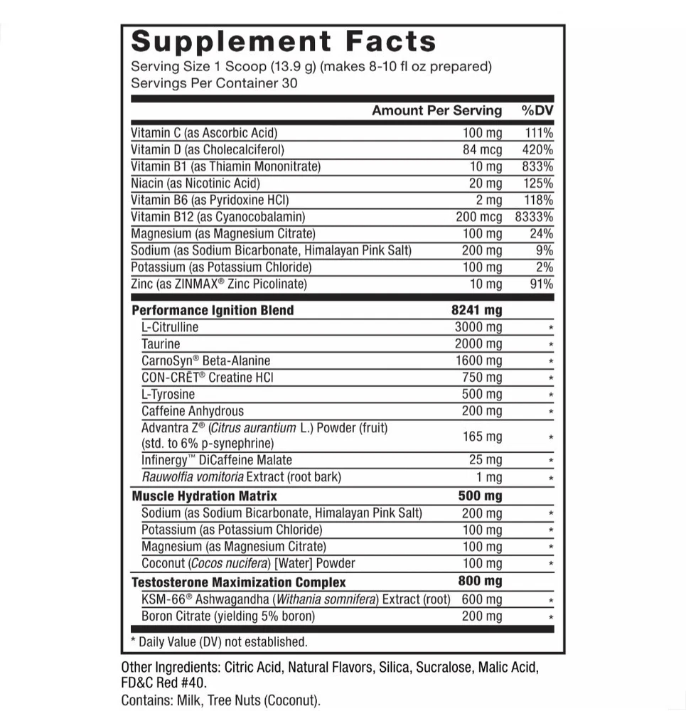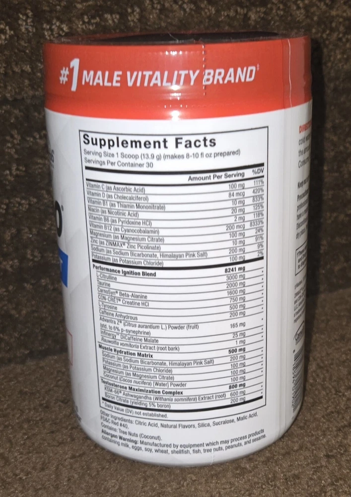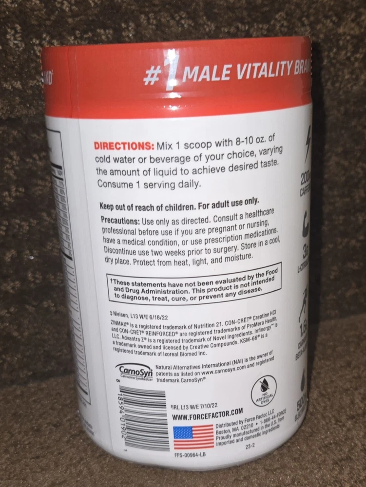 Country/Region of Manufacture: United States Type of Diet: Bodybuilding, Fitness, Gym & Training, Weightlifting Supply: 1 Month and Longer Flavor: Fruit Punch Nutrition Facts Label: Yes Ingredients: Beta-Alanine, Creatine HCl, L-Citrulline, L-Tyrosine, Taurine, Caffeine Anhydrous, KSM-66 Ashwaghanda Formulation: Powder When to Take: 30-45 minutes before workout. Type: Sports and Fitness Performance MPN: FFS-00964-FG Number of Pills: 30 Day Supply Brand: Force Factor Active Ingredients: L-Citrulline, L-Tyrosine, Taurine, CarnoSyn Beta-Alinine, CON-CRET Creatine HCI, KSM-66 Ashwagandha Expiration Date: 10/31/2025 Department: Men Main Purpose: Maximize Energy, Increase Focus, Maximize Pumps & Performance