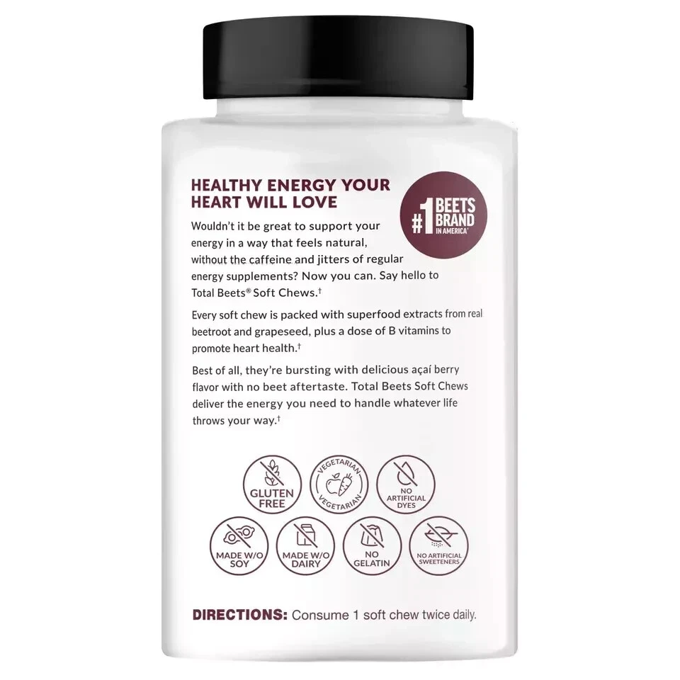 Force Factor Total Beets Blood Pressure Support, Beet Root Supplement Soft Chew About this item HEART-HEALTHY ENERGY: Total Beets soft chews are a safe source of heart-healthy energy, with no stimulants or artificial sugars, giving you an anytime energy boost to tackle whatever life throws your way. Plus, they are convenient when you're on the go Product Note: Exposure to heat or sunlight may lead to melting/damage of product. Hence customers are expected to be available during the product delivery PREMIUM INGREDIENTS: This superfood formula features both beetroot powder and beetroot extract, blended together with antioxidant-rich grapeseed extract and the amino acid L-citrulline, for 650mg of daily cardiovascular support. EASY TO TAKE: These guilt-free, individually wrapped Total Beets soft chews are portable and fun to eat, with no need to mix into water. Just unwrap, chew, and enjoy a clear boost of heart-healthy energy whenever and wherever your day takes you. AMAZING TASTE: Beets are polarizing. Some people love the taste, some people hate it. Total Beets soft chews taste amazing, with a delicious açaí berry flavor that masks virtually all of the raw beet notes. And better yet, no juicing required MADE IN USA: Force Factor vitamins and supplements are expertly formulated with premium, globally sourced ingredients that are carefully tested for quality and potency. They are produced in GMP-certified facilities right here in the USA.