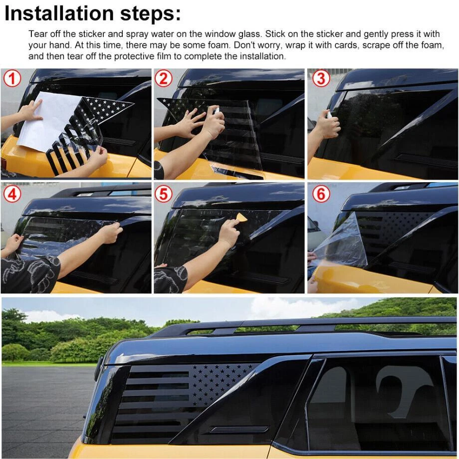 Fitment: Fit For Ford Bronco Sport 2021 2022 2023 2024 Feature: Condition:100% Brand new Material: High-Quality PVC Color: Black Package including:2PCS Made in a ISO9001 Factory,good quality and have been exported all over the world Easy installation. (Sold as seen, please ensure suitability carefully before purchase) INSTRUCTION MANUAL IS NOT INCLUDED Rear Window Glass Sticker Decals Trim For Ford Bronco Sport 21-24 US Flag Black Fitment: Fit For Ford Bronco Sport 2021 2022 2023 2024 Feature: Condition:100% Brand new Material: High-Quality PVC Color: Black Package including:2PCS Made in a ISO9001 Factory,good quality and have been exported all over the world Easy installation. (Sold as seen, please ensure suitability carefully before purchase) INSTRUCTION MANUAL IS NOT INCLUDED Customer Service If you cannot find the answers to your questions in this listing, please contact us , we will reply u ASAP,we will try our best to pleasure to serve u ! we hope have more happy and longtime shopping experience with u ! Shipping We will ship your order within 120 hours after receiving your verified payment (Excluding Weekends and Public Holidays) ! If u need delivery now , pls inform us , we will delivery it ASAP! shipping Shipping and handing Payment Refunds and returns About us shipping Country Approx / Delivery time United States : 8-25 working days United Kingdom / Australia / Canada : 20-35 working days Brazil / South America : may take up to 5-8 weeks due to strict Custom Inspection Italy / France / Spain / Germany/Eastern Europe : may take up to 6-8 weeks due to strict Custom Inspection Shipping and handing Item will be shipped within 24 -48 hours after full payment is received. · We ship worldwide with flat rate China Post , and other standard international shipping. this international order may take a longer time to arrive, Normally the shippment to worldwide is used to take 8 to 25 business days, exclude Weekend. Payment We accept PayPal only. Payment must be received in 7 business days of auction closing. Any special request cannot be accepted after 24 hours of payment, because most of orders will be processed instantly and same day dispatched. Refunds and returns Please contact us before leaving Netural or Negative feedback if you are not satisfied our service or products. Good communication is helpful for both of us to resolve any problems and issues. We are promising to try our best to provide the best service and 100% satisfaction for valuable buyer like you · All of the items are new. If it is not in new conditions, refund is offered. Otherwise, replacement can be offered for defective product. We will exchange or give the seller credit to buyer. · Please email us for all returns, and exchange shipping and handling charges are non-refundable. · Customers are responsible for return shippment fee except for wrong shipment or defective products. About us If you have any questions, please feel free to email our service specialists 24 Hours a Day, 7 Days a Week, and we will reply you ASAP. If no response within 24 Hours, please check the spam of mail box or kindly re-send it to us. We greatly appreciate your POSITIVE feedback. Please do NOT leave negative or neutral feedback without any contact. If you haven't received item in 30 days, please contact us and we will arrange refund. Advantage Will Never fade or rust Country/Region of Manufacture China Items Automotive > Exterior Accessories Approve Made in an ISO 9001 facility to ensure good quality Color Black Manufacturer Part Number Does Not Apply Placement on Vehicle Exterior, Rear, Left, Right Brand Unbranded Fitment Type Paste covering decorations Manufacturer Warranty 1 Year External Testing Certification ISO9001(ISO9001) Compatible with Fit For Ford Bronco Sport 2021 - 2024 Material High-Quality PVC Features Beautiful & Scratch Resistant Finish Painted Type Hood Package include 2PIECES/SET