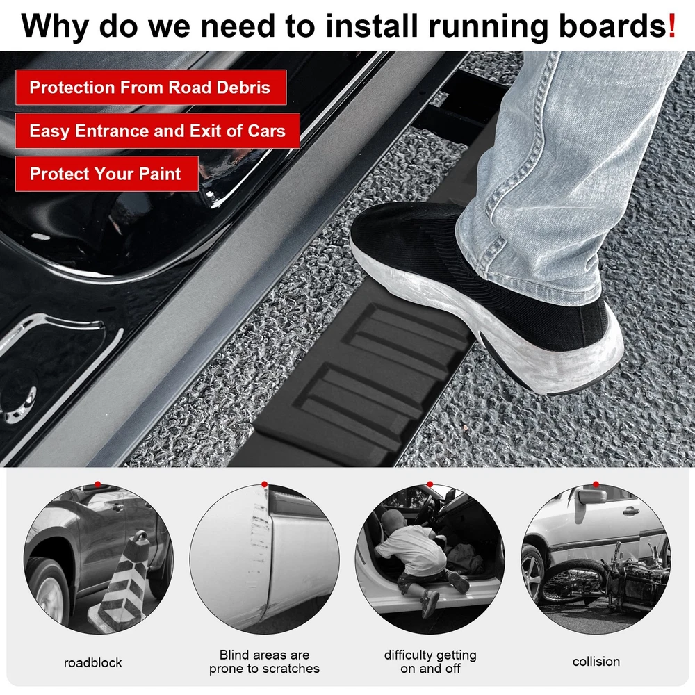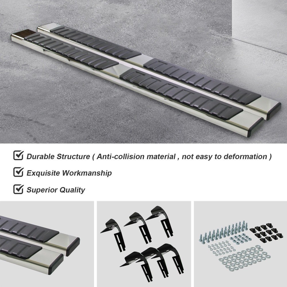 Specification Type: Running Board Color: Black+Silver Finish: Polished Placement on Vehicle: Left, Right Material: ABS, Stainless Steel Items Included: Mounting Hardware Package Dimensions (LengthxWidthxHeight:inch): 80.12*9.06*8.46 Package Weight (LB): 50.49 Fitment 1999-2016 Ford F-250 Super Duty 1999-2016 Ford F-550 Super Duty 1999-2016 Ford F-450 Super Duty 1999-2016 Ford F-350 Super Duty Features & Benefits 1. High Strength Mounting Bracket: The Running Board features a high-strength mounting bracket that can hold up to 450 lbs, ensuring durability and stability during use. 2. Durable and Rust-Resistant: Constructed from durable, rust-resistant stainless steel and ABS, this Running Board is designed to withstand the test of time and harsh weather conditions. 3. Easy Installation: The Running Board boasts an easy bolt-on installation design, with most models requiring no cutting or drilling. An accurate screw hole ensures a hassle-free installation process. 4. Slip-Resistant: The Running Board is equipped with large slip-resistant step pads, providing a safe and secure stepping surface to prevent slips and falls. 5. Professional Installation Recommended: While the installation process is straightforward, professional installation is highly recommended to ensure the Running Board is correctly and securely fitted.