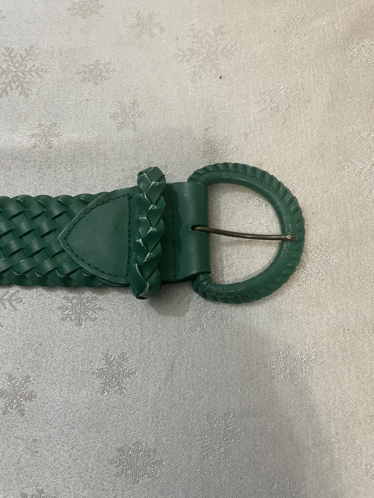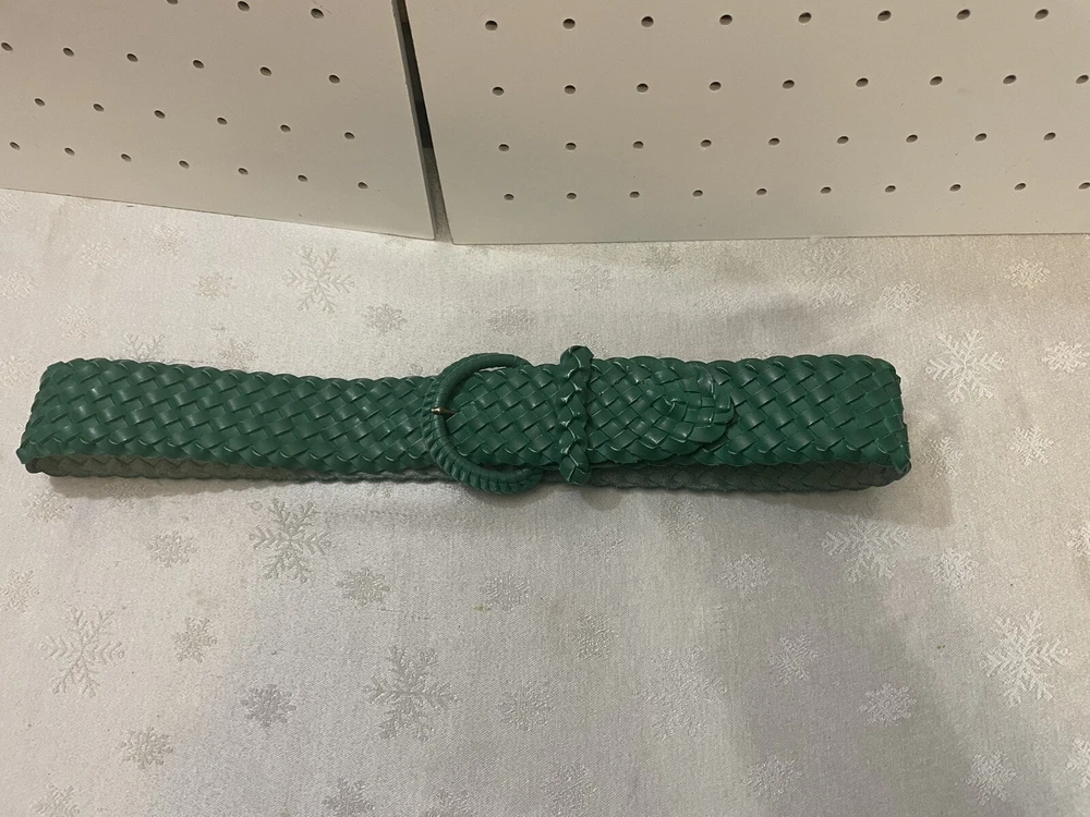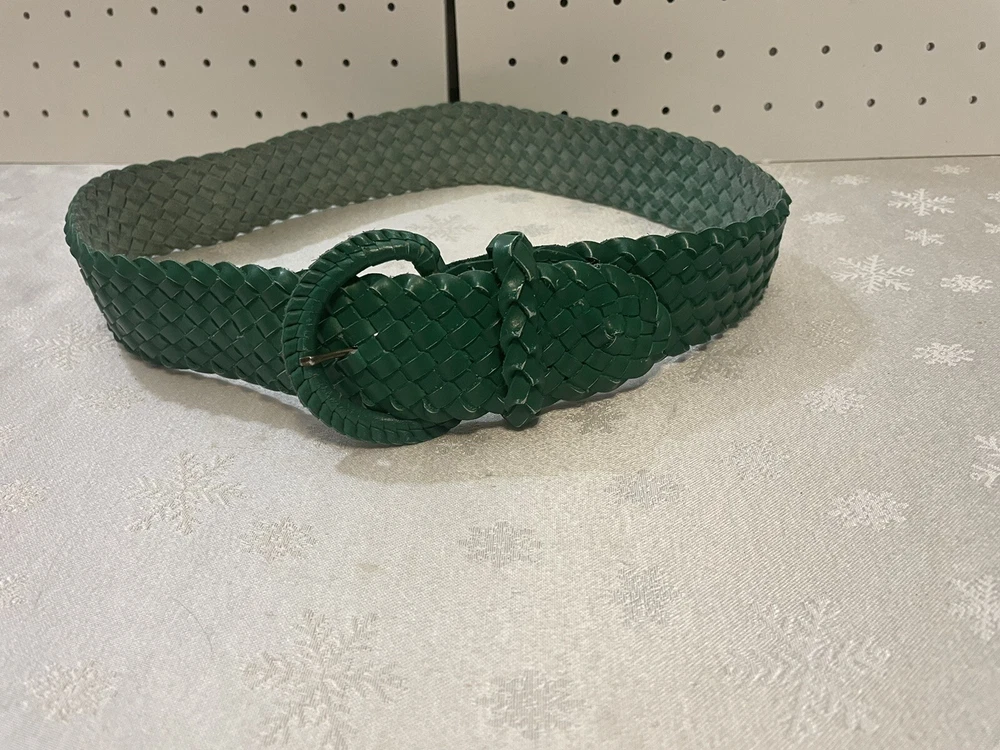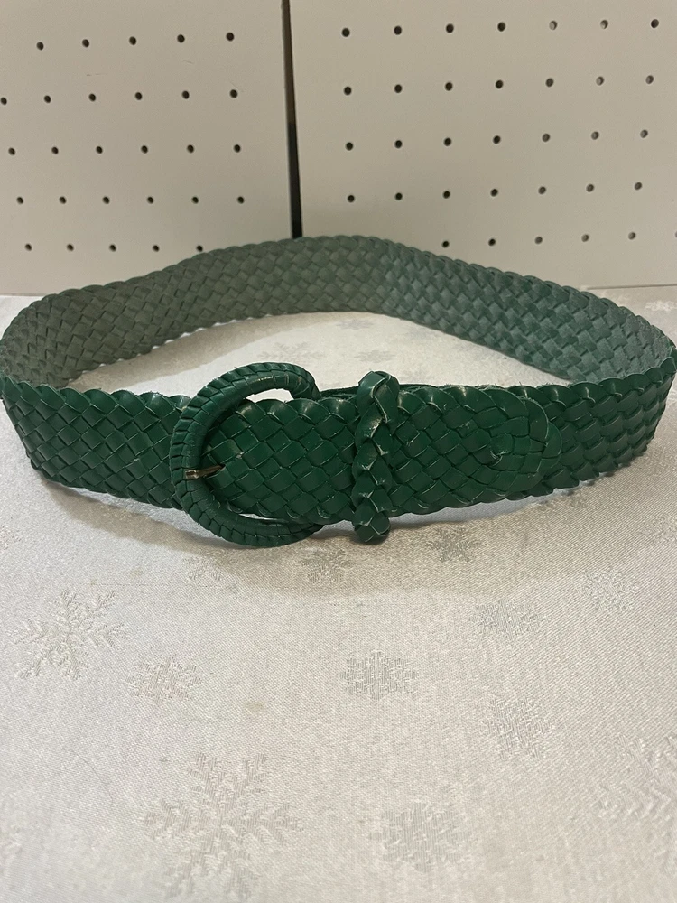 Add a touch of bohemian style to your wardrobe with this beautiful forest green woven belt for women in size 36. Made in Mexico, this belt features a solid pattern and is crafted from genuine leather with stainless steel buckle hardware. The adjustable belt is perfect for any hippie, cowgirl, or bohemian-themed outfit and is sure to make a statement. The vintage-inspired design of this belt is complemented by its 90s theme and classic style. The buckle accents and green color make it a versatile accessory that can be paired with any outfit. Whether you're looking for a unique addition to your wardrobe or a handmade gift for a loved one, this woven belt is a must-have. Great Condition- Smoke Free home- Thanks for stopping in check out my online thrift stuff added daily much love Shelly J 💚