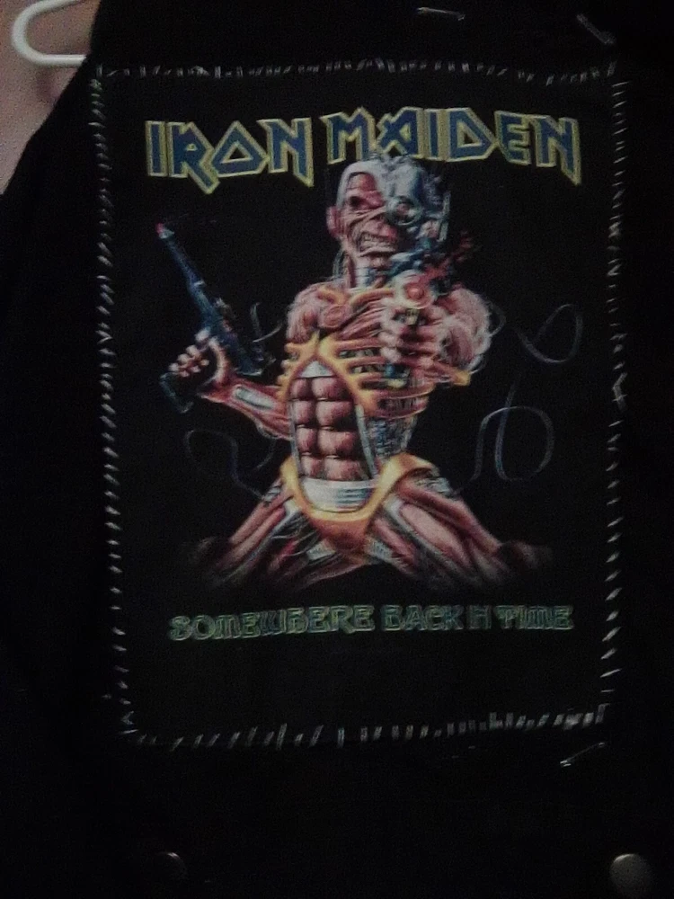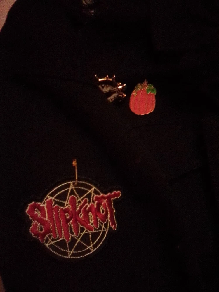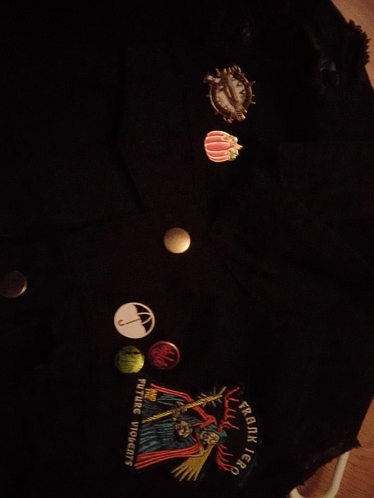 Denim, decorated jacket with pins and patches. MCR, hardcore, punk, emo jacket. Dark/ black. Used, a little messy diy. Size medium, technically women's but pretty unisex.