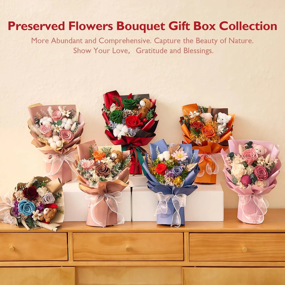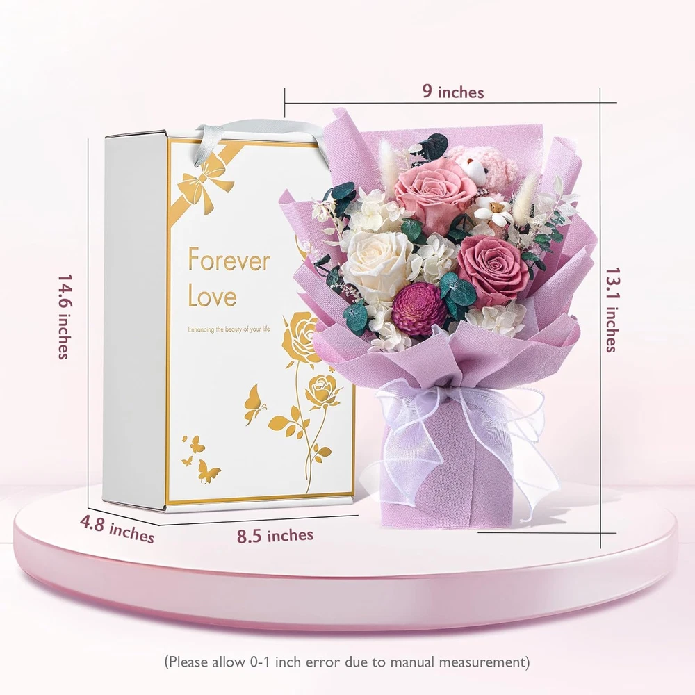 Forever Flower Bouquet Purple Flower Bouquet Preserved Roses with Bear Gift Box Real flowers bouquet that last over a year: Our preserved flowers bouquet is crafted from 100% real flowers. These flowers undergo a delicate preservation process to maintain their natural beauty and integrity, while being carefully dyed with rich, vibrant colors. These flowers stay fresh, bright, and colorful for over a year without fading or losing their charm. Romantic Gift for Her: This forever flower bouquet is a perfect gift for your loved one on Valentine's Day, Graduation, Birthday or engagement. With these romantic forever flowers, you can make her day extra special and show her just how much you care. Hand-Made Flowers Bouquet: All preserved bouquets are designed and hand-made by our florists. The flowers fresh bouquets are handcrafted from preserved roses, hydrangeas, fern leaves, rabbit tail grass, sola flower etc. A cute bear makes this bouquet more adorable and an ideal gift for loved ones. Elegant home decor: The forever bouquet is hand-made by skilled florists and carefully placed in a beautifully designed vase. This elegant flower arrangement is designed to create a romantic, naturally refined atmosphere that complements modern home decor. Its timeless beauty adds a touch of sophistication, making it a perfect addition to any elegant home decor. Zero maintenance Care: Our roses bouquets hold beauty and a natural and fresh look, with no maintenance required. No need to water or add sunlight. The pollen is removed, so you don't have to worry about allergies either. Product Description Hot Pink Forever Flower Bouquet Gift Box Light Blue Forever Flowers Bouquet Gift Box Purple Forever Flowers Bouquet with Bear Gift Box Preserved Flowers Bouquet Roses Gift Box 7-Piece Soap Roses Bouquet Gift Box for Her Preserved Sunflower Bouquets with Bear Gift Box Preserved Roses Bouquet Gift Box Collection Our bouquets are made up of real flower, including roses, hydrangeas, eucalyptus leaves, bunny tails, sola flower etc. Using a non-toxic preserved process, they can last for over a year. Whether on Valentines Day, Birthday, Anniversary, Mother's Day, Wedding, this enchanting floral arrangement is sure to leave a lasting impression. The video showcases the product in use. The video guides you through product setup. The video compares multiple products. The video shows the product being unpacked. Real Flowers Our bouquets are made up of real flower, which undergo an intricate process to preserve the quality and integrity of the petals over a year. Exquisite Gift The packaging box is exquisitely designed and can be given as a gift without repackaging. Gift Package: 8.5 x 4.8 x 14.1 inches. Forever Love This preserved bouquet is an ideal gift for your wife, mother, grandma, girlfriend or significant other. Gift for Any Occasion This forever bouquet is perfect for Valentines Day, Mother's Day, birthdays, anniversaries, or simply as a gesture of love and appreciation. Forever Roses Bouquet Gift Box Collection Customer Reviews 4.2 out of 5 stars 92 4.5 out of 5 stars 14 4.1 out of 5 stars 10 4.3 out of 5 stars 19 4.1 out of 5 stars 12 4.6 out of 5 stars 22 4.5 out of 5 stars 10 Price $33.99 $ 33 . 99 $42.49 $ 42 . 49 $39.99 $ 39 . 99 $39.99 $ 39 . 99 $33.99 $ 33 . 99 $33.99 $ 33 . 99 — Flowers Perserved Roses — Perserved Roses Perserved Roses Perserved Roses Perserved Roses Perserved Sunflower Gift Box ✔ ✔ ✔ ✔ ✔ ✔ ✔ Wraped Paper Purple Hot Pink Light Blue Purple Blue Orange Green Gift for wife, mother, girlfriend — wife, mother, girlfriend wife, mother, girlfriend wife, mother, girlfriend wife, mother, girlfriend wife, mother, girlfriend Occasion for Valentines Day, Mother's Day Valentines Day, Mother's Day Valentines Day, Mother's Day Valentines Day, Mother's Day Valentines Day, Mother's Day Valentines Day, Mother's Day Graduation What are preserved flowers? Preserved flowers are natural flowers but can last over a year. Once the flowers start to bloom, they are picked and immersed in a non-toxic, drying compound that draws out the moisture and then dyed with various colors. How to maintain preserved flowers? 1.DO NOT water preserved flower or allow it to get wet for any reason. 2.DO NOT expose it to direct sunlight or other strong light. What kind of occasions are preserved flowers suitable for? This eternal flowers will be a last forever keepsake gift for Birthday, Valentine Day, Mother's Day, Marriage proposals, Weddings, Anniversaries, and Christmas, etc. Item model number HS-3 Item dimensions L x W x H 9.5 x 5.1 x 14.6 inches Plant or Animal Product Type Rose Color Purple Product Dimensions 9.5 x 5.1 x 14.6 inches; 1.26 Pounds Country of Origin China Number of Items 1 Shipping Fast shipping is very important for us. Our standard US shipping service is FREE. Your order will be shipped within 2-3 business days upon full payment received. Your order will be delivered within 2-3 business days after the handling time. We only ship to the confirmed PayPal address. We reserve the right to cancel any order for any reason at any time. We are not responsible for undeliverable addresses. Returns and payment We offer a 30 days return policy from checkout winning date. We allow only PayPal as payment method FeedBack Your feedback very important to us, after you get your package and you are satisfied with our service please leave us positive feedback If you have any problem with your order / any questions please before leave any type of feedback For any questions, using eBay contact system Please visit our eBay store to check out other items for sale! Thank you for shopping at our store.