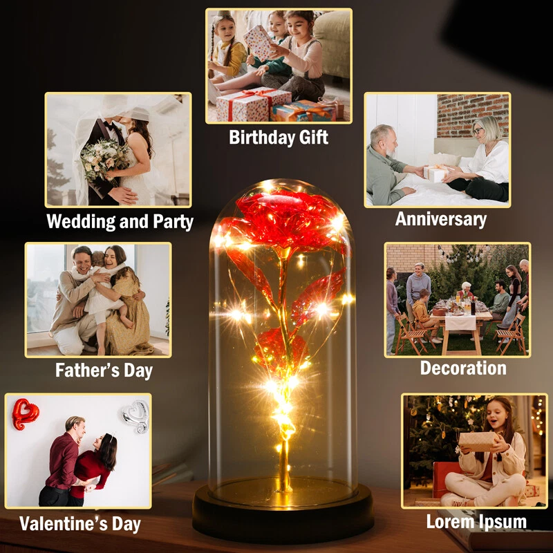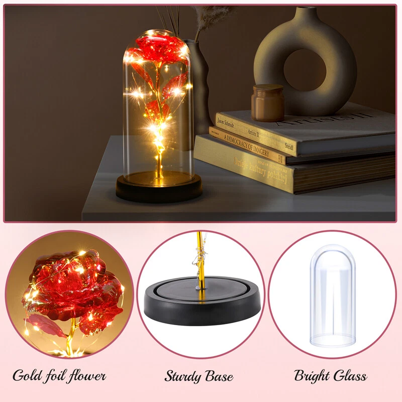 Mother's Day Mom Gifts Mothers Day Glass Rose Flowers Gifts for Mom Wife Grandma 🌹Red Rose Whisper🌹 -- Love, Passion, Beautiful love. 🌹Golden Rose Whisper🌹-- Noble, Beautiful, Apologetic. 🌹Red and Golden Rose Whisper🌹-- Happiness. 🌹Blue Rose Whisper🌹-- Miracles, Pure, impossible. 🌹Purple Rose Whisper🌹-- Deep Love, Mysterious and Noble. 🎁 Valentines Day Gifts For Her, Mom Gifts, gifts for grandma,valentines rose in Glass Dome perfectly and eternally, crystal clear Glass Dome. Colorful artificial flower rose gifts will never wither and die. The blue Rose Flower Gifts is perfect and impeccable,represent love,colorful roses stand for love and warm. Rose flower is as full of infinite hope and beauty. And it will bring her infinite love and beauty. Rose gifts for her. 🎁 Perfect Valentines day gifts for woman who has everything,cute women gifts. Women Gifts For Moms which are Awesome and Totally Thoughtful. Glass dome rose also would look amazing her gifts in your living room or bedroom. Unique rose flower gift for women,girlfriend,wife,mom,grandma,mother-in-law and stepmom,etc. Birthday presents for women. Mom valentines day gifts. 🎁 Light Up Rose Mom Gifts For Womens. Valentines day gifts for mom from daughter. Valentines day gifts for sister,Valentines day gifts for her. Crystal artificial Rose in a glass dome is wrapped around an LED Strip light,Powered by 3 x AAA batteries(include). Led strip light bright warm white lighting. The beautiful rose flower gift can use in daytime and nighttime for home room or create romantic atmosphere,Valentines glass rose is symbol of appreciation,best wishes,love and romantics. #12618-12619-12620-12621 Pink/Purple/Blue/Red LED Rose Flower+Glass Dome: -- Rose Flower: Made of high-quality plastic, which makes the rose and petals look very real, and also covered with a transparent dome, which can protect the rose flower and enjoy the beauty of the rose in 360°. -- Romantic Symbol: This is a beautiful LED light rose, which means enthusiasm and romance, not only eternal love, but also a symbol of good wishes. -- LED Roses: Roses wrapped around the LED light strip, powered by batteries, can be used for home decoration or create a romantic atmosphere during the day and night. -- Wide Application: Not only can be used as a living room or bedroom decoration, but also can be used as a gift for relatives or friends, very suitable for home decoration, holiday gifts, etc. Specification: Light color: warm white Material: plastic Lighting mode: always on Uses: suitable for home decoration, holiday gifts, etc. Battery Type: 1.5V*AAA battery (NOT Included) Product size: 20.5 (height) *11 (bottom diameter) *9cm/8.07*4.3*3.5inch Package includes: 1xRose Flower Lamp 1x Packing Box #12449 Colorful LED Rose Flower+Kiss Doll: -- Rose Flower: This colorful foil gold rose flower is made of high-quality plastic with a stable and smooth surface, the roses and petals displayed look very real, and it is also covered with a transparent dome that protects the rose flower and makes it timeless. -- LED Rose: The rose is wrapped around the colorful LED light strip, powered by 3 AAA batteries (included). When turned on at night, it will light up with colorful constant lights, creating a romantic atmosphere for your home and bedroom at night. -- Romantic Symbol: The built-in kissing toy for little boys and girls is very cute. The rose will bring you infinite love and beauty. It not only symbolizes eternal love, but also a symbol of good wishes. -- Wide Application: Not only can be used as a decoration in the living room or bedroom, but also as a gift for relatives or lovers, very suitable for home decoration, holiday gifts, etc. Specification: Flower color: colorful Light color: multicolor Material: plastic Lighting mode: always on Battery type: 1.5V*AAA battery (NOT Included) Usage: Suitable for home decoration, holiday gifts, etc. Product size: 21.5 (height)*11 (bottom diameter)*9 (thickness) cm/8.46*4.3*3.5inch Package includes: 1x Rose Flower Night Light 1x Packing Box #12450 Red LED Rose Flower+Kiss Doll: -- Rose Flower: This colorful foil gold rose flower is made of high-quality plastic with a stable and smooth surface, the roses and petals displayed look very real, and it is also covered with a transparent dome that protects the rose flower and makes it timeless. -- LED Rose: The rose is wrapped around the colorful LED light strip, powered by 3 AAA batteries (Included ). When turned on at night, it will light up with colorful constant lights, creating a romantic atmosphere for your home and bedroom at night. -- Romantic Symbol: The built-in kissing toy for little boys and girls is very cute. The rose will bring you infinite love and beauty. It not only symbolizes eternal love, but also a symbol of good wishes. -- Wide Application: Not only can be used as a decoration in the living room or bedroom, but also as a gift for relatives or lovers, very suitable for home decoration, holiday gifts, etc. Specification: Flower color: red Light color: multicolor Material: plastic Lighting mode: always on Battery type: 1.5V*AAA battery (NOT Included ) Usage: Suitable for home decoration, holiday gifts, etc. Product size: 21.5 (height)*11 (bottom diameter)*9 (thickness) cm/8.46*4.3*3.5inch Package includes: 1*Rose Flower Night Light 1*Packing Box #12451 Colorful LED Rose Flower+Glass Dome: -- Rose Flower: This colorful foil gold rose flower is made of high-quality plastic with a stable and smooth surface, the roses and petals displayed look very real, and it is also covered with a transparent dome that protects the rose flower and makes it timeless. -- LED Rose: The rose is wrapped around the colorful LED light strip, powered by 3 AAA batteries (Included ). When turned on at night, it will light up with colorful constant lights, creating a romantic atmosphere for your home and bedroom at night. -- Romantic Symbol: The rose will bring you infinite love and beau