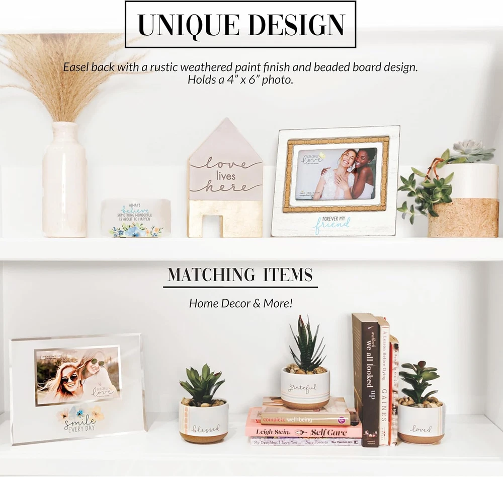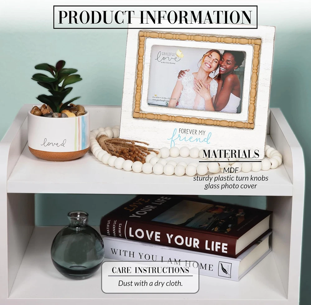 Store New Arrivals Add to Favorite View Feedback Contact - Forever My Friend - MDF Wood Frame with Decorative Trim - Holds 6 X 4-Inch Horizontal Photo, 1 Count, 8.75 X 7.5-Inches Overall in Size,White Description Item model number 77227 Style Modern Number of Items 1 Pattern Textured Country of Origin China Theme Friends Unit Count 1.0 Count Batteries required No Target Audience Adult Frame Material MDF, glass, and plastic. Finish Type Whitewashed Frame Type Single Picture Frame Item Weight 10.4 ounces Occasion Christmas, Birthday Special Feature Holds 4x6 picture, Horizontal picture frame, Features natural wood beaded oval pattern along the inner frame, Whitewashed finish Orientation Horizontal Mounting Type Tabletop Color White Cover Material Glass Global Trade Identification Number 00664843772274 Shape Rectangular Back Material Type Medium Density Fiberboard Finish types Whitewashed Product Dimensions 8.75"L x 0.5"W Product Care Instructions Wipe with a dry cloth. It is safely packaged in a protective die-cut box. PREMIUM QUALITY: 8.75' long x 7.5" tall vertical easel back rustic whitewashed picture frame holds a horizontal 6" x 4" photograph. The border surrounding the frame is a natural wood beaded oval pattern. The backside is white in color and features four sturdy thick black plastic turn knobs for image . Materials include MDF, glass, and plastic. IN-HOUSE DESIGN: The bottom area has a gray/teal blue "Forever My Friend" screen-printed sentiment. The overall look of the frame is rustic, modern, and whitewashed. PERFECT GIFT: Excellent for any bestie who has blessed your life. Best for birthdays or other holiday celebrations. Give them the gift of a loving and perfectly captured moment to remember even when they can't be with you. A present to hold their cherished moments with their favorite people to display in their home for years to come. CARE INSTRUCTIONS: Wipe with a dry cloth. It is safely packaged in a protective die-cut box. MORE PRODUCTS: We offer thousands of friend-themed items and a wide selection of photo frames to commemorate all sorts of special events. Check out our storefront to satisfy your gifting needs for everyone on your list. This beautiful wood frame is designed by artist Blue Chair Blessing. Frame has a rustic white wash design with a decorative beaded tan trim. The sentiment “Forever My Friend'' is printed onto the center bottom of this elegant yet simple frame. The back is made from thick cardboard-like material and features a hinged easel for displaying on a desk, mantel, nightstand or bookshelf with two metal tabs for photo . Frame comes packaged in a plain white box and measures 8.75” x 7.5” inches. ABOUT US We offer the best prices around on high quality products. Our E-store includes media such as books, movies, music and games while offering electronics, toys, sporting apparel, clothing, tools, general home, garden items and more. SHIPPING We are always working hard to ensure your package arrives as soon as possible. Please understand that some factors like weather, high postal traffic, and the performance of shipping companies are outside of our control. We offer free shipping to the lower 48 states and ship within 2 business days of payment, usually sooner. We do not accept P.O. Boxes. Please provide a physical address. For shipping outside of the continental USA, we only use eBay's Global Shipping Program.The item is shipped to KY and then sent to the rest of the world. International customers are responsible for all duties and taxes. Continue to check out in order to calculate costs for shipping the item to your country. Messages regarding eBay's Global Shipping Program MUST be directed at eBay EXCLUSIVELY. RETURNS We offer a 30-Day Return Policy on items which you are not completely satisfied with. You have the option for a full-refund or an exchange of the item. No returns are available on items shipped outside of the USA. PAYMENT We accept PayPal. CONTACT US This page content is yet to come Please ad us to your favorite seller and visit again later Thank You CUSTOMER SATISFACTION We try our very best to make sure every customer is completely satisfied. If there's a problem, message us! We're happy to help. WE ACCEPT Copyright © 2021 AutoDS. | All Rights Reserved
