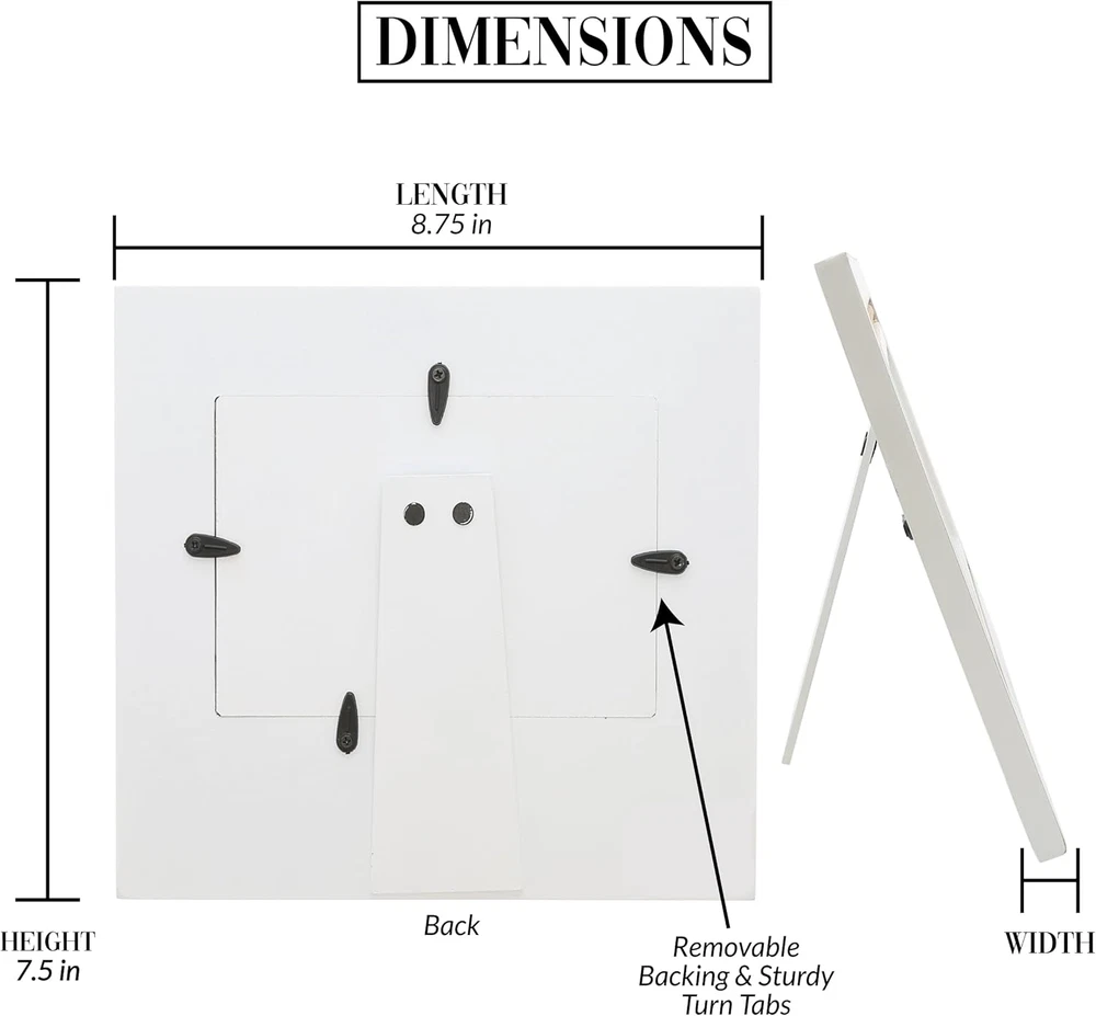 Target Audience: Adult Orientation: Horizontal Mounting Type: Tabletop Frame Type: Single Picture Frame Occasion: Christmas, Birthday Finish types: Whitewashed Special Feature: Holds 4x6 picture, Horizontal picture frame, Features natural woo Item Weight: 10.4 ounces Frame Material: MDF, glass, and plastic. Product Care Instructions: Wipe with a dry cloth. It is safely packaged in a protective die- Item Width: Does not apply Theme: Friends Brand: Does not apply Type: Does not apply Shape: Rectangular Style: Modern Item model number: 77227 Color: White Global Trade Identification Number: 00664843772274 Country of Origin: China Finish Type: Whitewashed Item Height: Does not apply gtin13: 7445024682611 Pattern: Textured Item Length: Does not apply Cover Material: Glass Number of Items: 1 Unit Count: 1.0 Count Back Material Type: Medium Density Fiberboard UPC: 7445024682611 Product Dimensions: 8.75"L x 0.5"W Batteries required: No