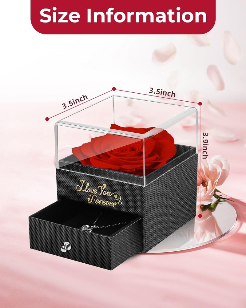 This forever rose and necklace set is absolutely stunning—the perfect Valentine's or Christmas gift! The preserved rose looks elegant in its chic gift box, and the matching necklace adds a beautiful touch. My girlfriend loved it! Great quality and thoughtful packaging—highly recommend for any special woman in your life.