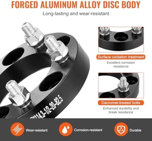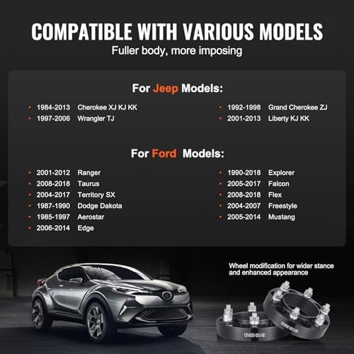 Enhanced Driving Safety: These wheel spacers increase the axle track by 1 inch, widening the wheel track to lower the vehicle's center of gravity. This effectively solves severe body sway during high-speed cornering, significantly improving the vehicle's grip, stability, and handling. Product Specifications: Our wheel adapters includes 4 wheel spacers, each with a thickness of 1 inches (25.4mm), a bolt pattern of 5 x 4.5 in(5 x 114 mm), a hub bore of 3.25'' (82.5mm), and a thread pitch of 1/2"-20. Please carefully check your vehicle's manual specifications before purchasing to ensure compatibility. Wide Compatibility: These wheel spacers are compatible with many Jeep and Ford vehicles from 1984 to 2013, including: Jeep: 1984-2013 Cherokee XJ KJ KK, 1997-2006 Wrangler TJ, 1992-1998 Grand Cherokee ZJ, 2001-2013 Liberty KJ KK. Ford: 1985-1997 Aerostar, 1987-1990 Dodge Dakota, 1990-2018 Explorer, 1992-2011 Crown Victoria, 2001-2012 Ranger, 2005-2017 Falcon, 2006-2014 Edge, 2008-2018 Taurus, 2008-2018 Flex, 2004-2017 Territory SX, 2004-2007 Freestyle, 2005-2014 Mustang. Forged Aluminum Alloy: The spacers are forged from 6061-T6 aluminum alloy, providing exceptional strength and wear resistance, making them more robust and durable. The surface has a Dacromet coating for oxidation resistance and heat treatment, ensuring high precision and stability while enhancing hardness and corrosion resistance. All spacers come with grade 10.9 bolts. Easy Installation: The precisely machined wheel spacers feature an intuitive design and clear instructions for simple and quick installation. Each pair of wheel spacers comes with a user manual, detailing the specific installation steps. Note: Do not use an impact wrench; it is recommended to use a manual wrench.