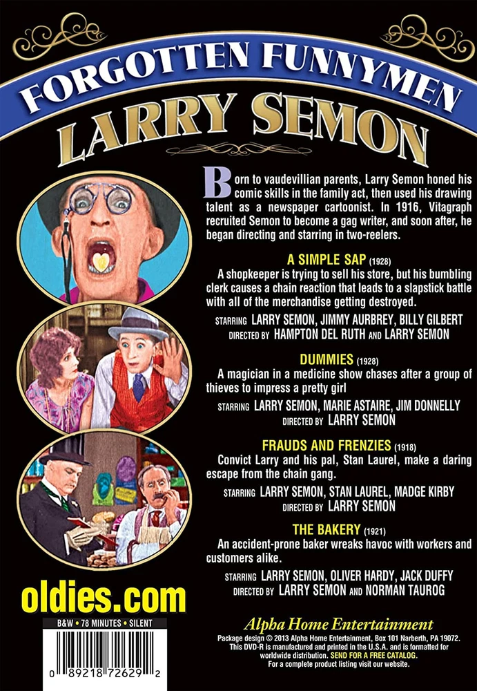 Further Details Title: Forgotten Funnymen - Larry Semon Format: DVD Condition: New Number Of Discs: 1 Genre: Comedy Actors: Larry Semon, Betty Amann, Marie Astaire, Stan Laurel, Oliver Hardy Director: Hampton Del Ruth, Larry Semon, Norman Taurog Audio Language: English Runtime: 78 Region Code: DVD: 1 (US, Canada...) Studio: Alpha Video Certificate: MPAA Not Rated Description: Born to vaudevillian parents, Larry Semon honed his comic skills in the family act, then used his drawing talent as a newspaper cartoonist. In 1916, Vitagraph recruited Semon to become a gag writer, and soon after, he began directing and starring in two-reelers. A Simple Sap (1928): A shopkeeper is trying to sell his store, but his bumbling clerk causes a chain reaction that leads to a slapstick battle with all of the merchandise getting destroyed. Starring Larry Semon, Jimmy Aurbrey, Billy Gilbert; directed by Hampton Del Ruth and Larry Semon. Dummies (1928): A magician in a medicine show chases after a group of thieves to impress a pretty girl. Starring Larry Semon, Marie Astaire, Jim Donnelly; directed by Larry Semon. Frauds and Frenzies (1918): Convict Larry and his pal, Stan Laurel, make a daring escape from the chain gang. Starring Larry Semon, Stan Laurel, Madge Kirby; directed by Larry Semon. The Bakery (1921): An accident-prone baker wreaks havoc with workers and customers alike. Starring Larry Semon, Oliver Hardy, Jack Duffy; directed by Larry Semon and Norman Taurog. Aspect Ratio: Audio Format: Color / Black & White: Black & White Special Features: DVDs ARE REGION 1 UNLESS OTHERWISE STATED Missing Information? Please contact us if any details are missing and where possible we will add the information to our listing.