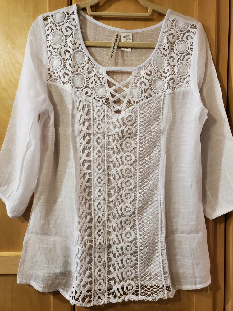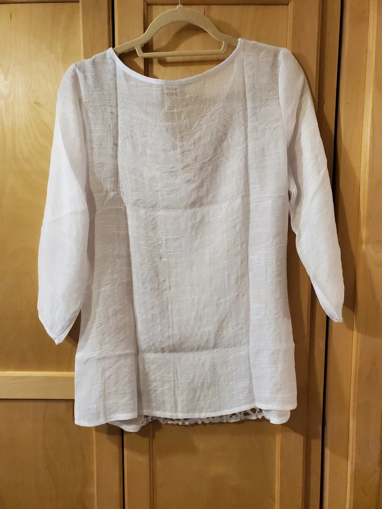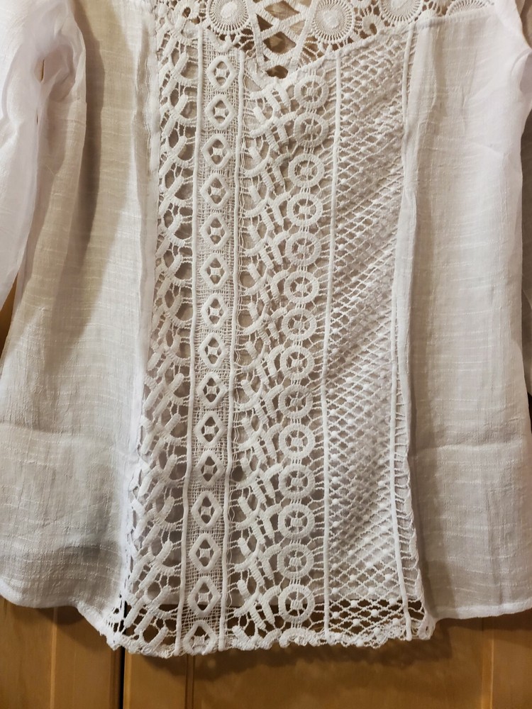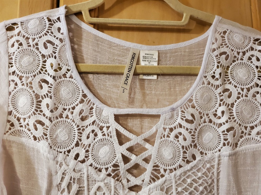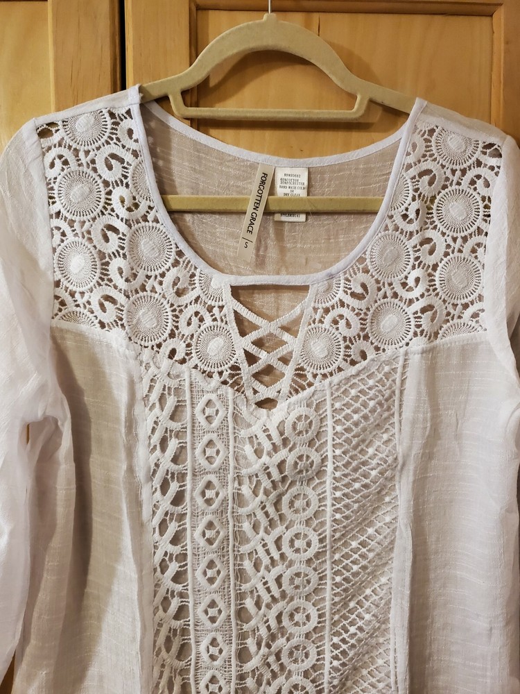 Forgotten Grace White Cotton Blend Embroidered Front Lined Blouse, Size Small Color - White Material - 65% Cotton and 35% Polyester. A very lightweight and soft comfortable material, breathable! Front embroidered center panel is lined. Size - Small Shoulders - 16" Chest - 18.5" Top Length - from center back neck to hem - 24" Sleeve Length 3/4 - 17" Care Instructions: Dry Clean - to maintain the best shape. Check out my other Forgotten Grace items.