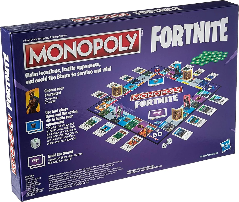 Type:Game BoardModified Item:NoBrand:HasbroYear:2019Custom Bundle:NoGame Title:Monopoly: FortniteUPC:0630509810628Recommended Age Range:13+Theme:FantasyMin. Number of Players:2 playersGame Type:Board GameCharacter Family:Fortnitegtin13:0630509810628Country/Region of Manufacture:China