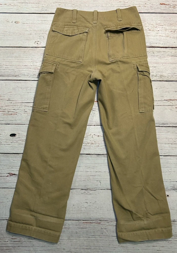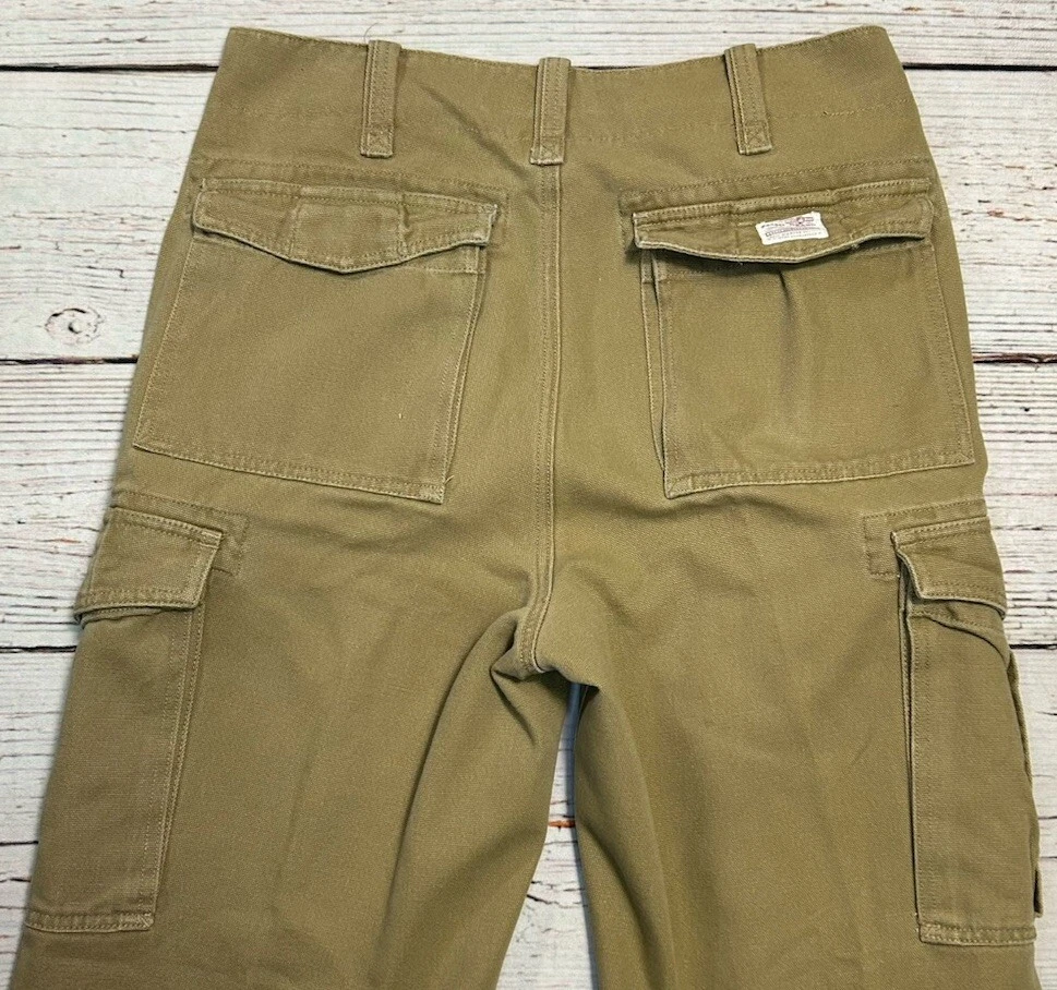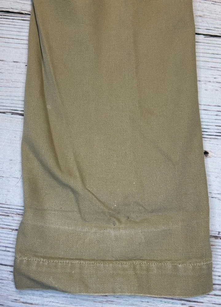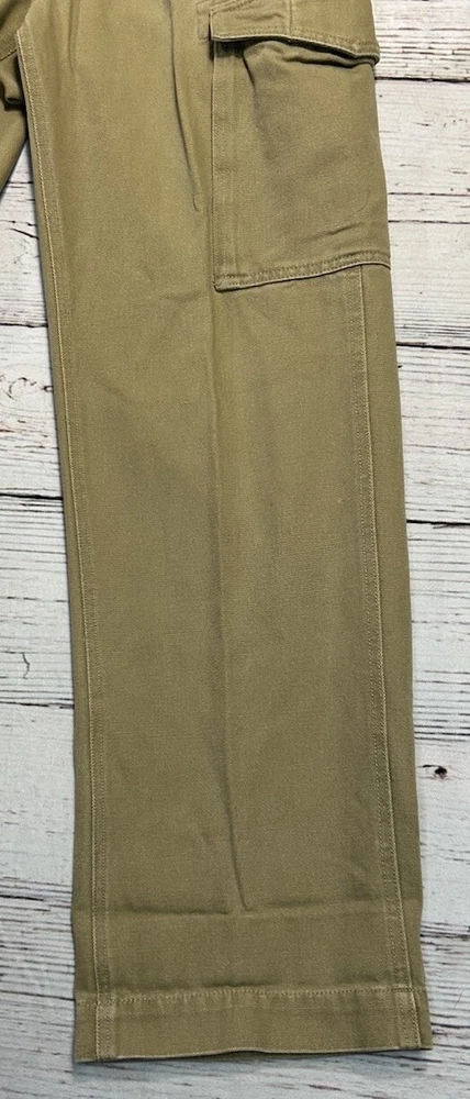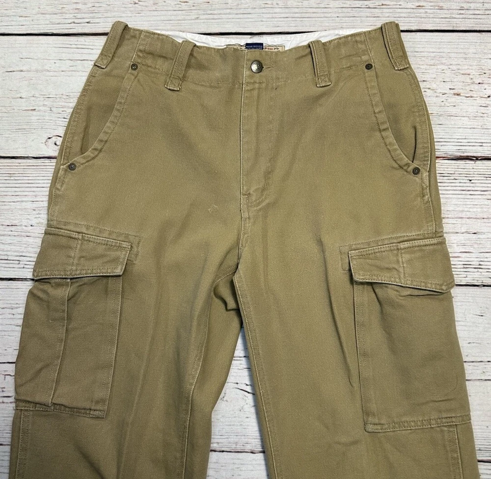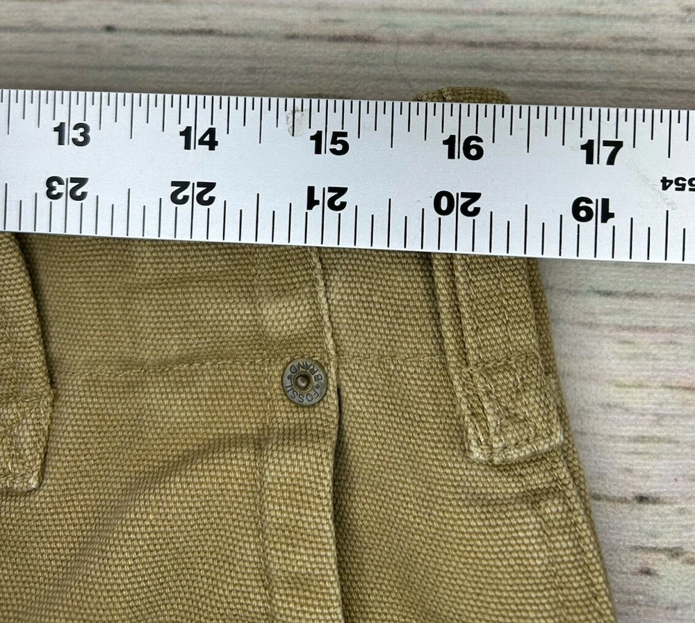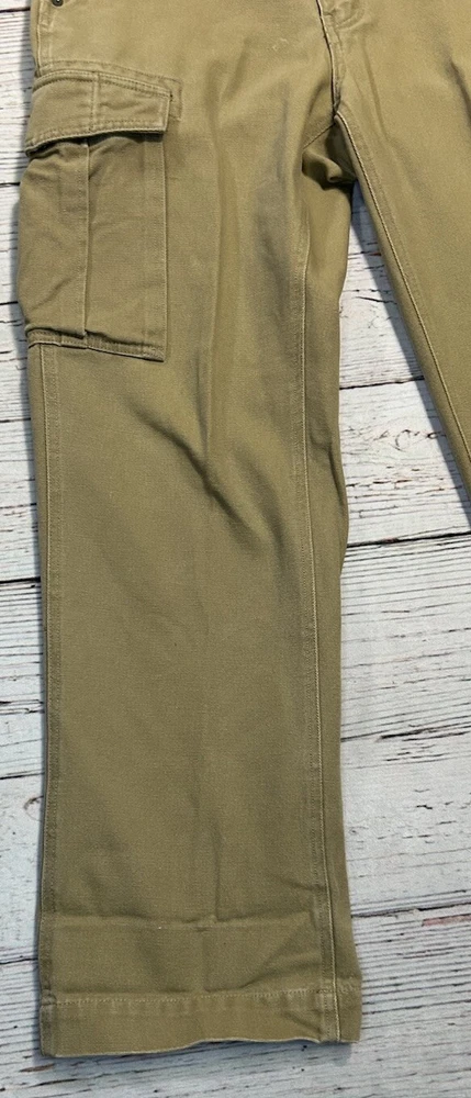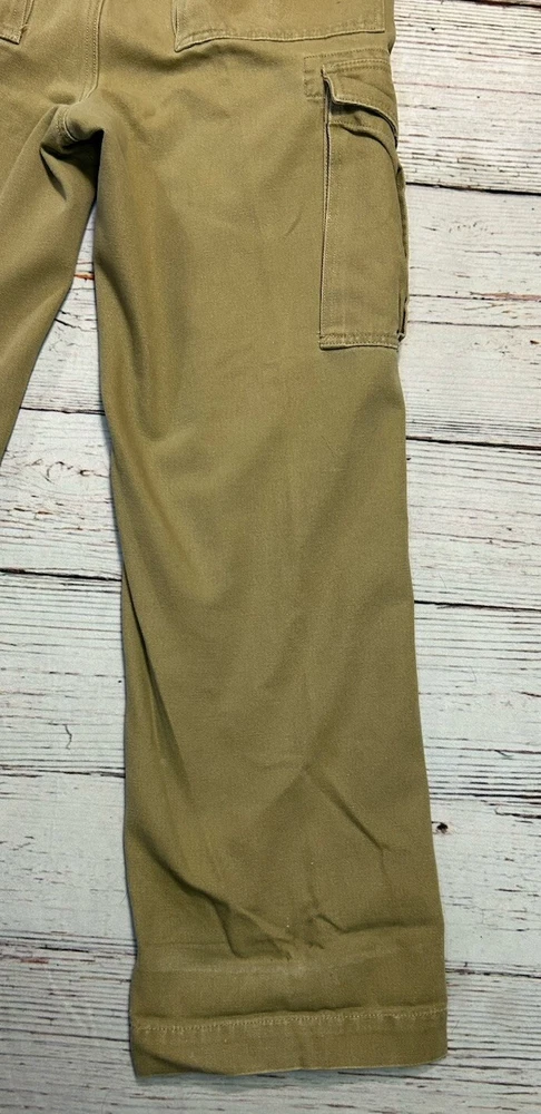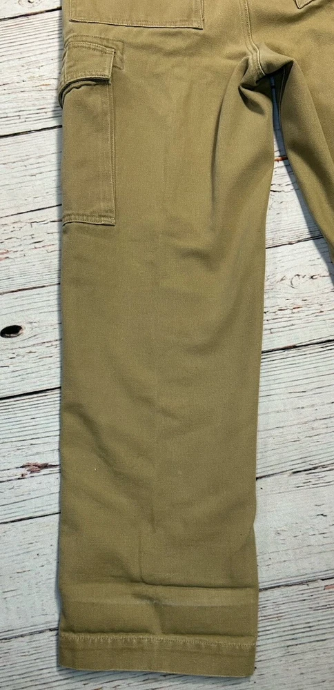 These are Fossil brand cargo pants for men in size 32x32. They are beige in color and made of cotton. The pants feature a zip closure, straight leg style, and mid-rise fit. They have slash pockets and utility cargo pockets. Machine washable for easy care. Perfect for everyday wear. Has some marks. Check pictures for condition and measurements for size.