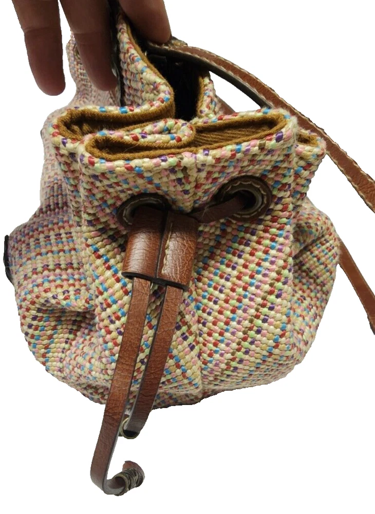 This Fossil satchel bag can be used as a purse tote or cross-body bag Retro sytle with plenty of room to carry your essential items Width 11 inches Height 9 inches Depth of 5 inches. The bag features double wood handles and a detachable leather strap with a 22-inch drop. Multicolor woven pattern The canvas fabric, leather lining, and metal clasp closure provide durability and security. The interior is lined with pockets and an audio pocket to keep you organized. Like New Personal Inventory Used it for a few months after purchasing as NWT. Prefer a full shoulder strap. Personal Inventory purchased NWT last year and used for about 6 months. Time for new home