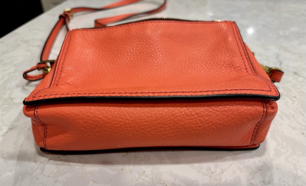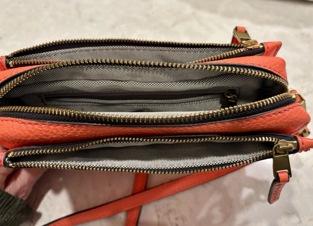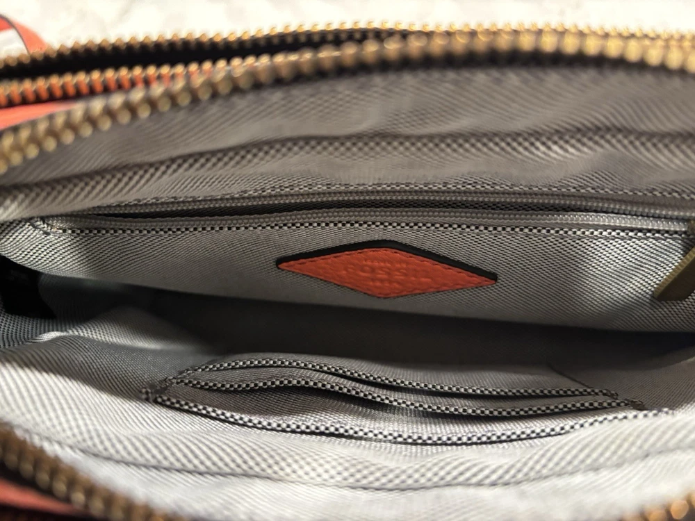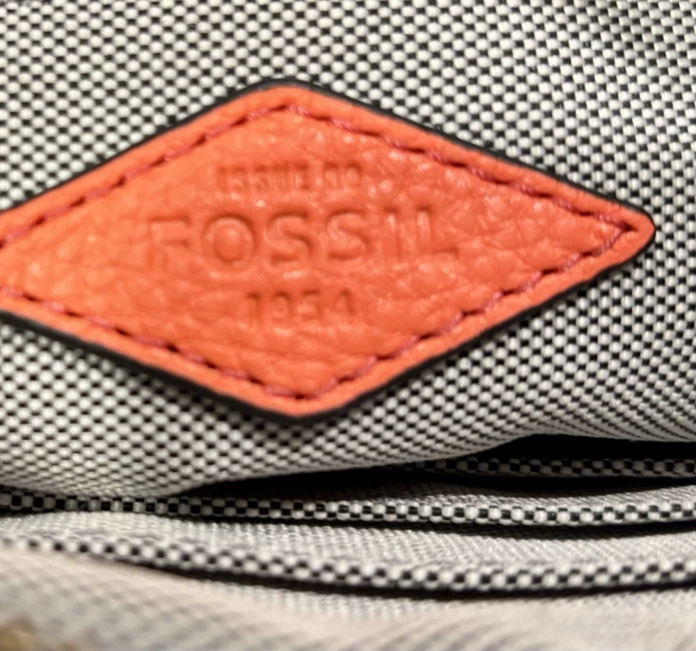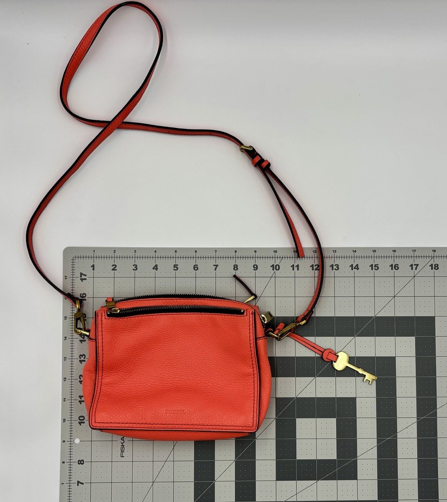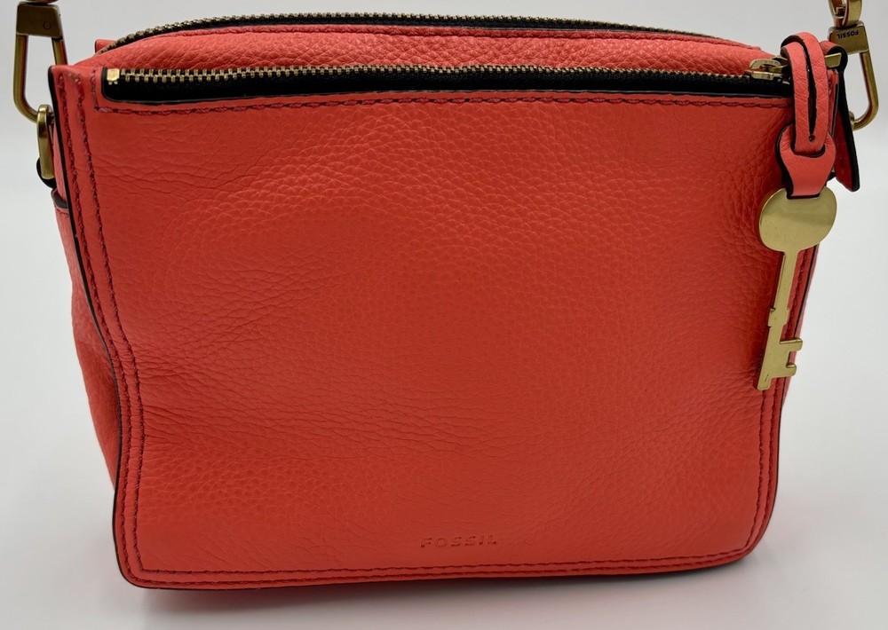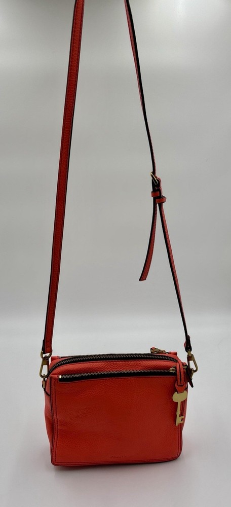 Closure: Zip Handle/Strap Material: Leather Brand: Fossil Lining Material: Fabric Style: Crossbody Department: Women Pattern: Solid Handle/Strap Color: Orange Exterior Color: Orange Handmade: No Country of Origin: China Handle Style: Crossbody Strap Finish: Pebbled Personalize: No Vintage: No Exterior Material: Leather Lining Color: Orange Customized: No Size: Small