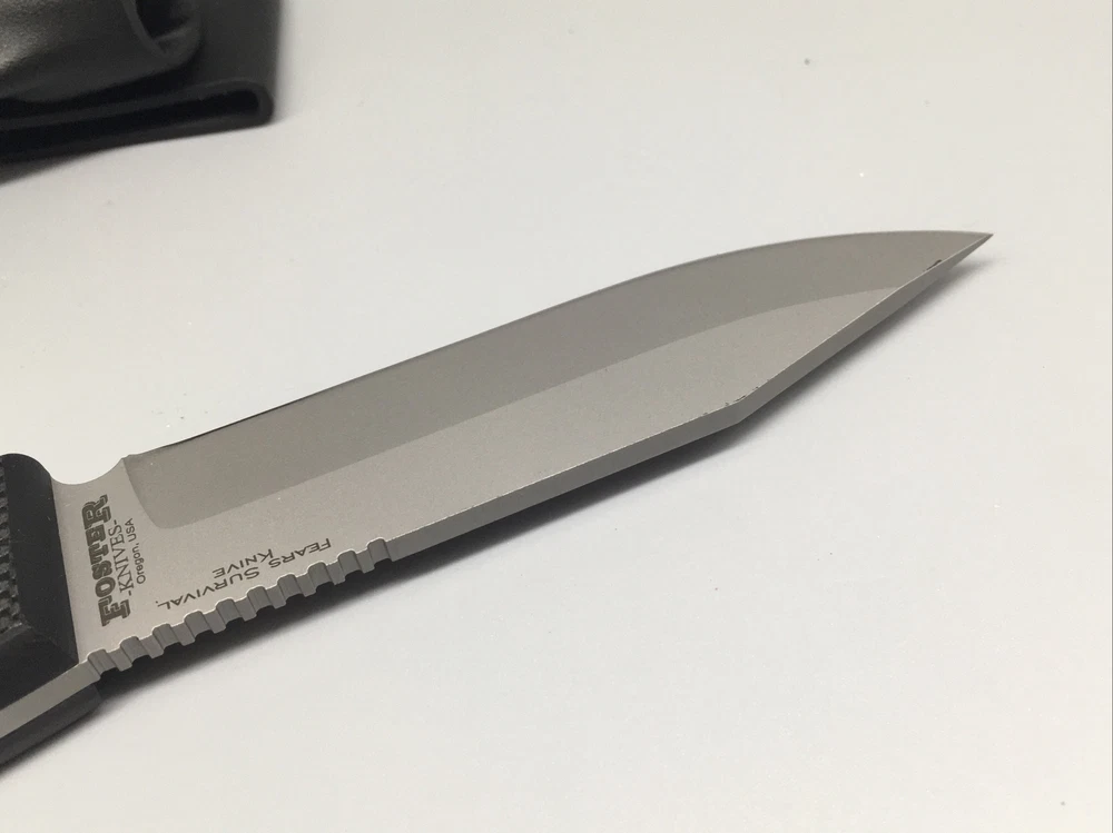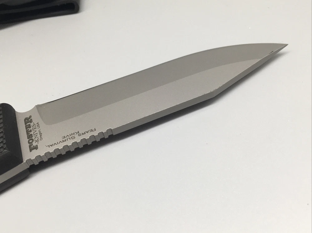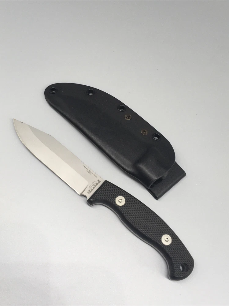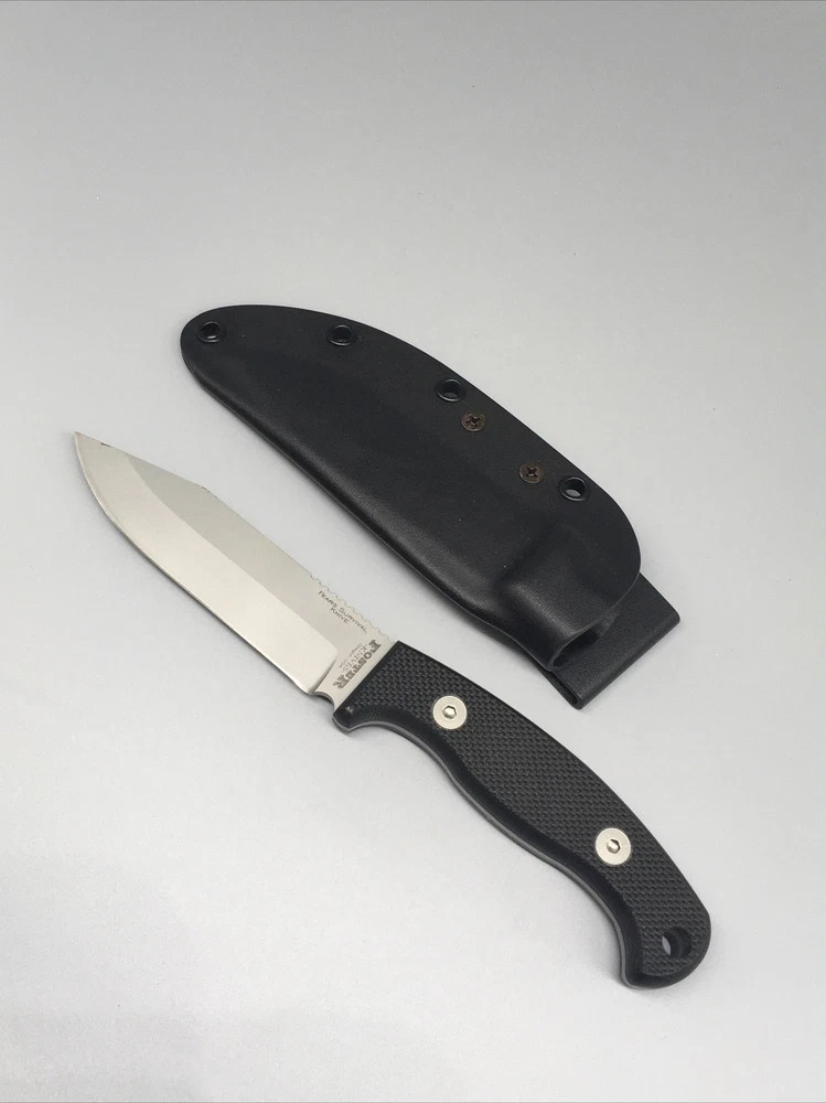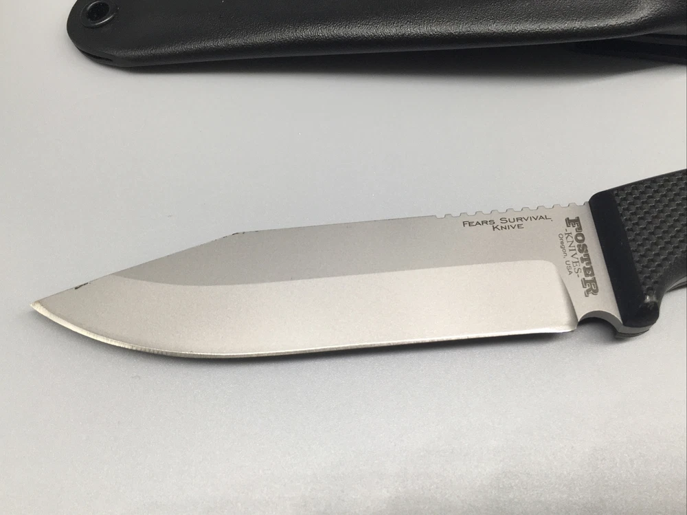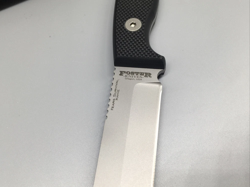 Vintage Foster Fears Survival Knife with Kydex Sheath. Please review pictures for cosmetic condition. Great condition. Some black marks on blade as pictured. I think this may be discontinued and vintage, early 2000s but please do your own research. I saw some excellent reviews about this brand/style. *r3