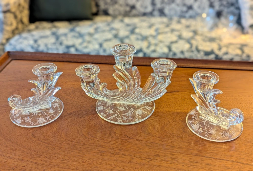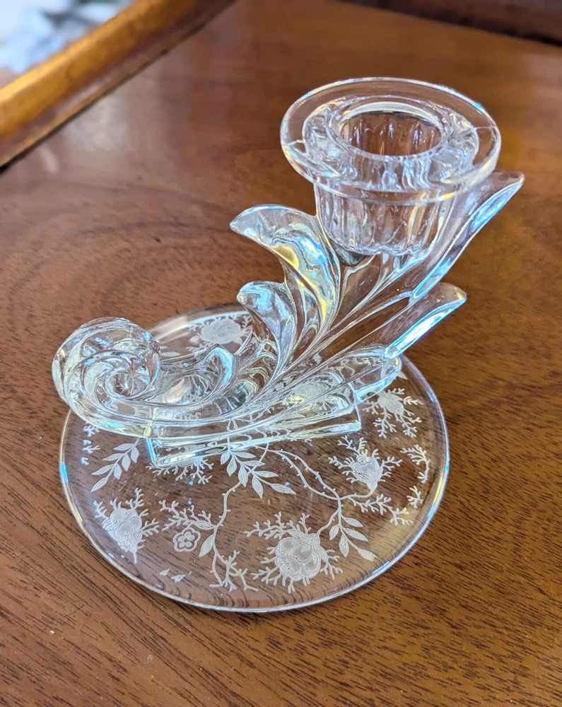 This Fostoria Baroque Etched Chintz Trindle Candle Candlestick Holder Candelabra and Cornucopia Candle Holder set are stunning vintage pieces made of clear crystal glass with elegant etched details. The Fostoria brand is known for its high-quality glassware, and this set is a perfect example with its craftsmanship and beauty. Ideal for adding a touch of vintage charm to your decor or for special occasions. Beautiful and flawless previously owned, likenew condition with no chips, cracks, scratches or discoloration.