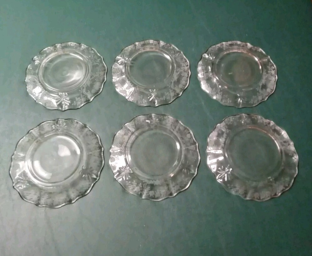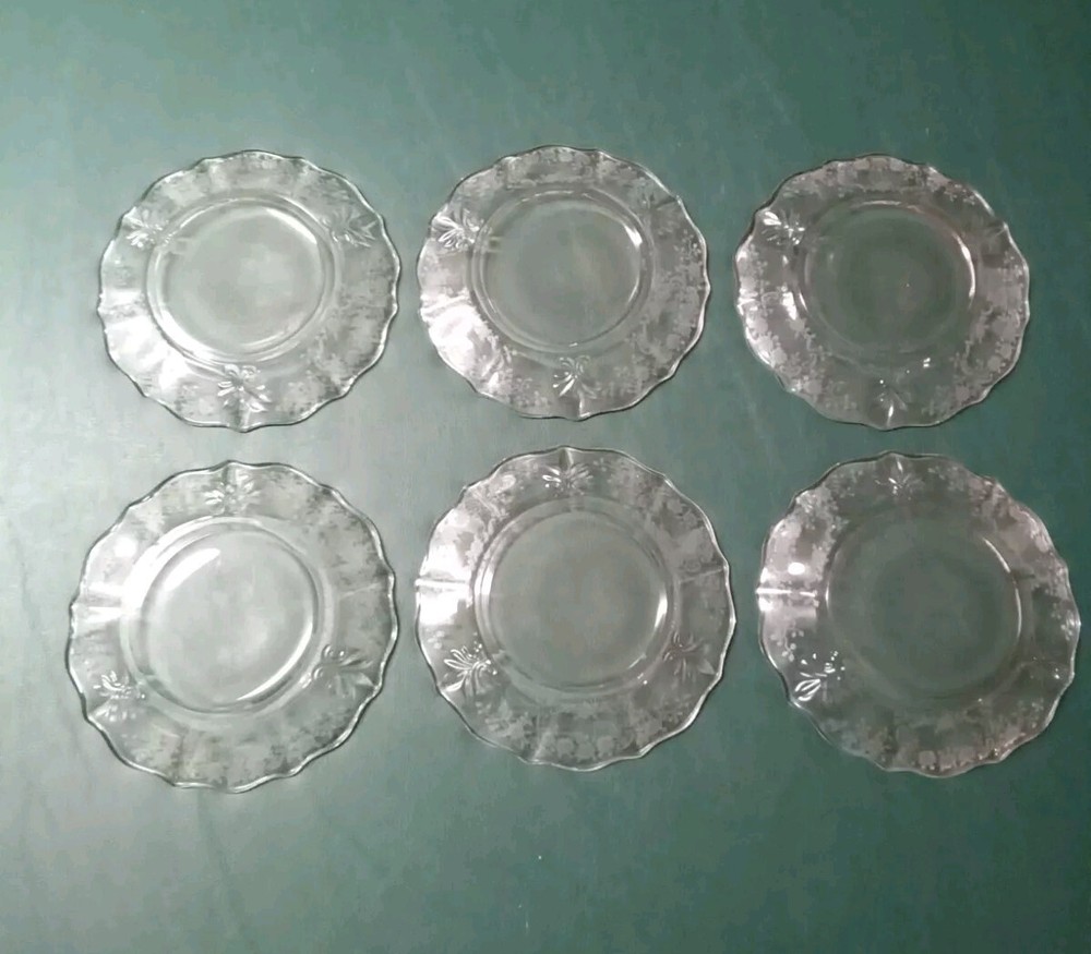 The Fostoria Meadow Rose 6" Dessert Bread Plates come in a set of 6 and are elegantly crafted from clear glass in the United States. These round bread and butter plates feature a delicate floral design, making them a charming addition to any table setting. Perfect for serving desserts or bread, these plates showcase the elegant glass production style that Fostoria is known for. These plates are in good used condition with no chips or cracks. See photos.