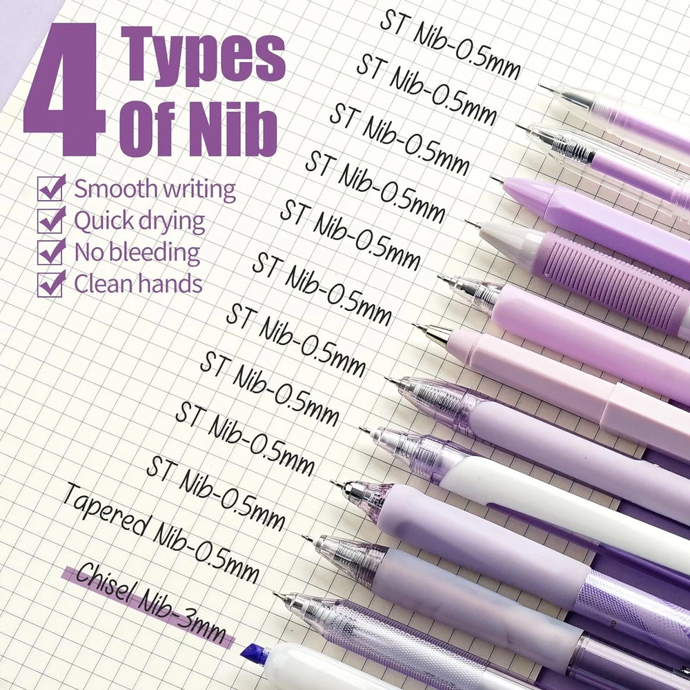 Four Candies 12Pack Pastel Gel Ink Pen Set, 11 1 Count (Pack of 12), Purple Product Details Manufacturer: Four Candies Brand: Four Candies Item Weight: 5.6 ounces Product Dimensions: 5.51 x 5.91 x 0.71 inches Item model number: FC-ZXB/12-ZI Color: Purple Closure: Retractable Grip Type: Rubber, Textured, Ergonomic Material Type: Plastic, Rubber Number of Items: 12 Size: 1 Count (Pack of 12) Point Type: Fine Line Size: 0.5mm Millimeters Ink Color: Black Manufacturer Part Number: FC-ZXB/12-ZI Brand: Four Candies Writing Instrument Form: Roller Ball Pen Color: Purple Ink Color: Black Age Range (Description): Adult, Teen Lovely Macaron Colors: The set contains 10 black gel pens, 1 purple ink pen and 1 highlighter, they come in cute macaron colors and different styles, provides you multiple grips and different writing experiences Various Nibs: The gel pen set offers different nibs: ST nib, bullet nib, CS tapered nib, 3 mm wide nib for highlighter, fine spring structure built into the nib, which makes ink output stable and writing easier and smooth Premium Quick-Drying Ink: The black ink pen uses premium gel quick-drying ink which dries quickly to keep the paper clean and no ink leakage, the large-capacity ink provides you with long-lasting writing time; Each nib is sealed with wax to prevent the ink from drying out Portable Pen Clip: Each cute pen comes with a different style of clip to easily fasten it to a notebook or pocket, easy to carry and prevent loss Wide Application: Aesthetic gel pen set with highlighter of the same color, suitable for taking notes, marking key points, writing a diary, doing handbooks or painting, etc; Pens in every color are vibrant and make an ideal back-to-school gift for girls, students, kids