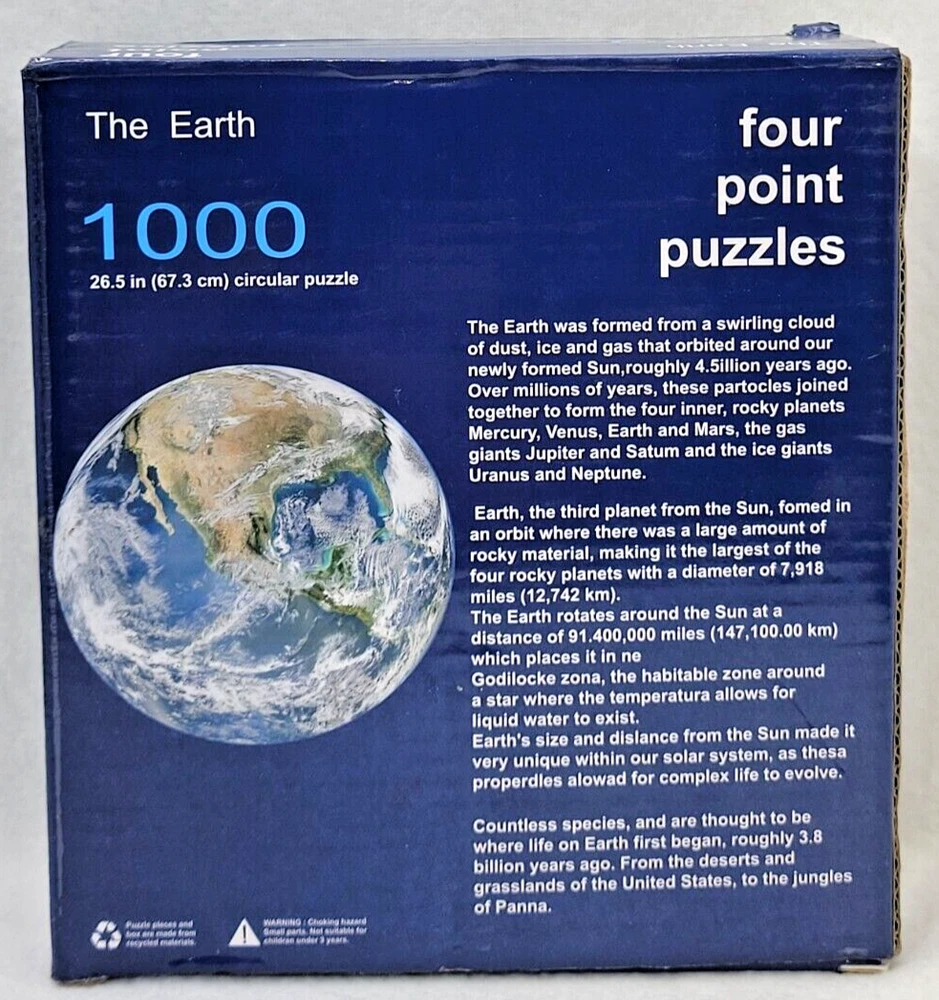 Get lost in space with this fascinating1000 piece jigsaw puzzle. Featuring a wonderful view of planet Earth, this puzzle is perfect for any puzzle enthusiast looking for a challenge. Made from sturdy cardboard, the puzzle pieces are sure to hold up to many hours of fun. This puzzle is perfect for anyone who loves space and wants to add a unique piece to their collection. And for added convenience, the puzzle also comes with a numbered reference poster to help guide you through the process. Get ready to blast off into a world of fun with this Four Point Puzzles jigsaw puzzle. Doing puzzles has some hidden benefits . Excellent qualities : Cultivate concentration, patience, and temper your will Movement development : Train hand-eye coordination and precise small movements Spatial intelligence : Improve visual discrimination of colors and shapes Critical thinking ability : Understand the relationship between parts and the whole, and draw inferences from one example to explore the future Relaxes your mind : Relieve work pressure and release yourself Brain development : Enhance memory and may help prevent or slow brain degeneration We did not work the puzzle or count the pieces, but we verify the number count at your request. Each item we ship is carefully packaged to prevent any damage and is shipped immediately with tracking.